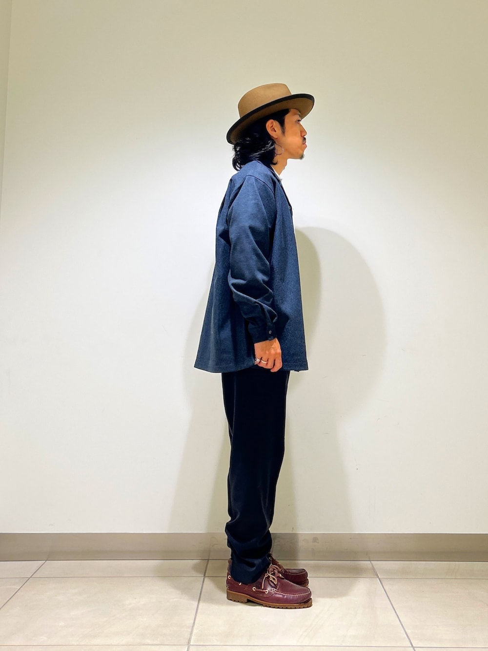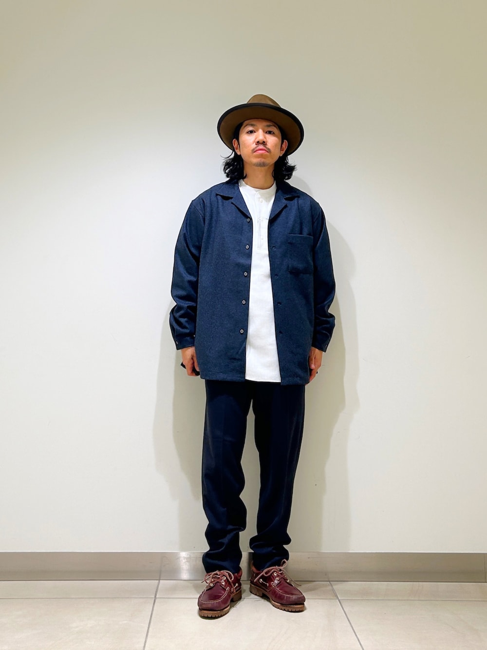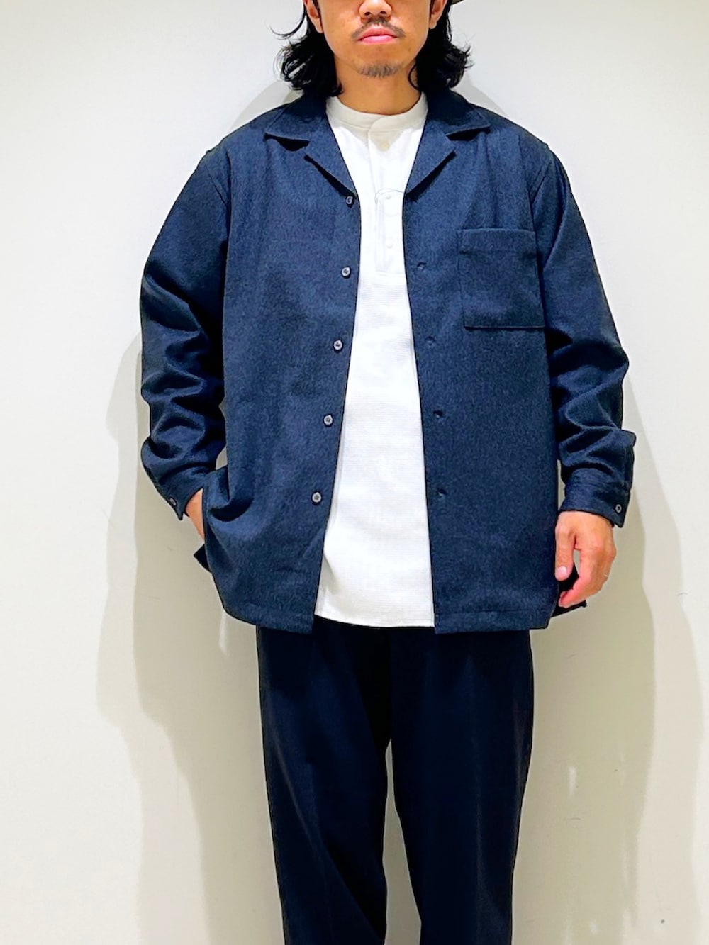 首元が開くオープンカラーシャツにはヘンリーネックでアクセントを。