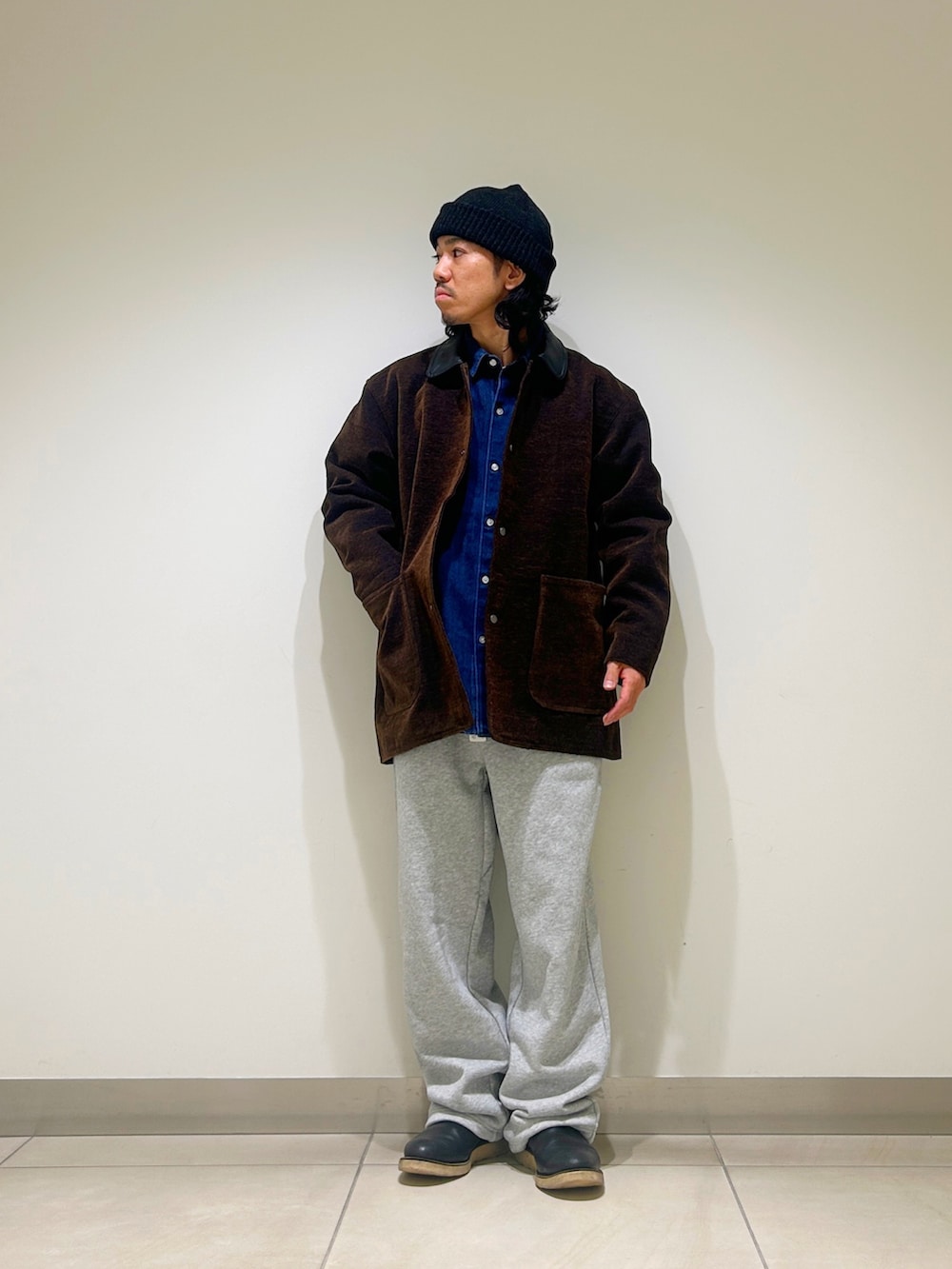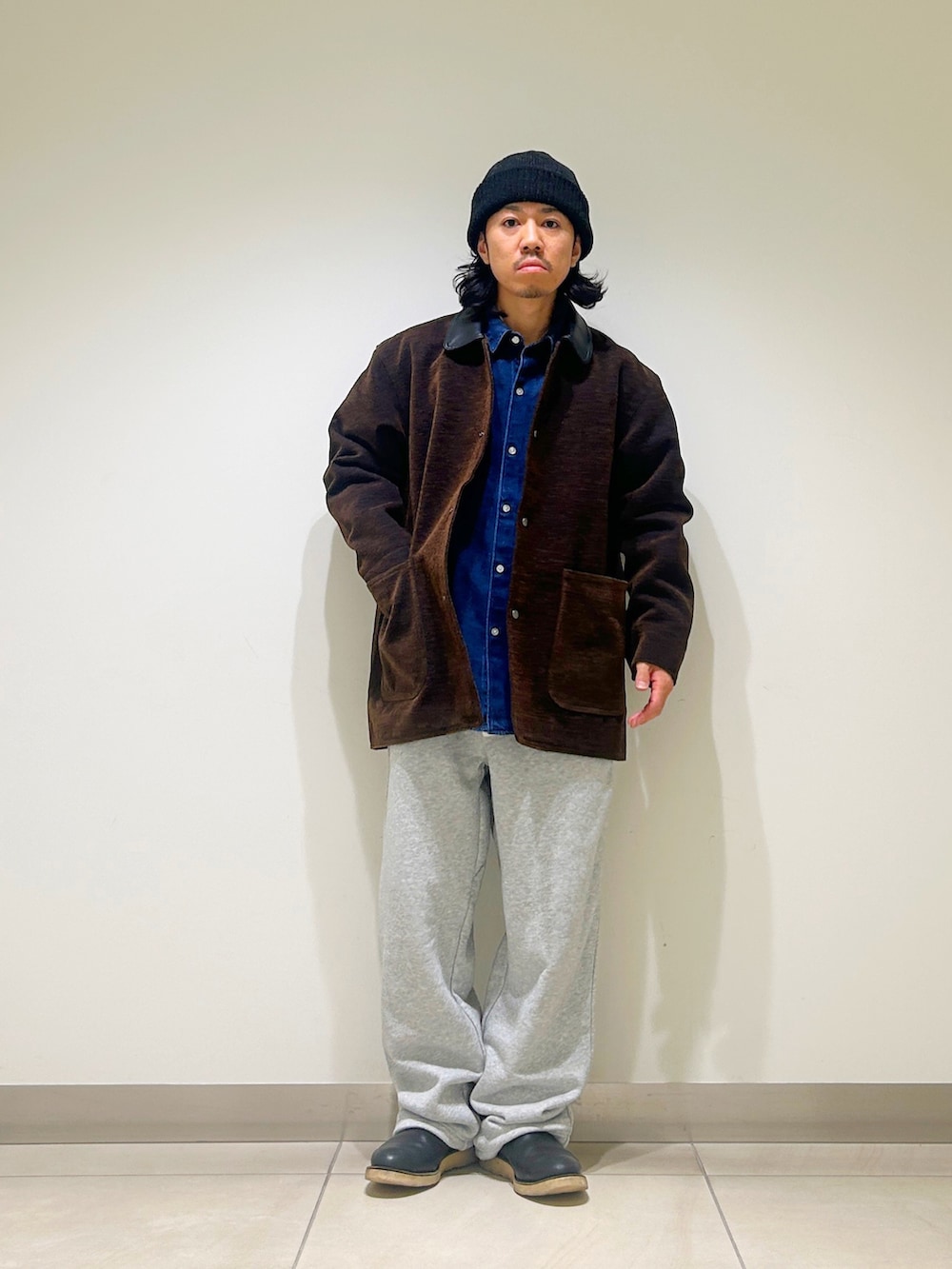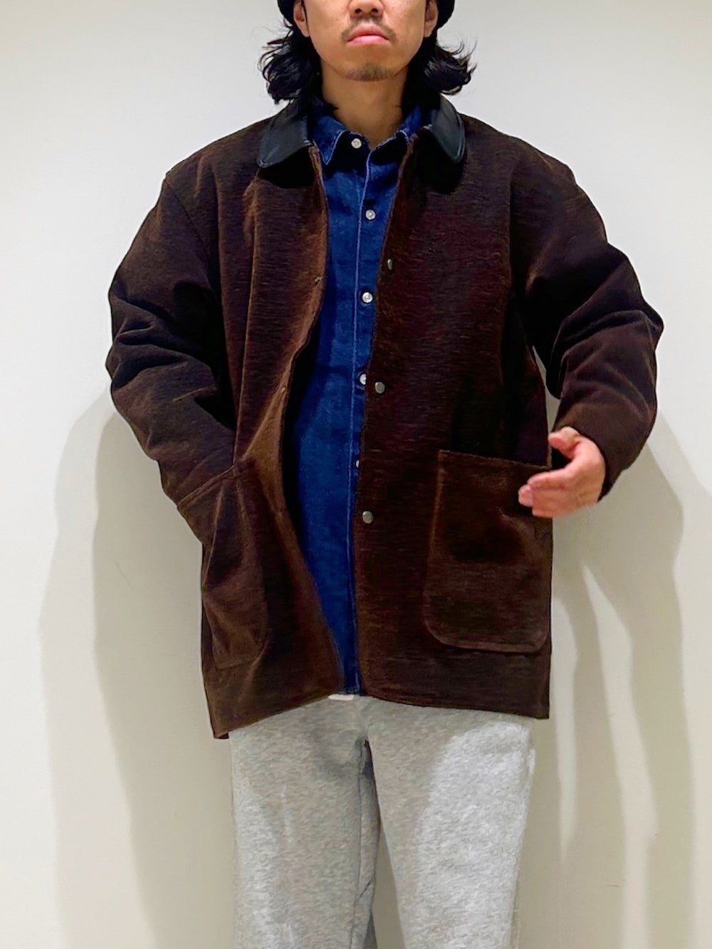 襟部分は合成皮革をあしらい、ワークジャケットらしいタフさを残しつつも、カジュアル過ぎない上品な仕上がりに。