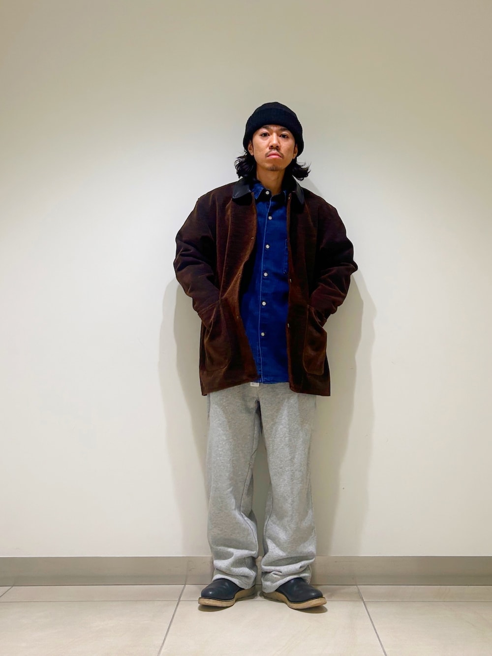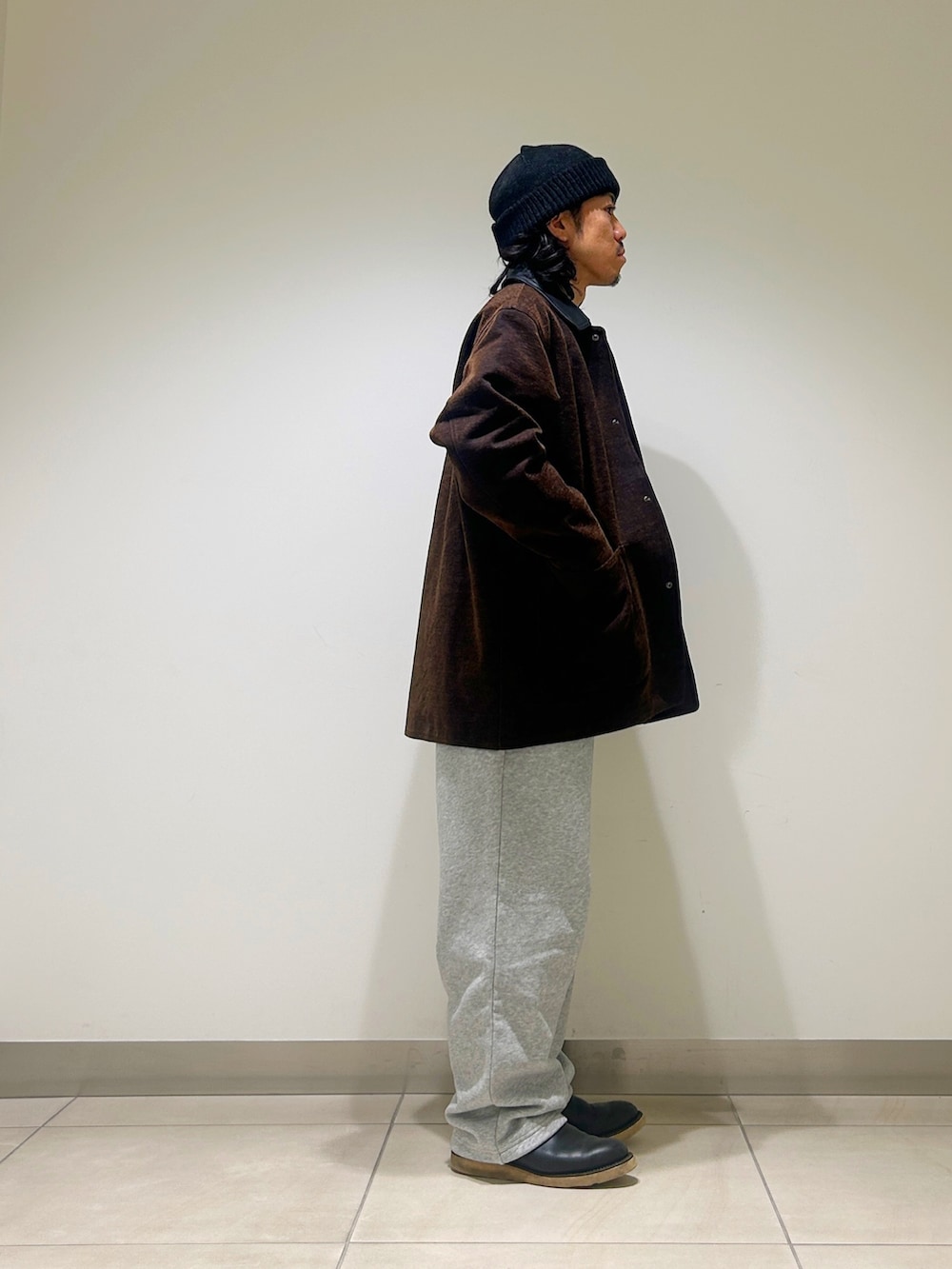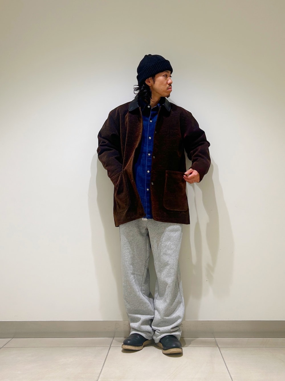 襟部分は合成皮革をあしらい、ワークジャケットらしいタフさを残しつつも、カジュアル過ぎない上品な仕上がりに。