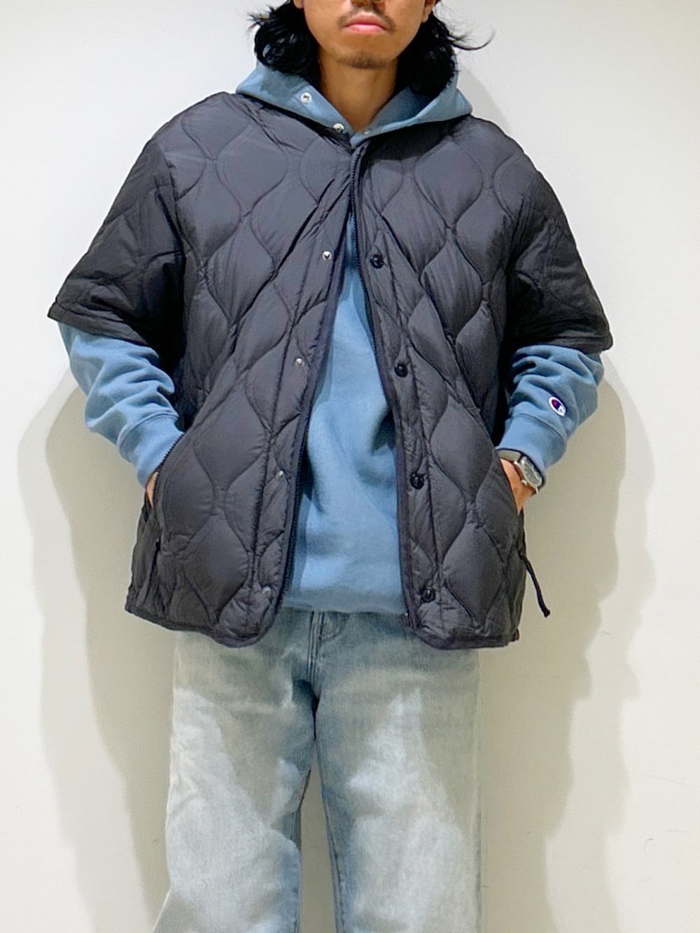 ・左袖口だけのロゴワッペンとハの字ポケットでソリッドな印象になり他のアイテムとも合わせやすいデザインに。