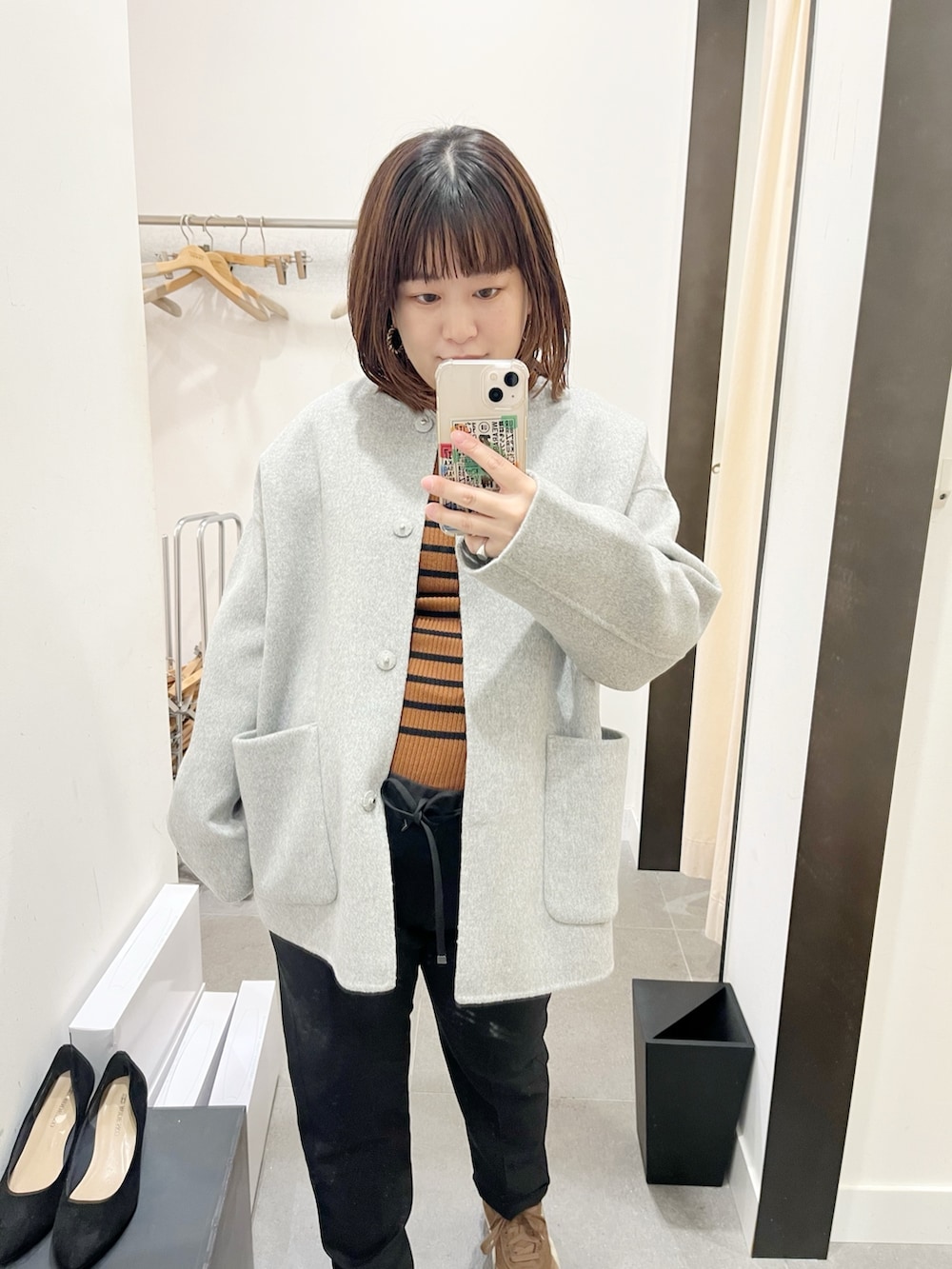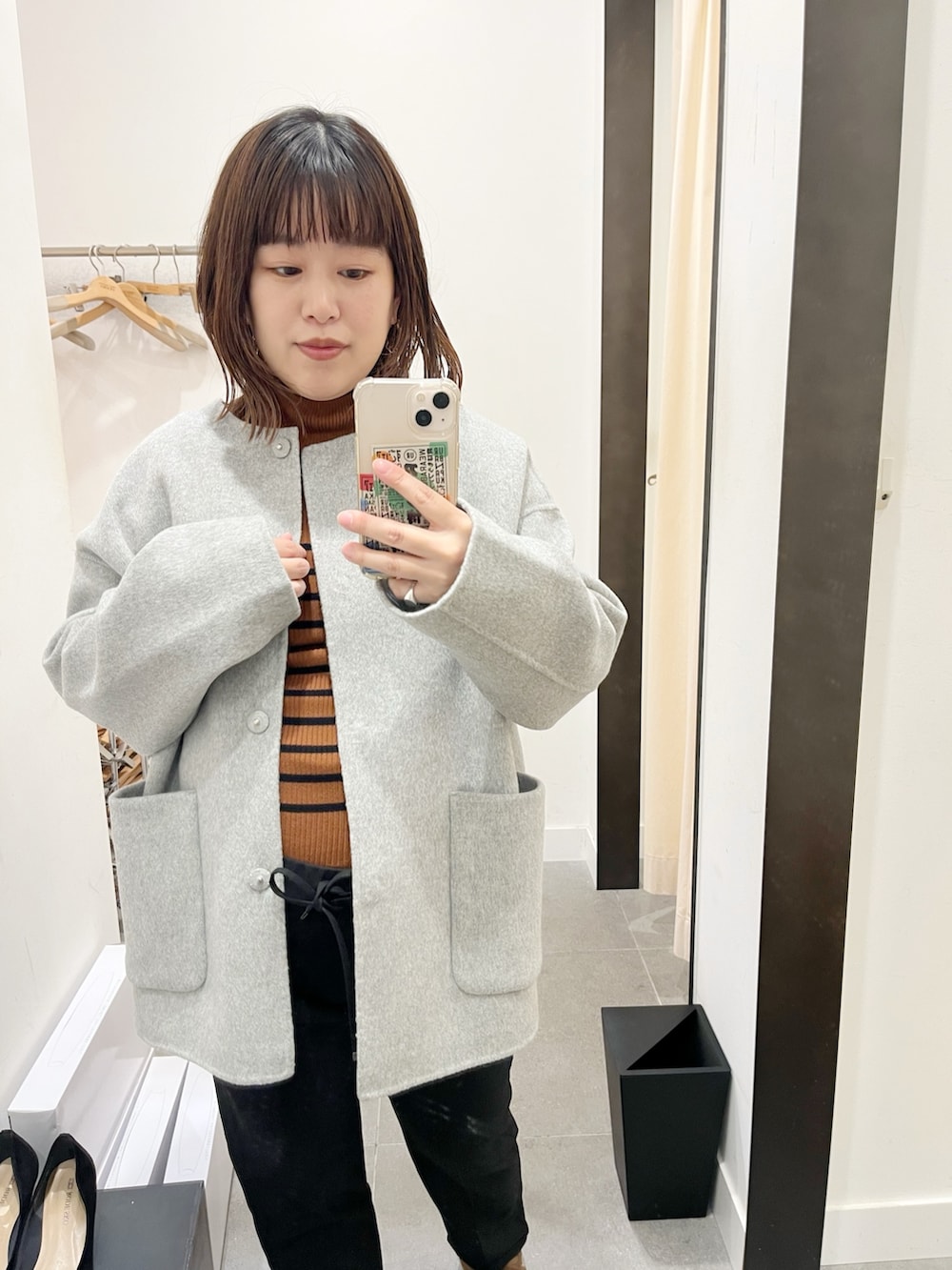ハイネックに合わせたり、マフラーを巻いたり、顔周りの着回し力がとても高いです☆
