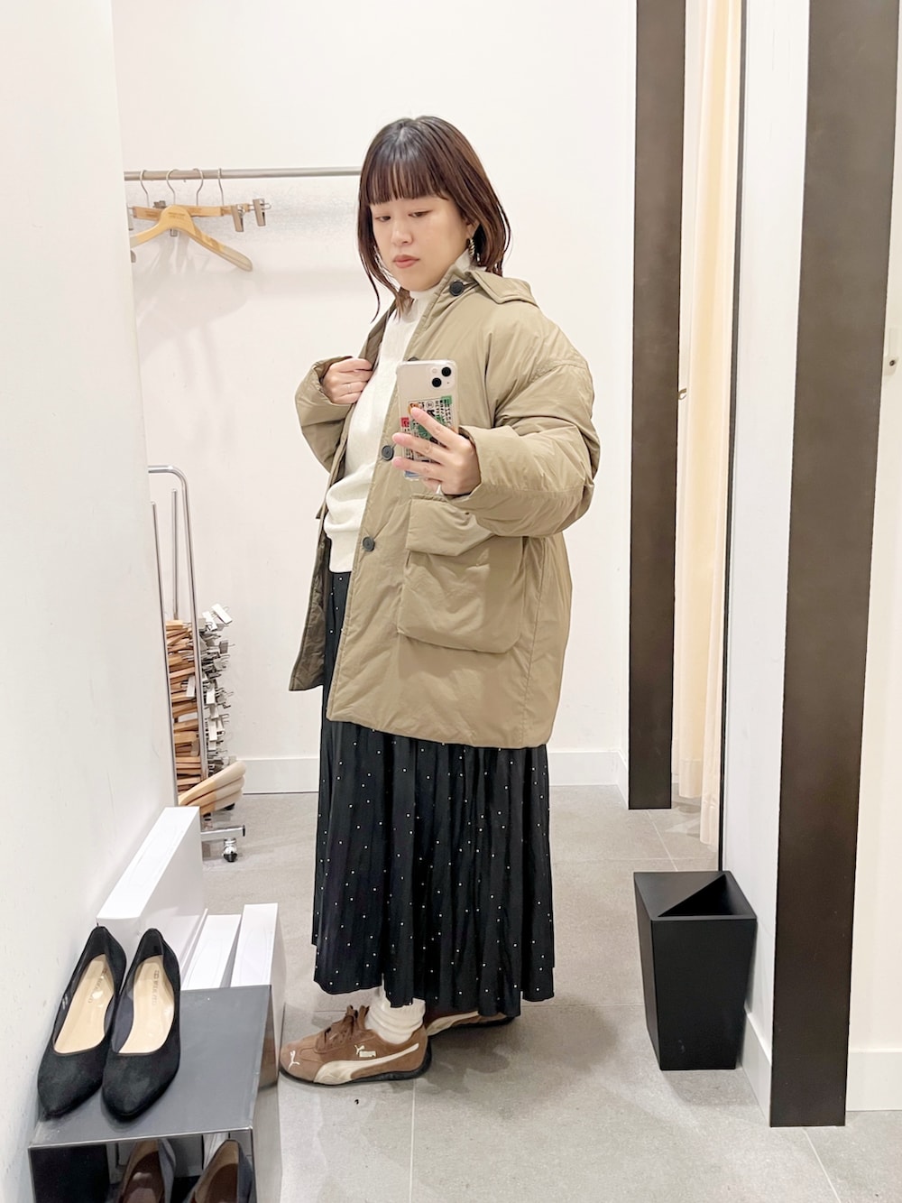 ドット柄のスカートで女性らしいコーディネートにしてみました。
