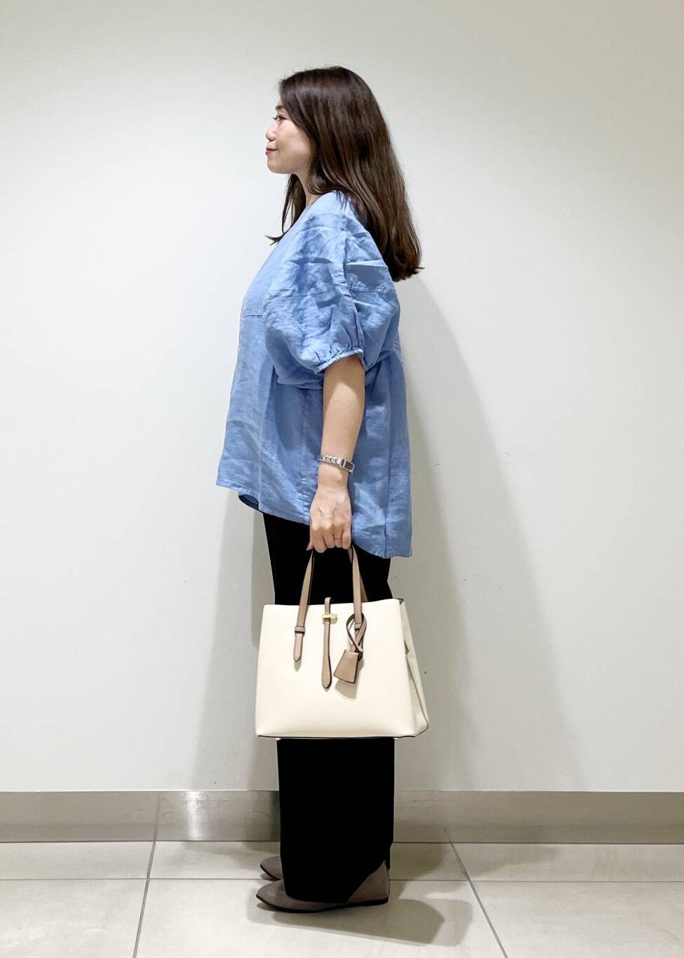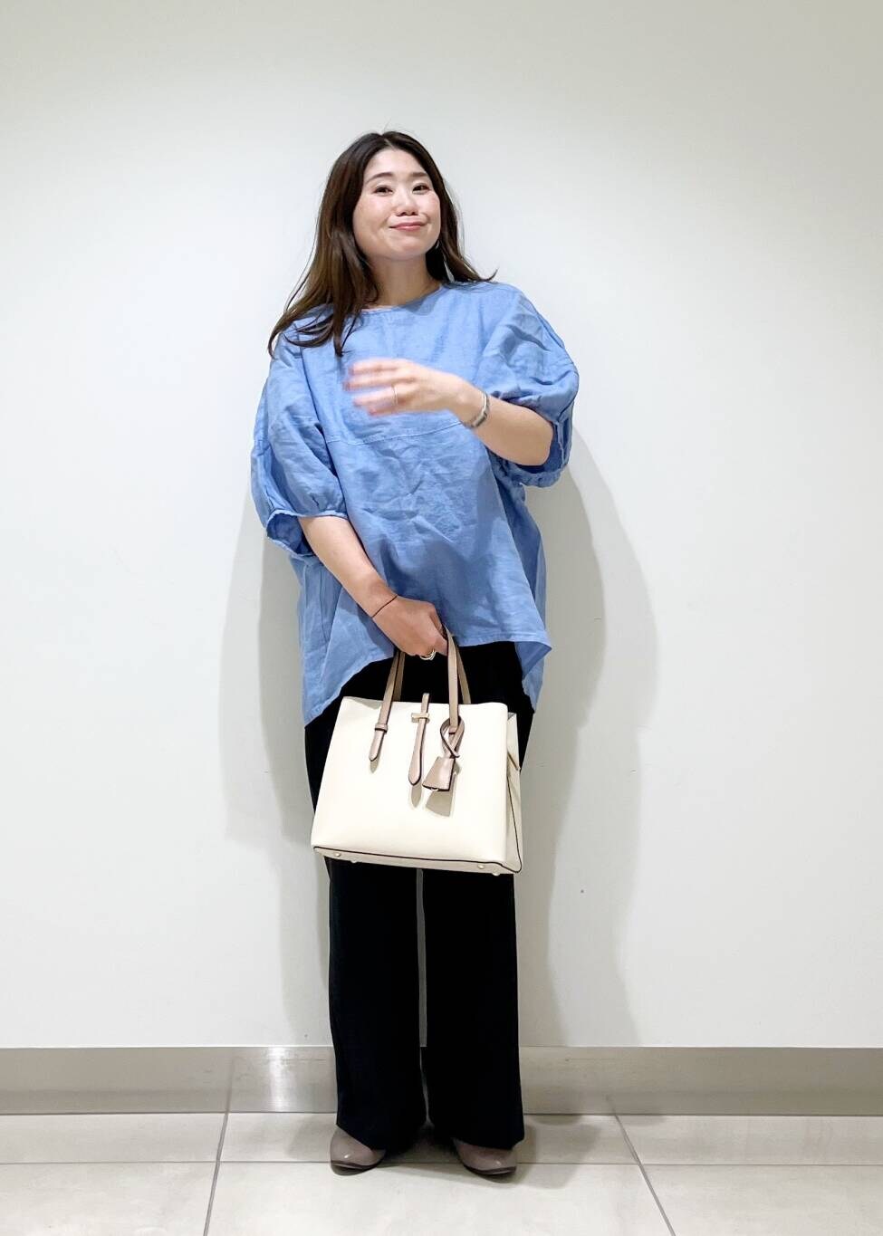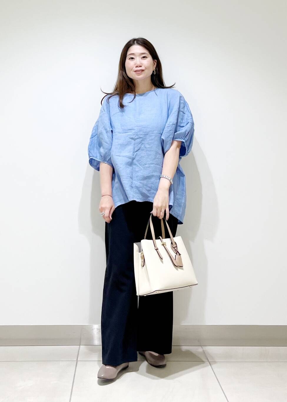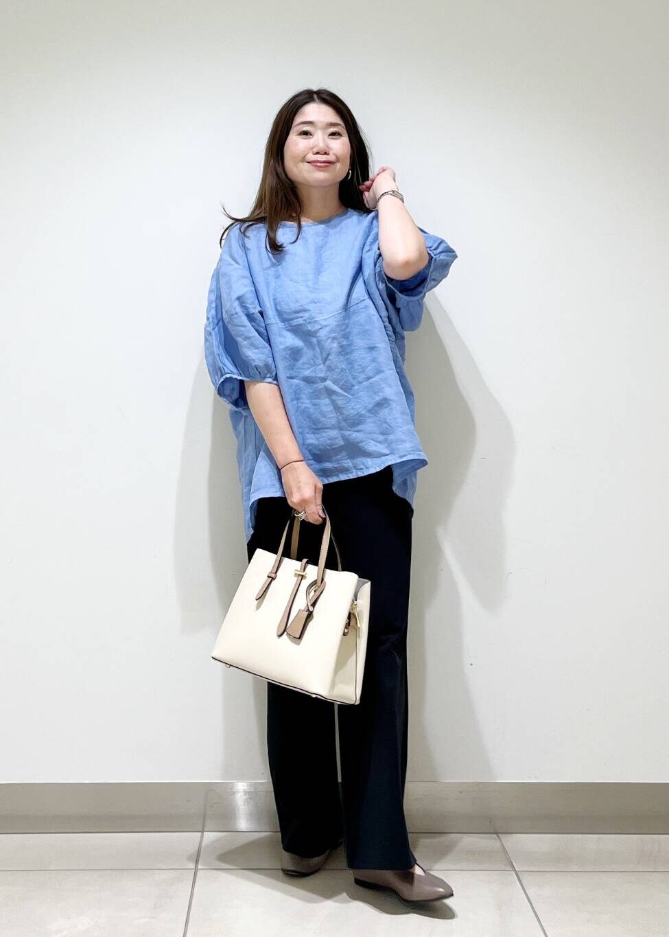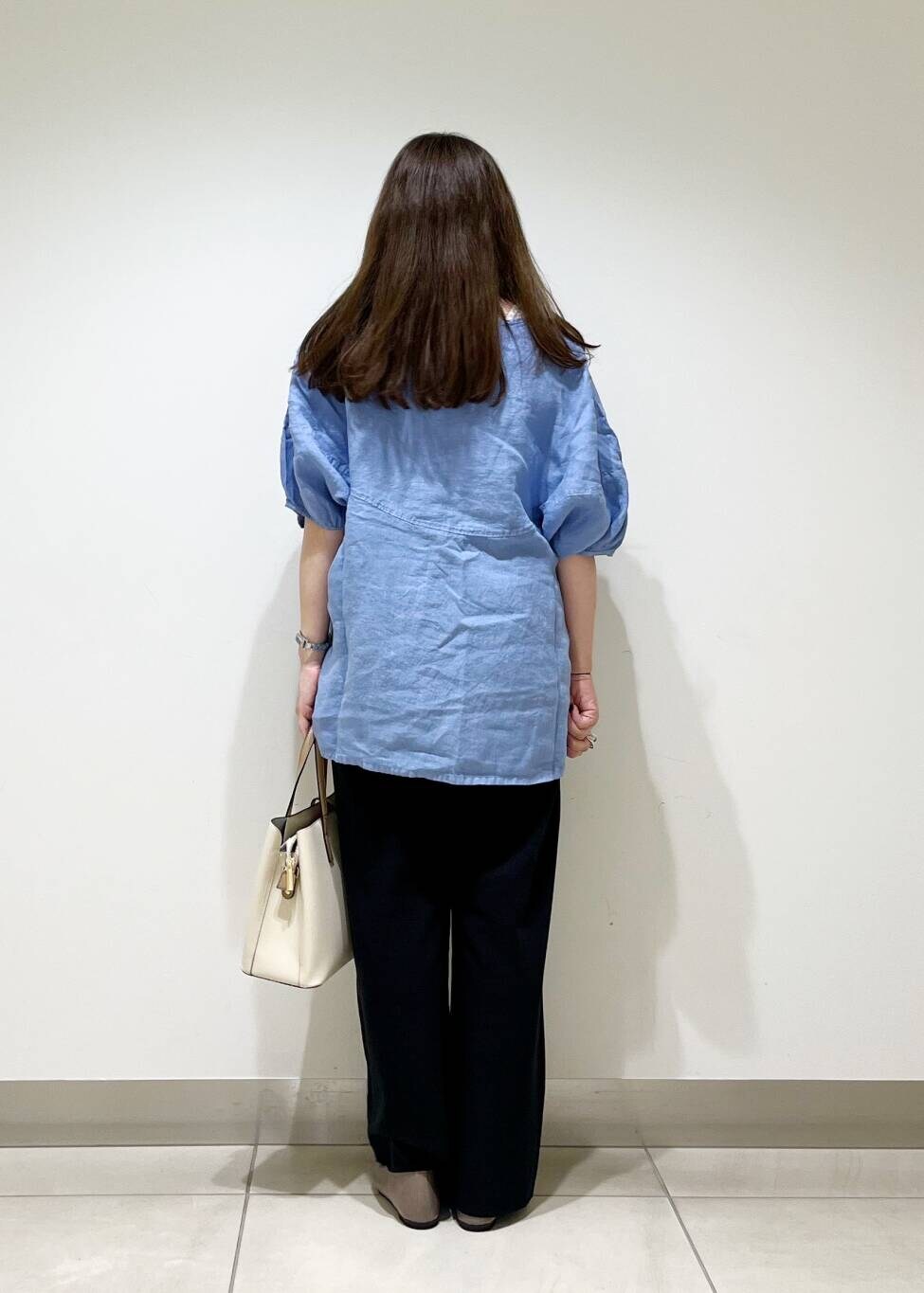 夏物ブラウスも黒系のシックなパンツ合わせをしたら、晩夏にもピッタリスタイリングです☆