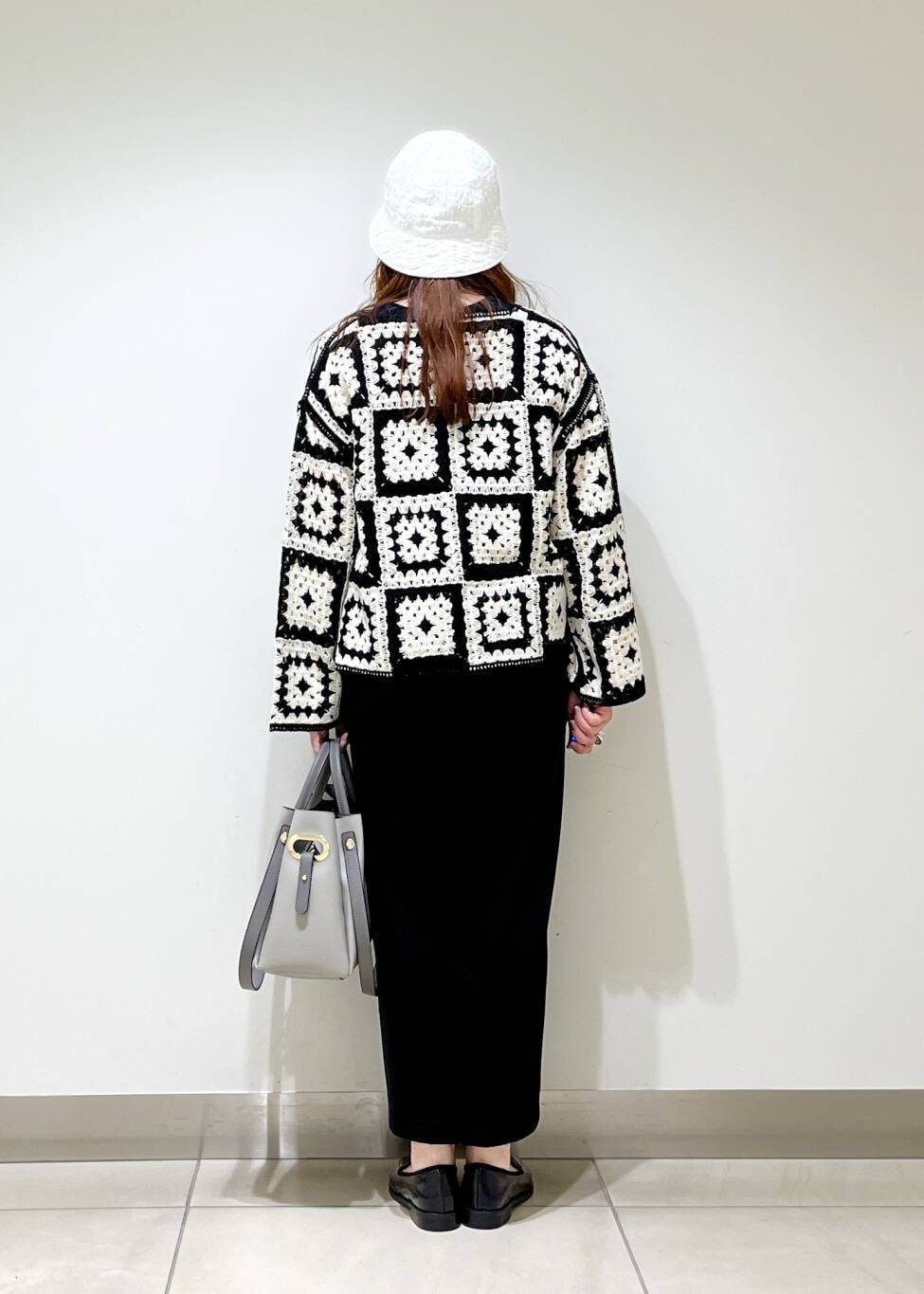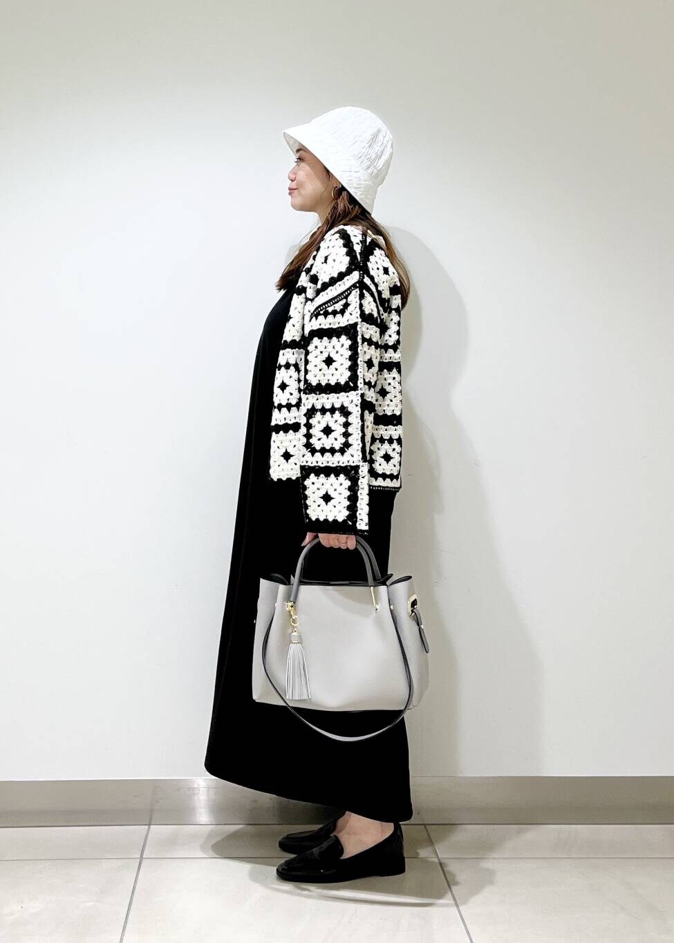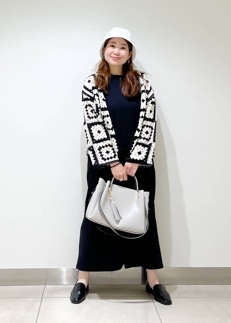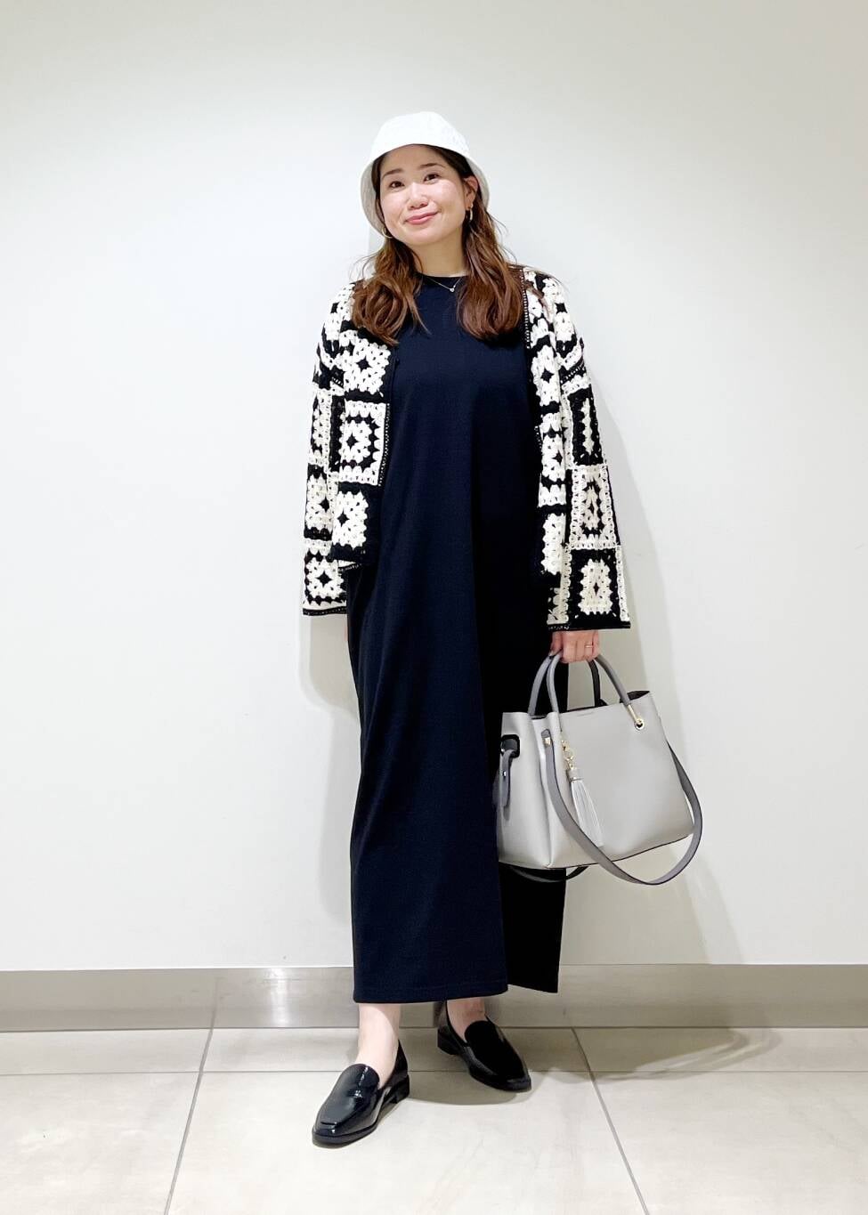 シックなブラックワンピースには、パッチワークカーディガンを合わせるだけで印象がガラリと変わるのでオススメです☆