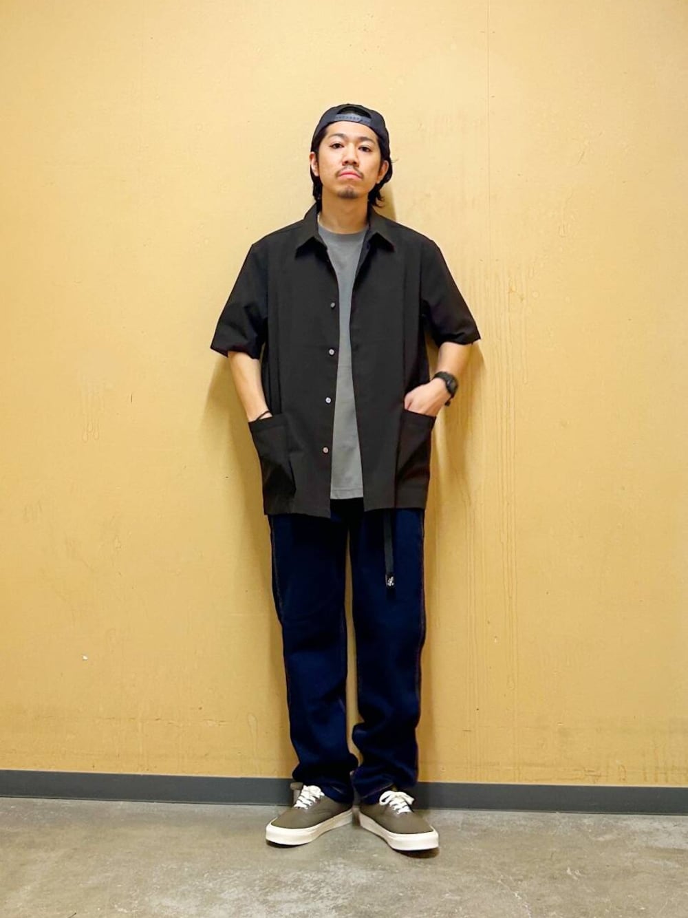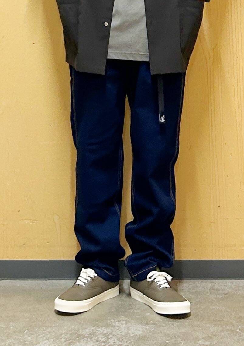 今回はドライリュクスレギュラーカラーシャツとグラミチ別注デニムパンツを使用したコーディネート。