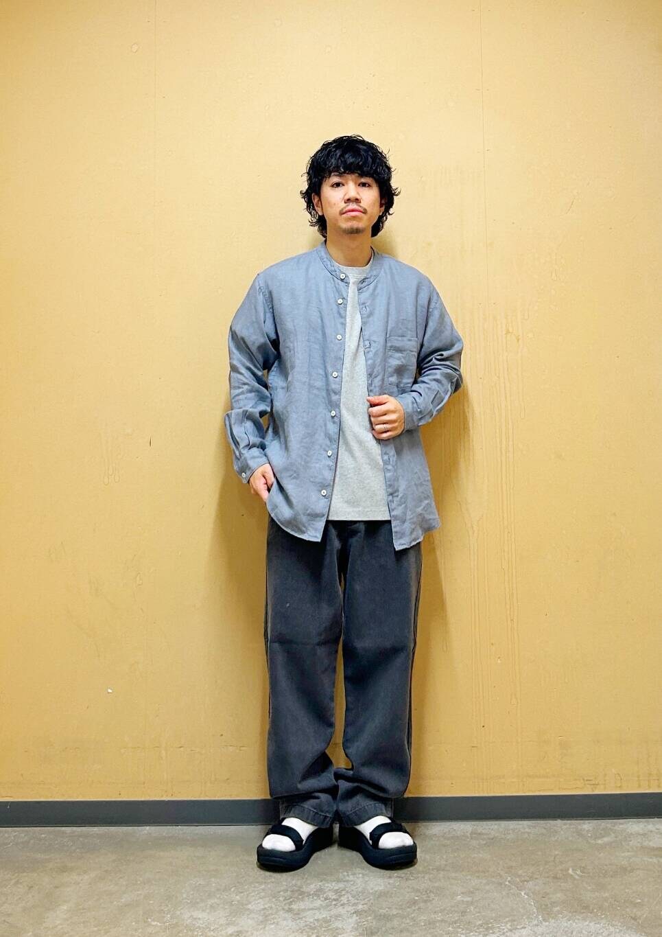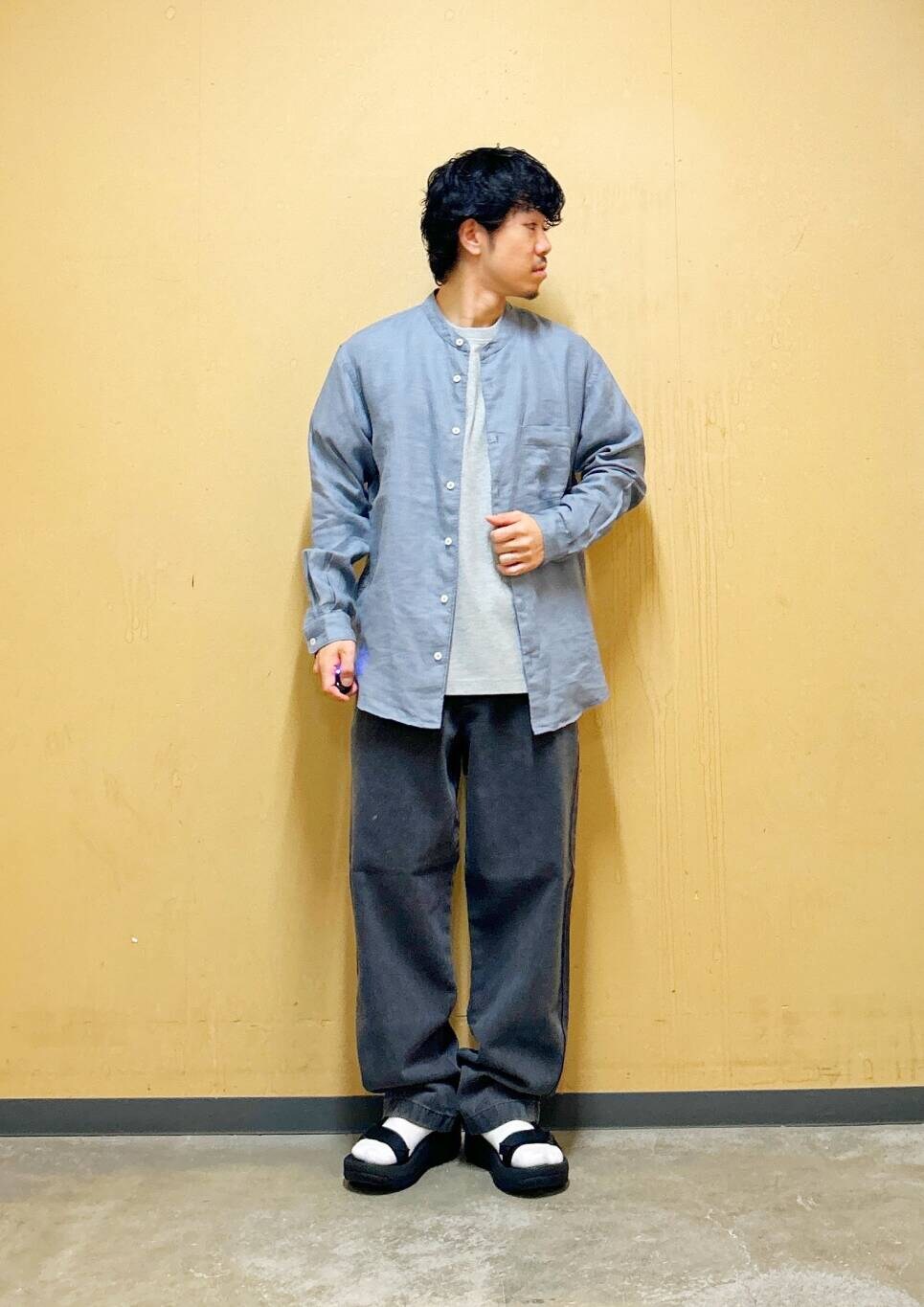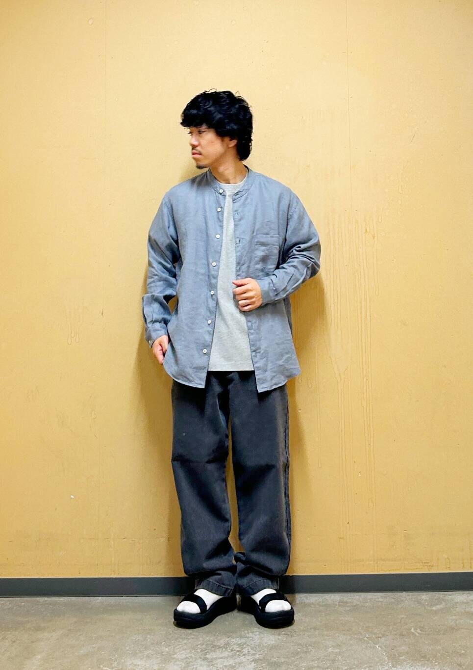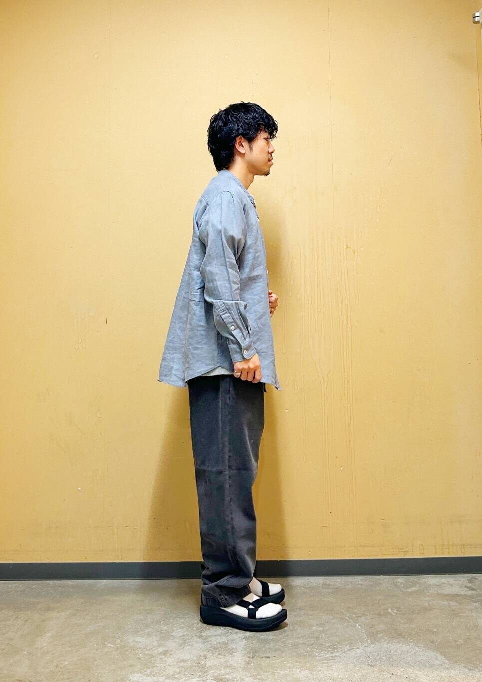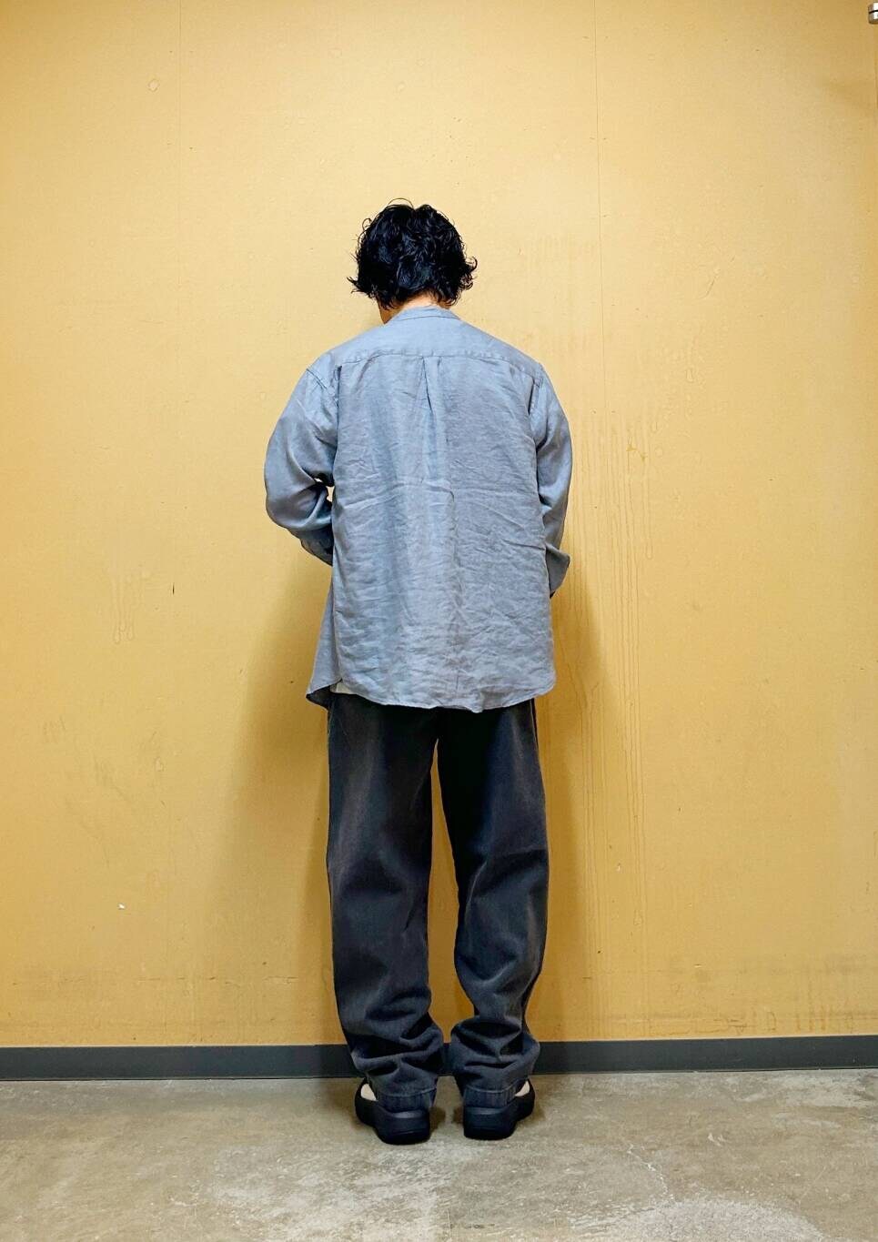 今回はシルケットリネンバンドカラーシャツとデニムトラウザーを使用したコーディネート。