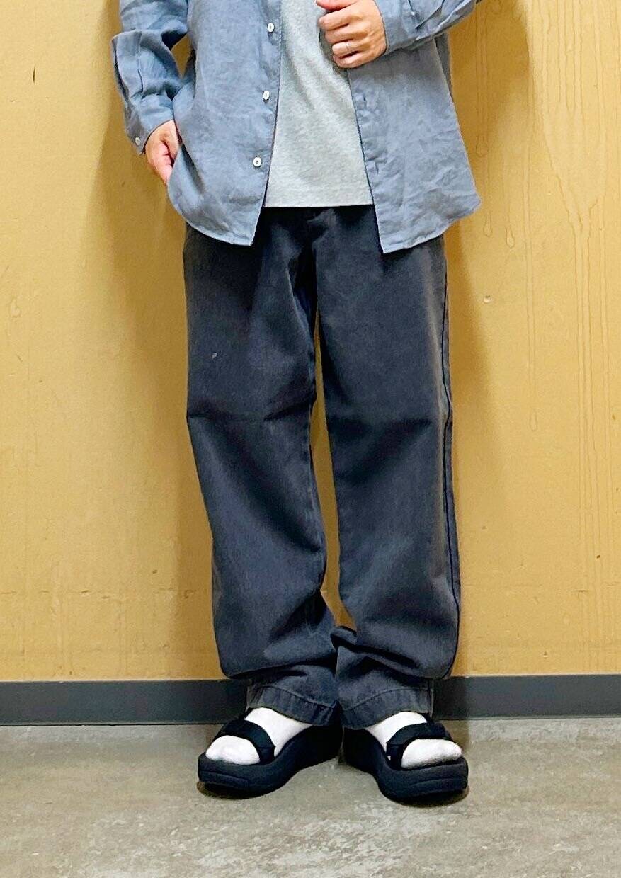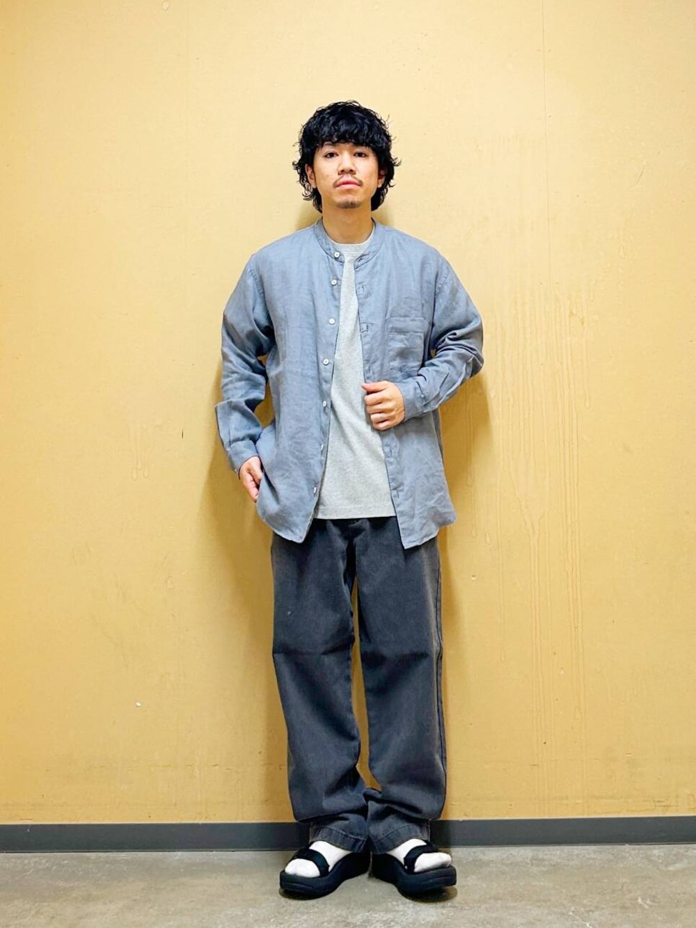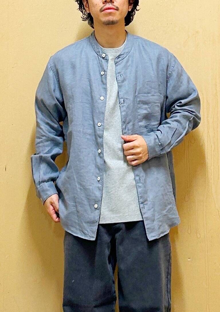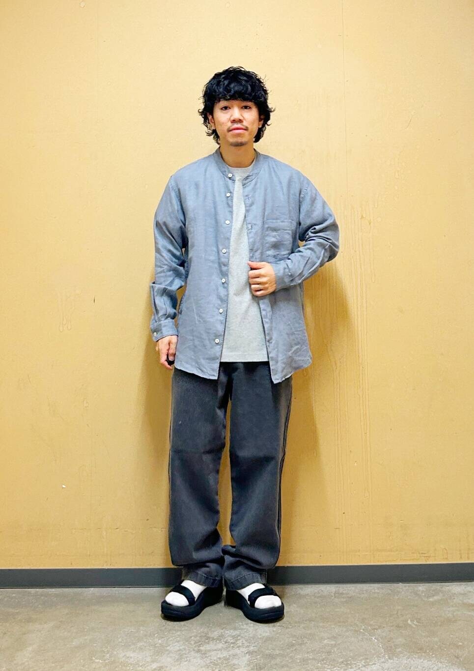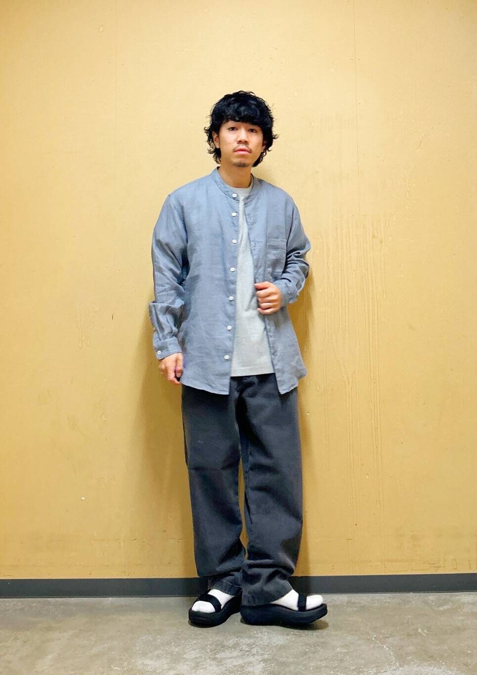 今回はシルケットリネンバンドカラーシャツとデニムトラウザーを使用したコーディネート。