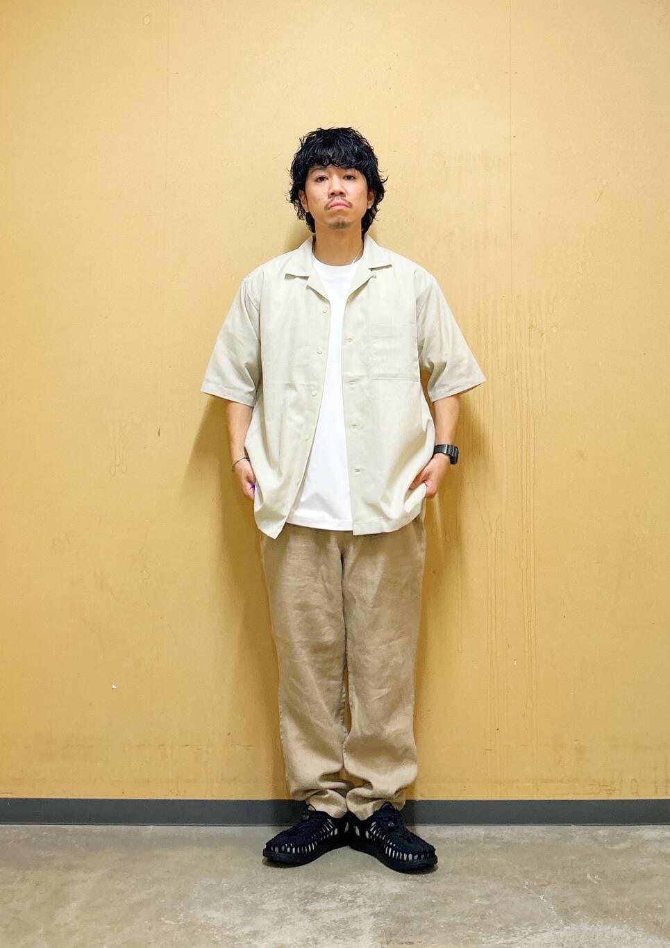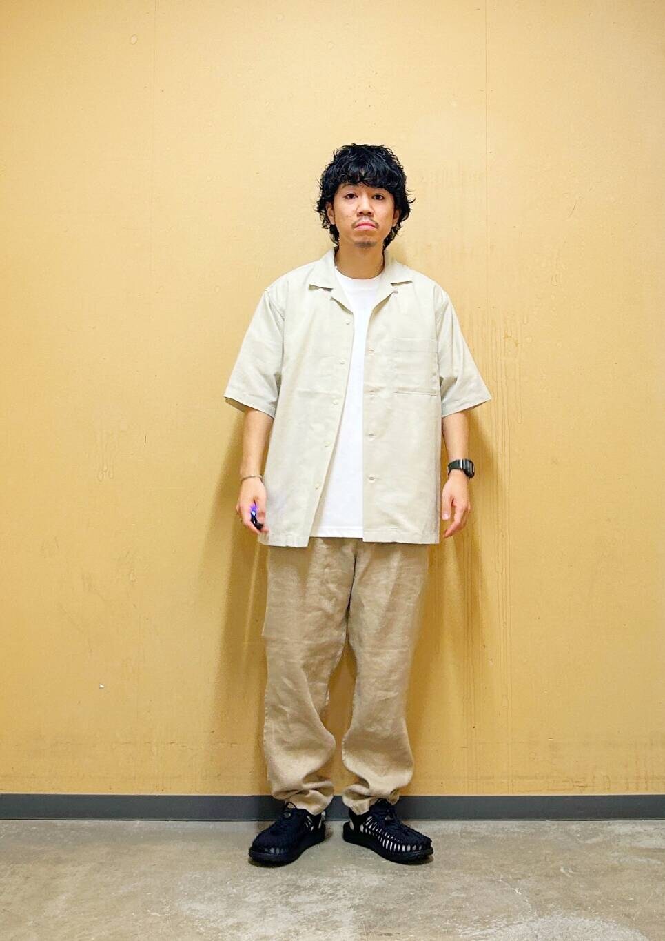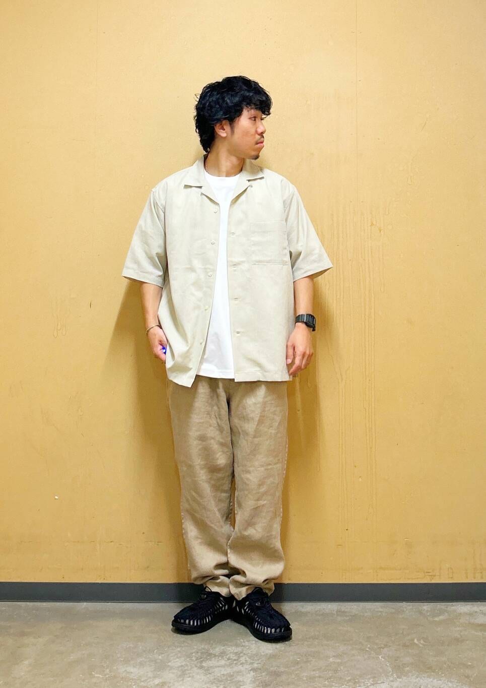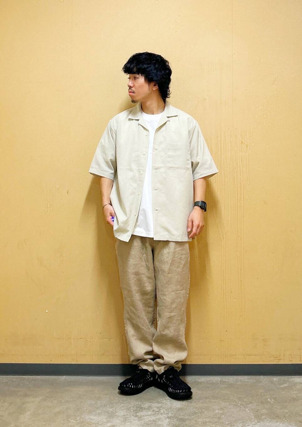 今回はリネンオープンカラーシャツとリネントラウザーを使用したコーディネート。