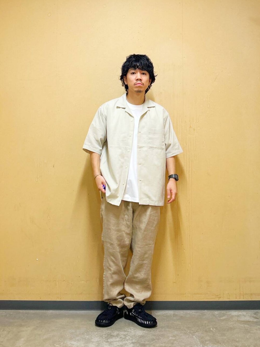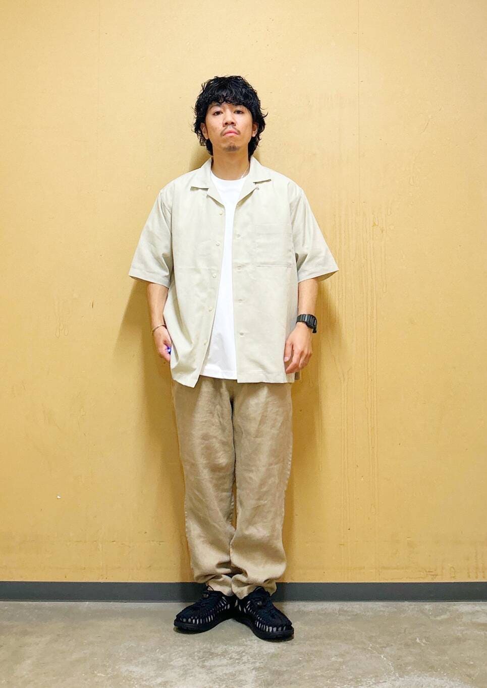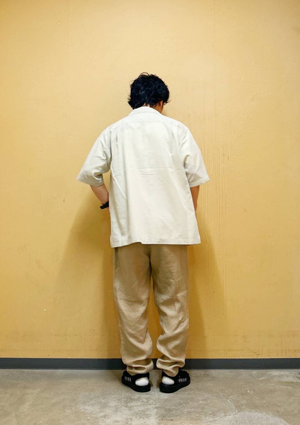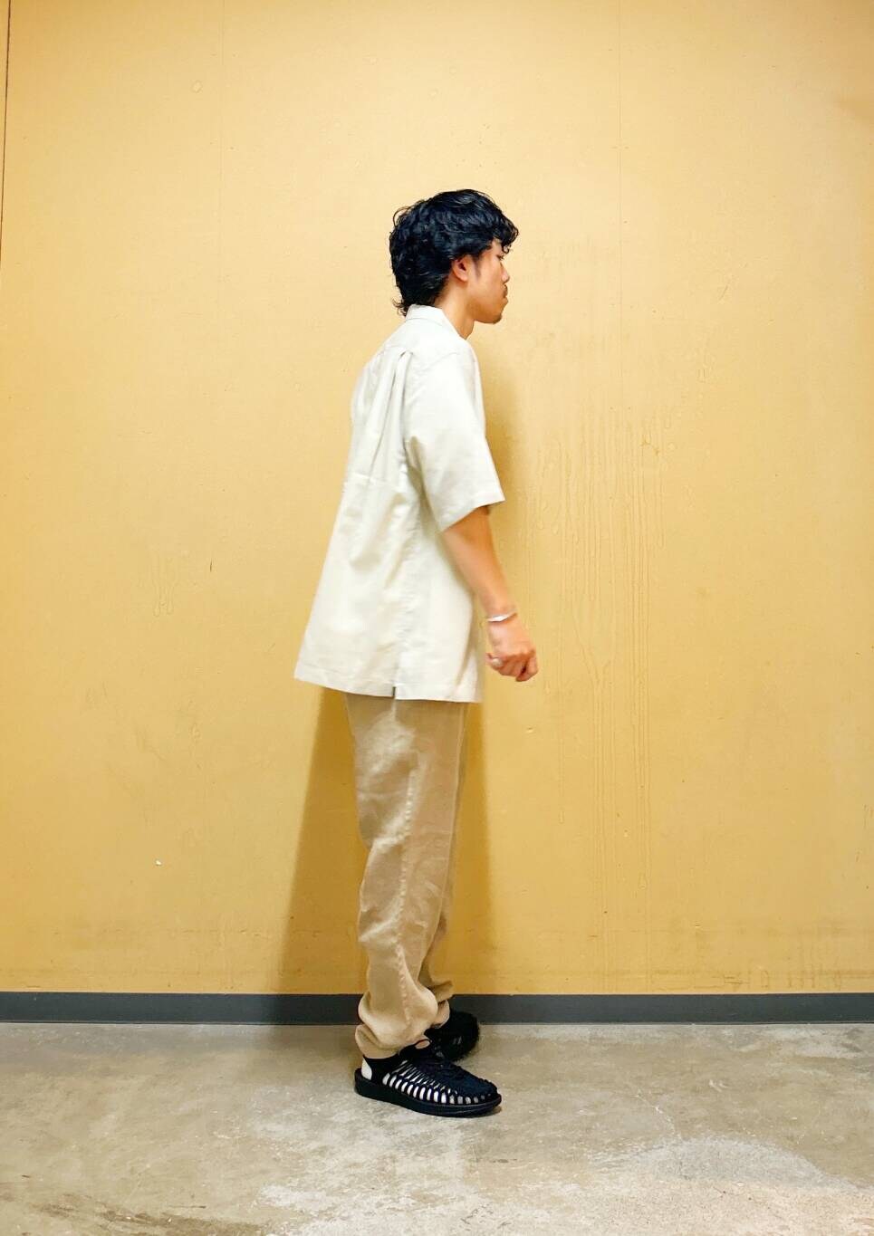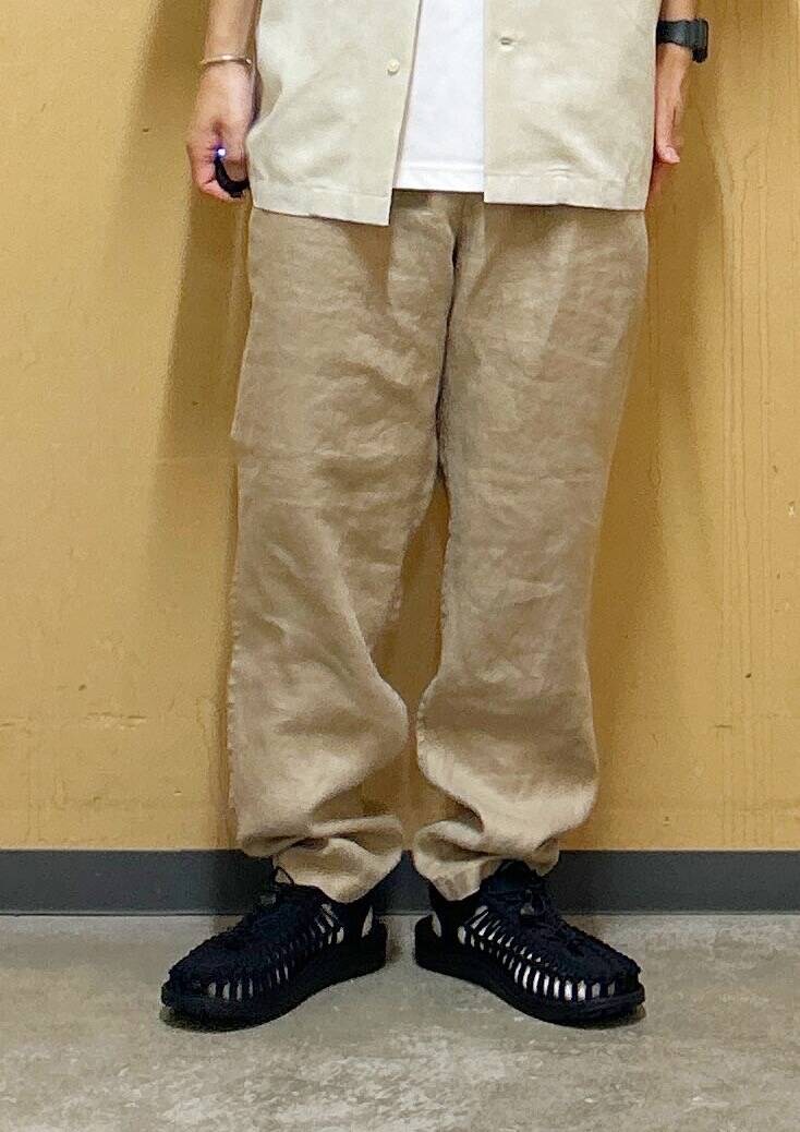 今回はリネンオープンカラーシャツとリネントラウザーを使用したコーディネート。