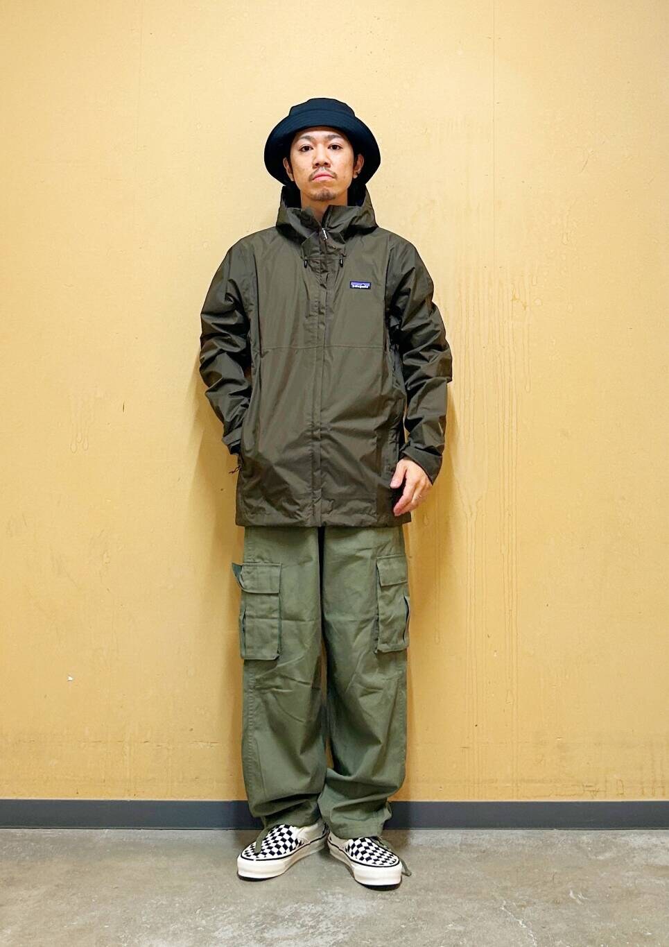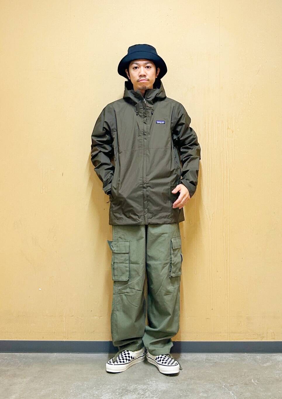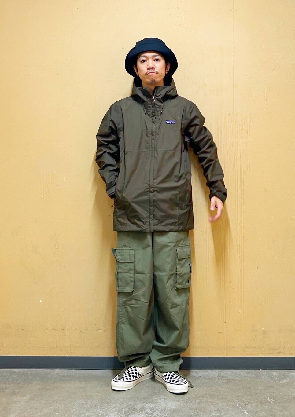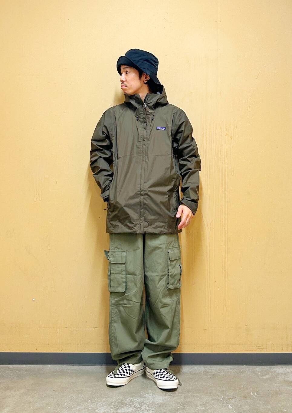 今回はpatagonia Torrentshell 3L Rain Jacketとカーゴパンツを使用したコーディネート。