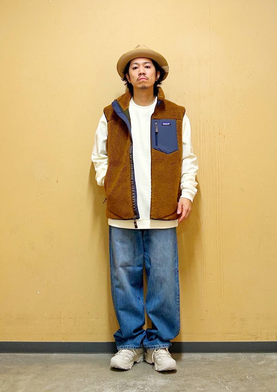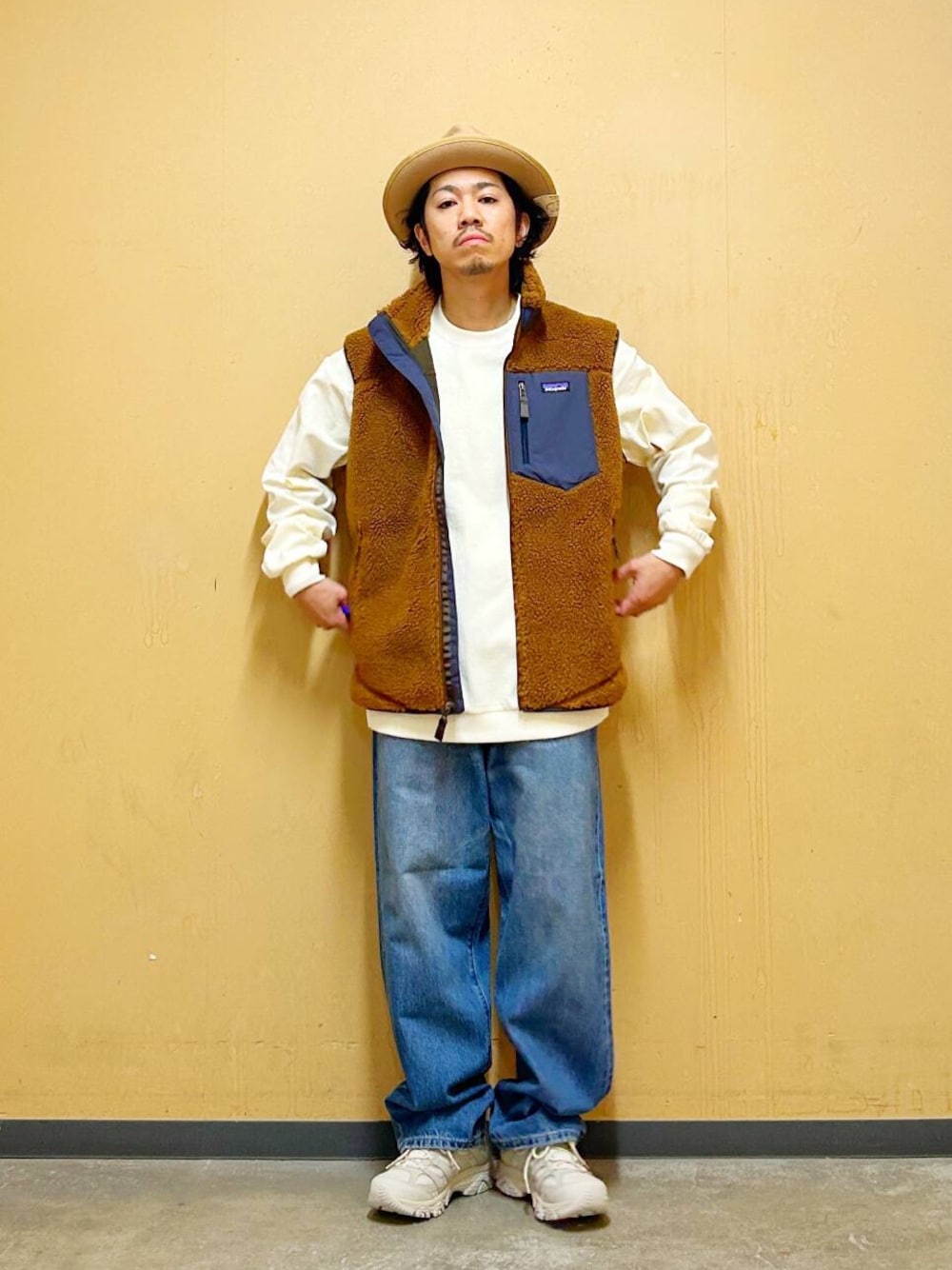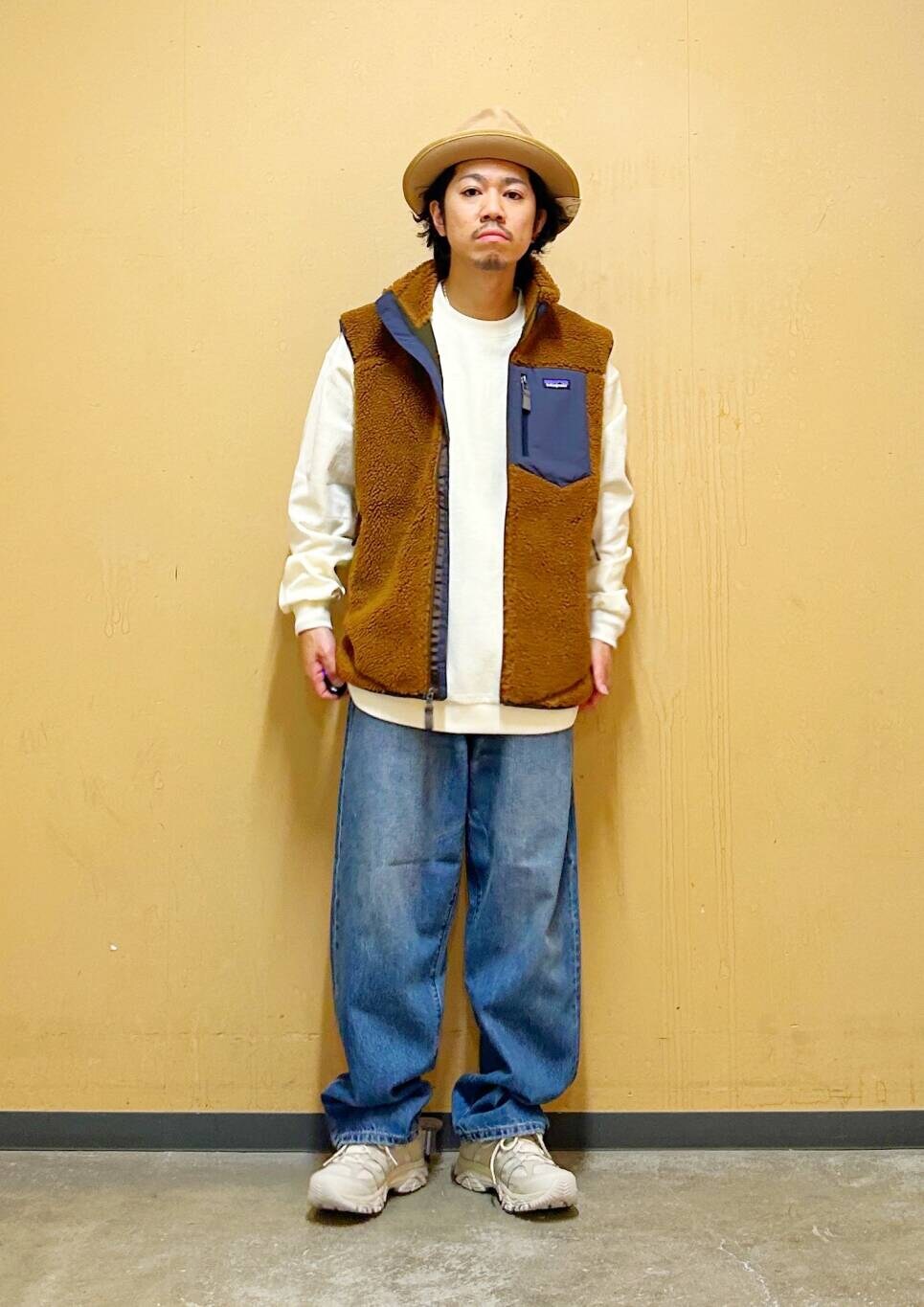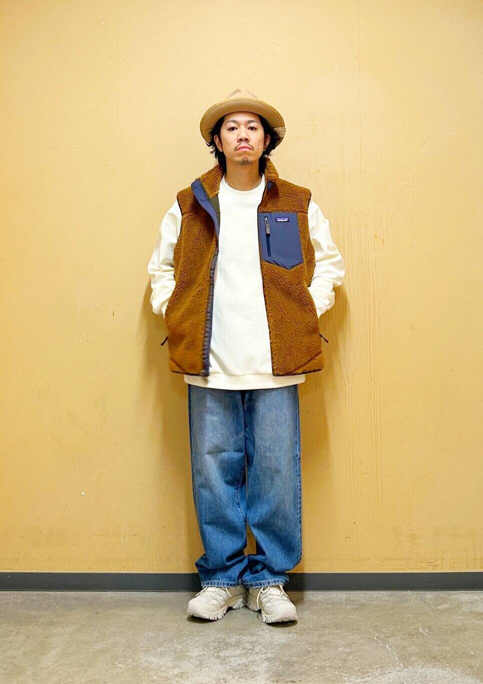 今回はpatagonia Ms Classic Retro-X Vestとデニムパンツを使用したコーディネート。