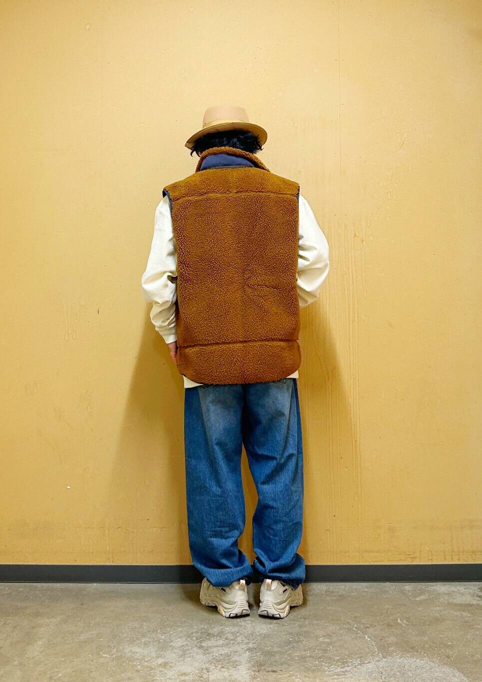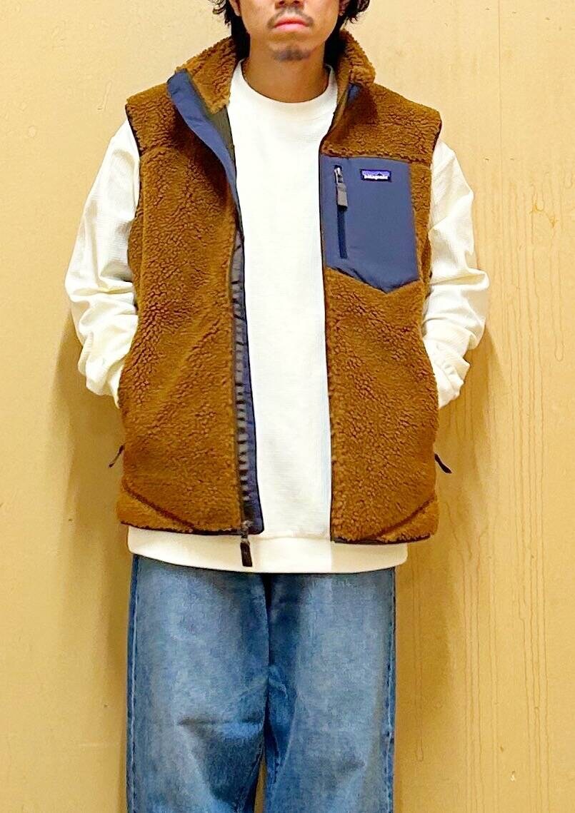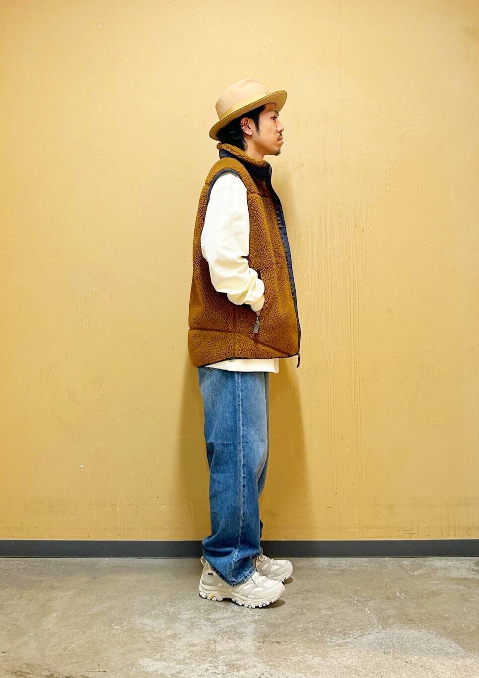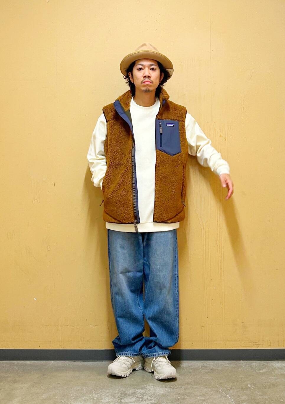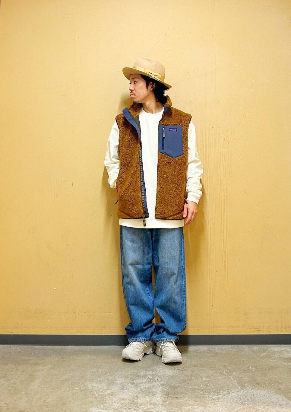 今回はpatagonia Ms Classic Retro-X Vestとデニムパンツを使用したコーディネート。