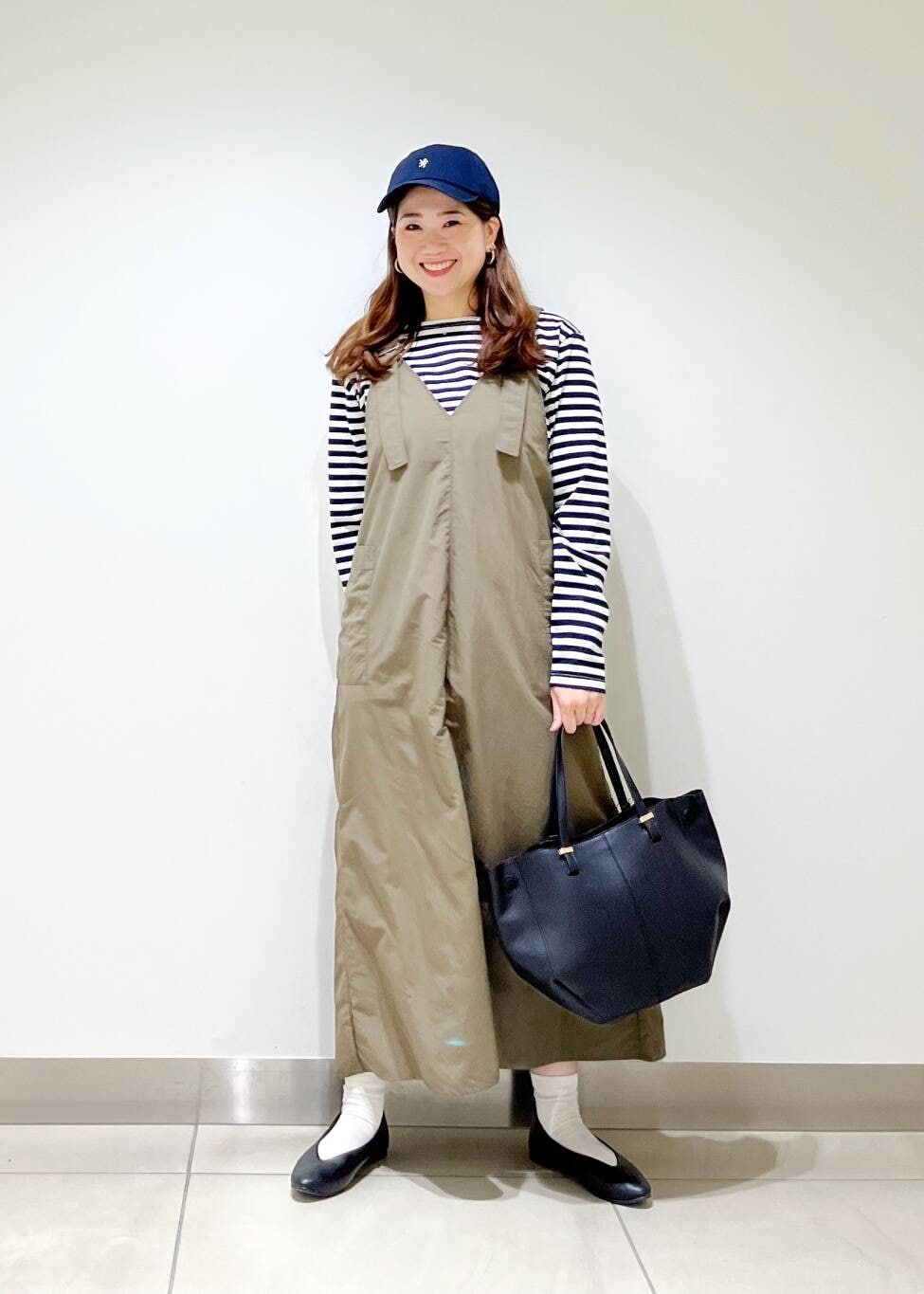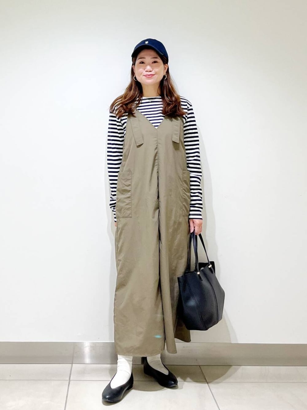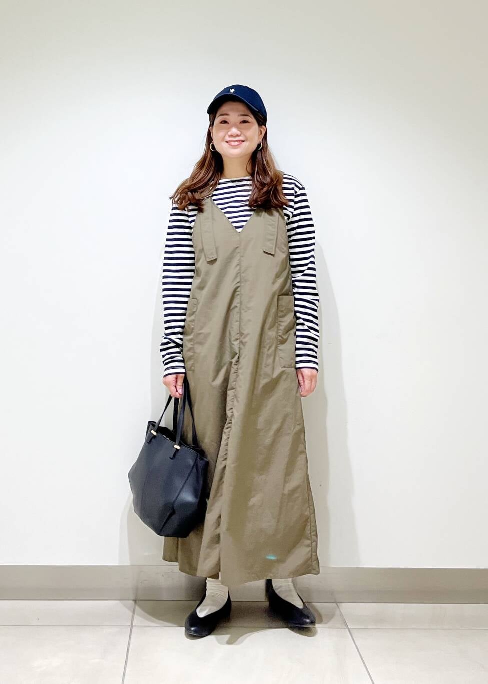 Vネックのシルエットがとてもスッキリと見えてオシャレなジャンパーワンピースです〜!ボーダーを合わせてカジュアルコーデにしました☆