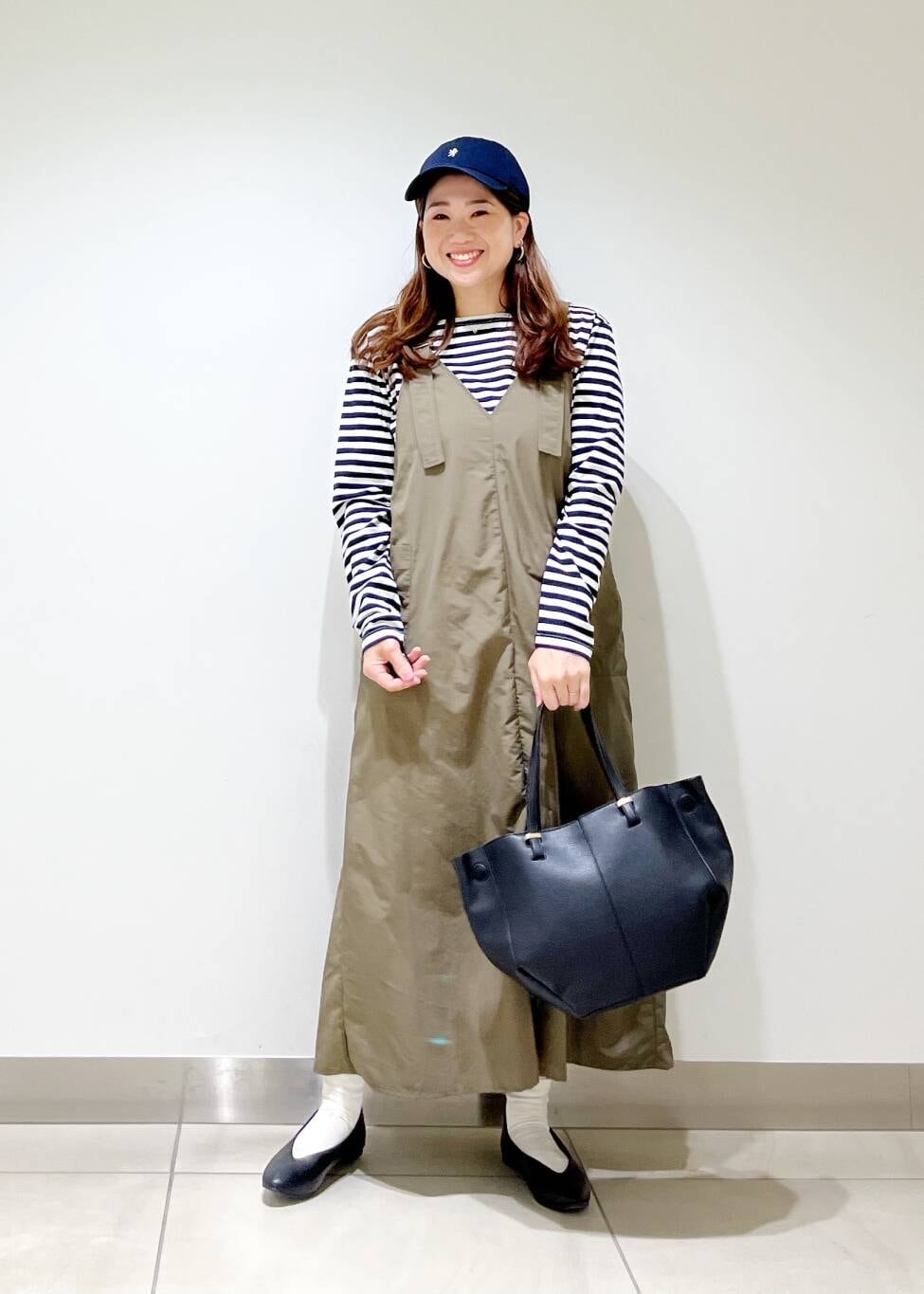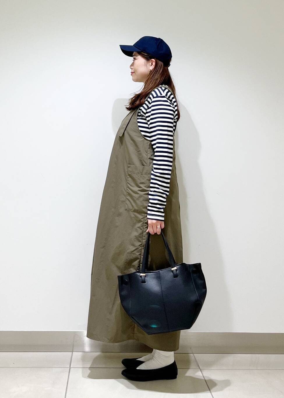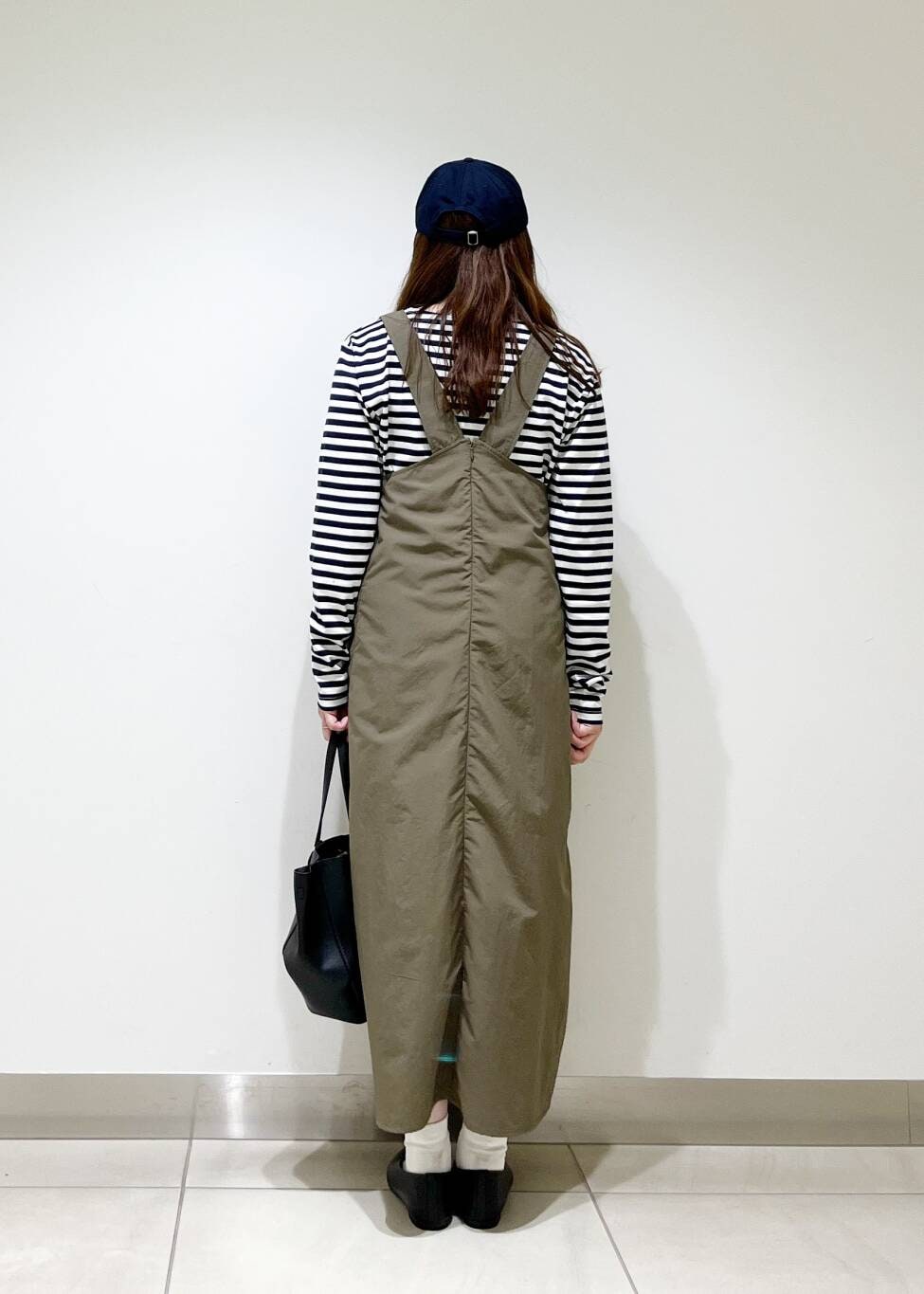 Vネックのシルエットがとてもスッキリと見えてオシャレなジャンパーワンピースです〜!ボーダーを合わせてカジュアルコーデにしました☆