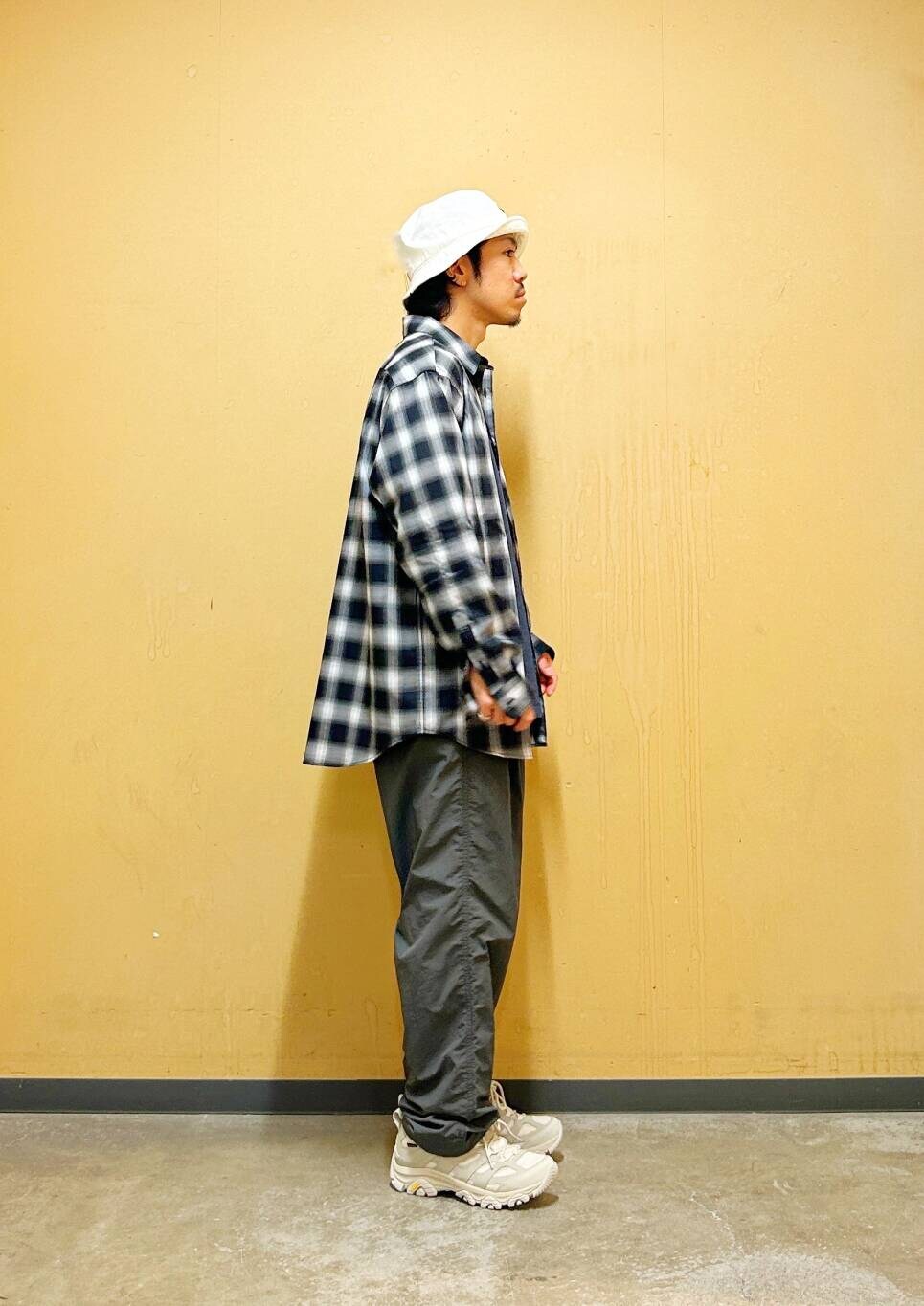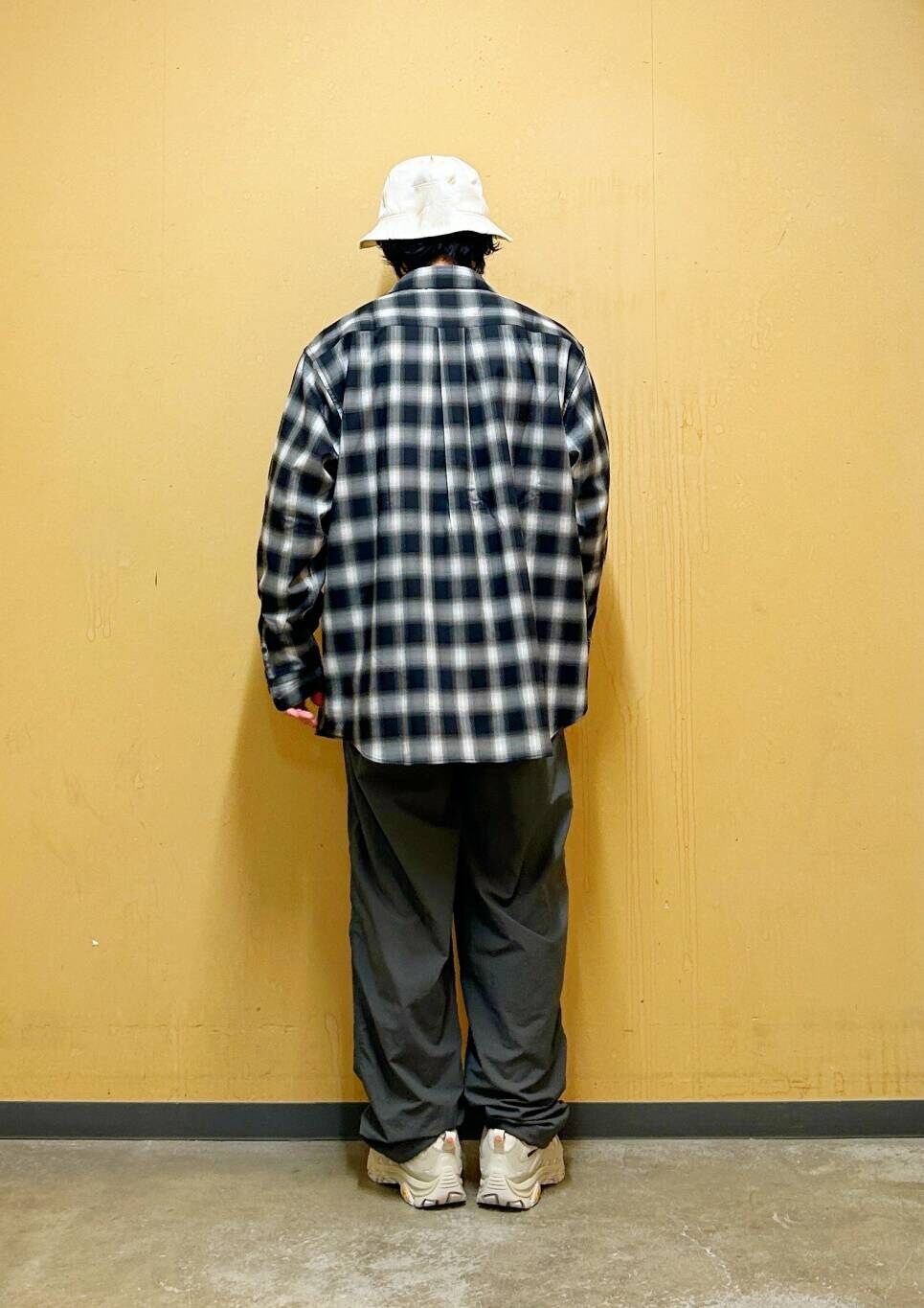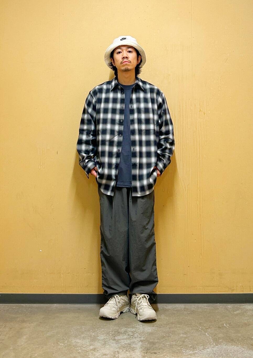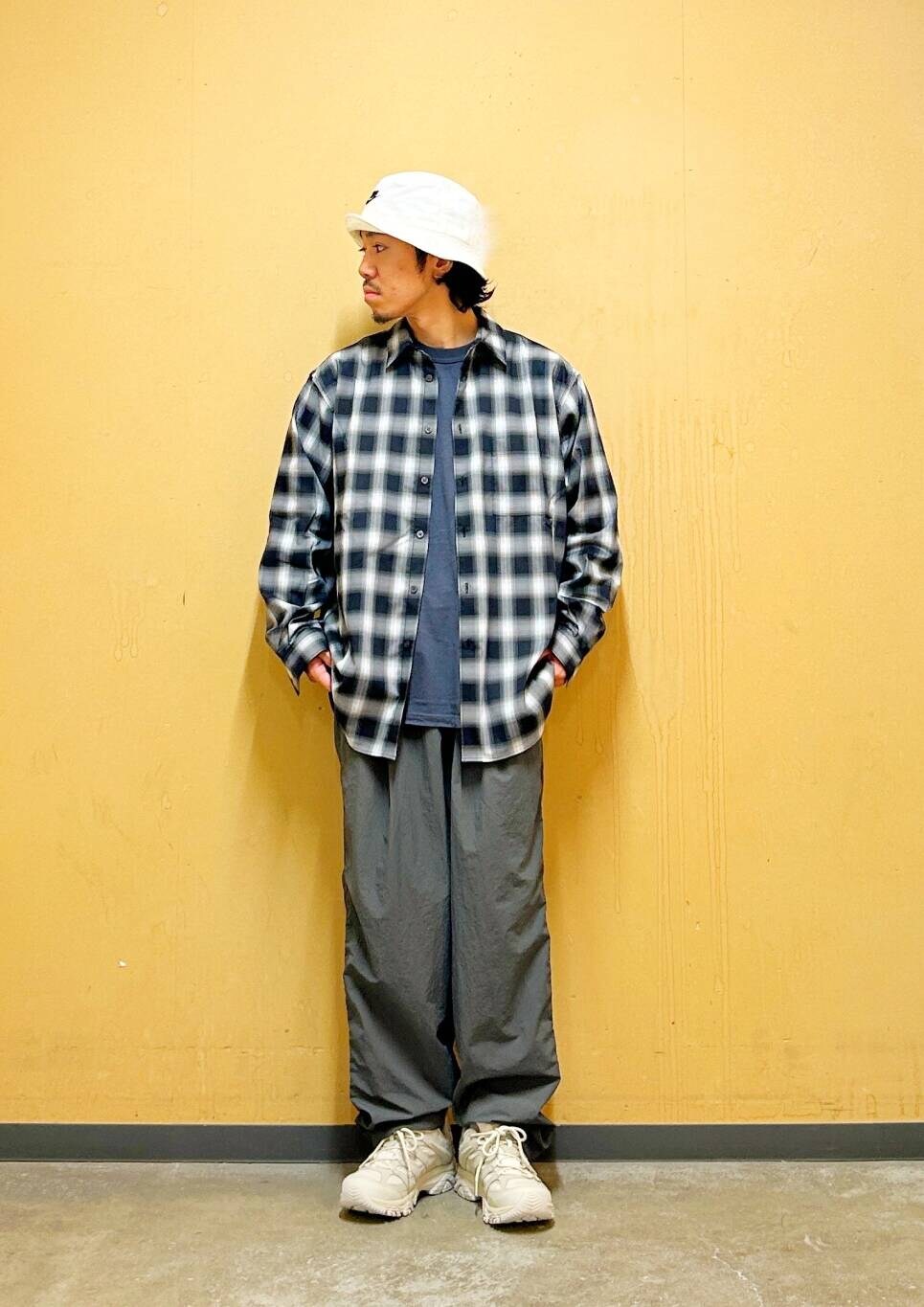今回はオンブレチェックシャツとナイロンタッサートラウザーを使用したコーディネート。