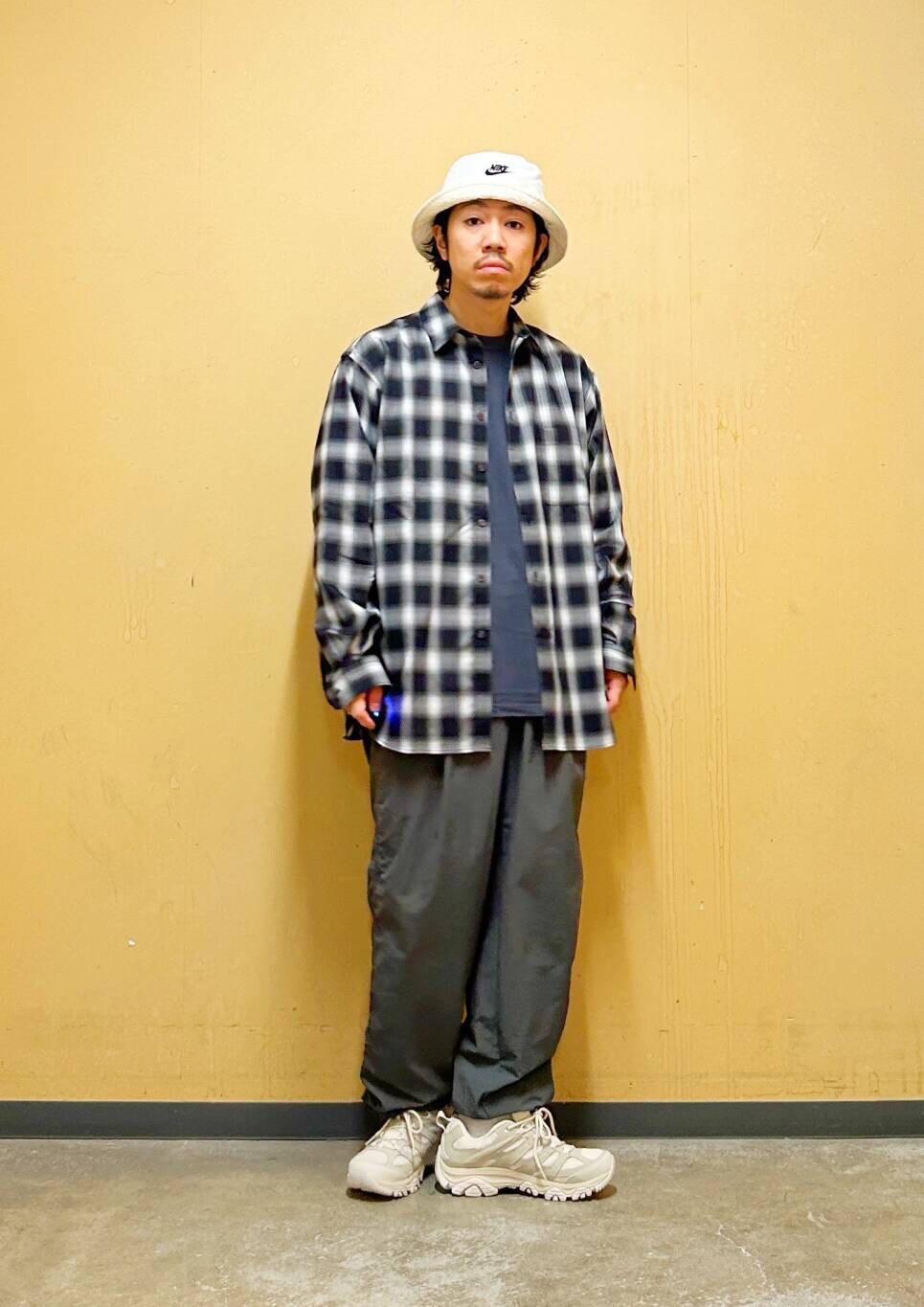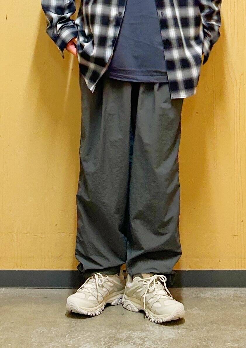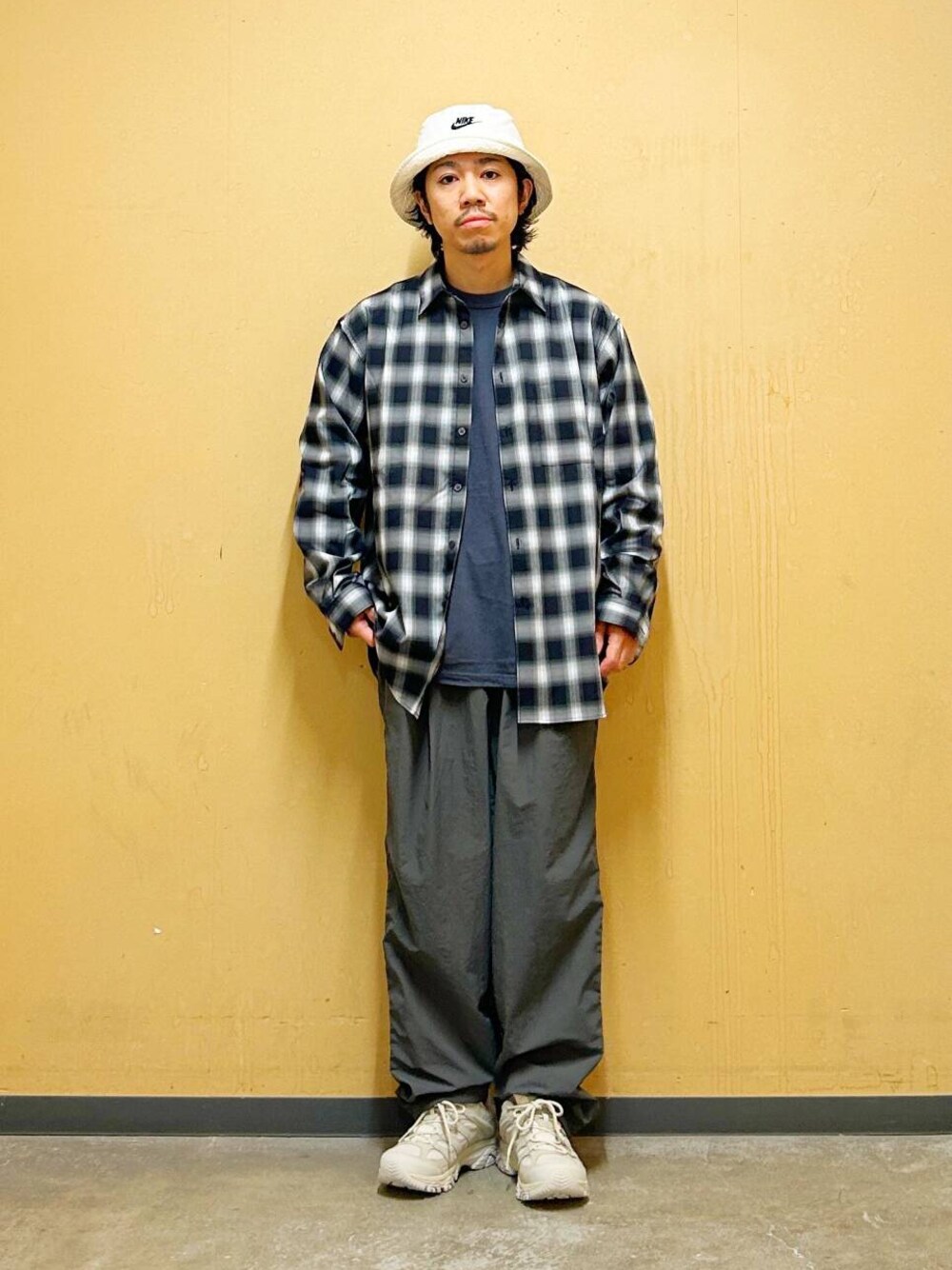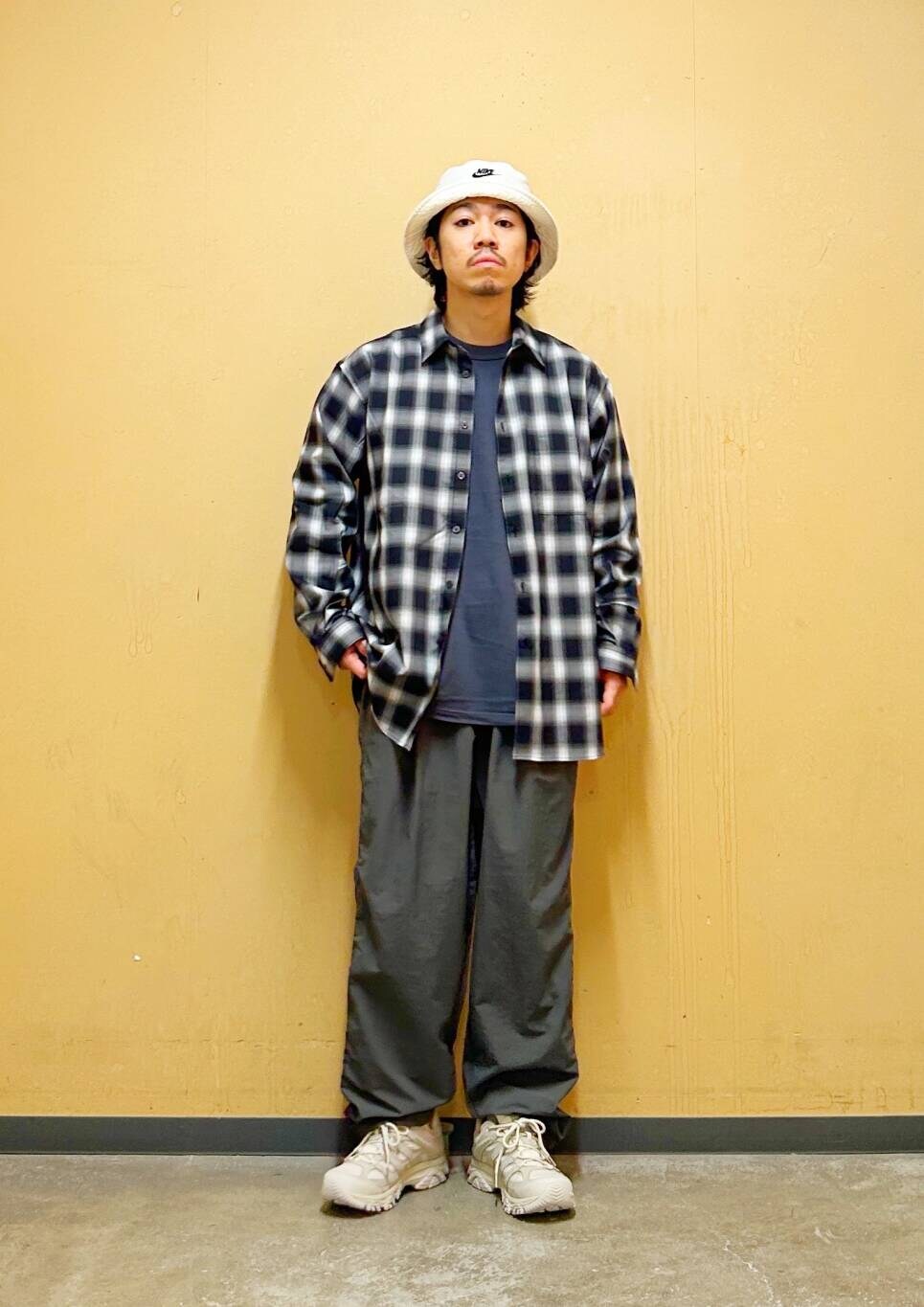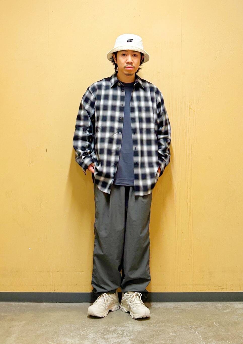 今回はオンブレチェックシャツとナイロンタッサートラウザーを使用したコーディネート。