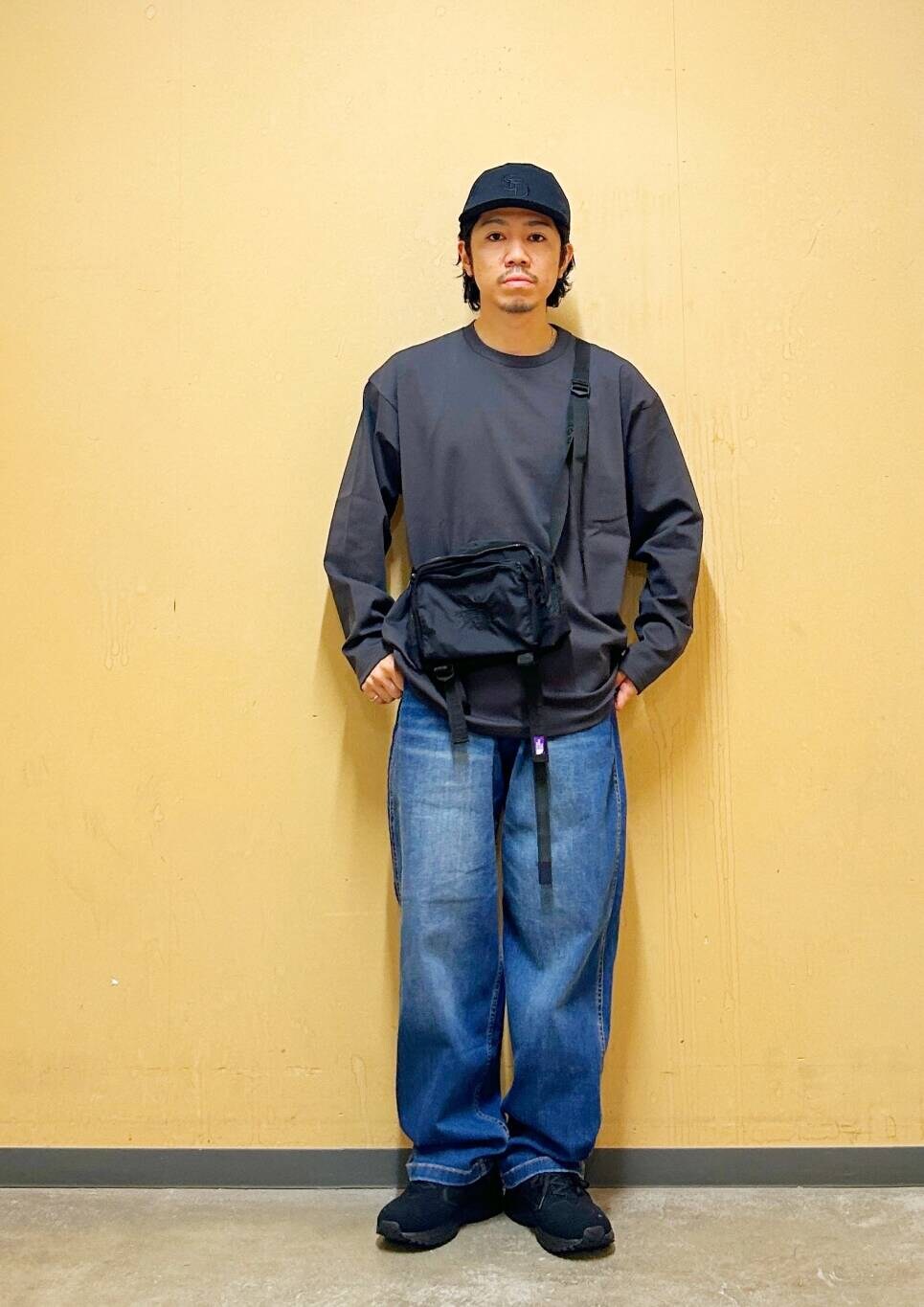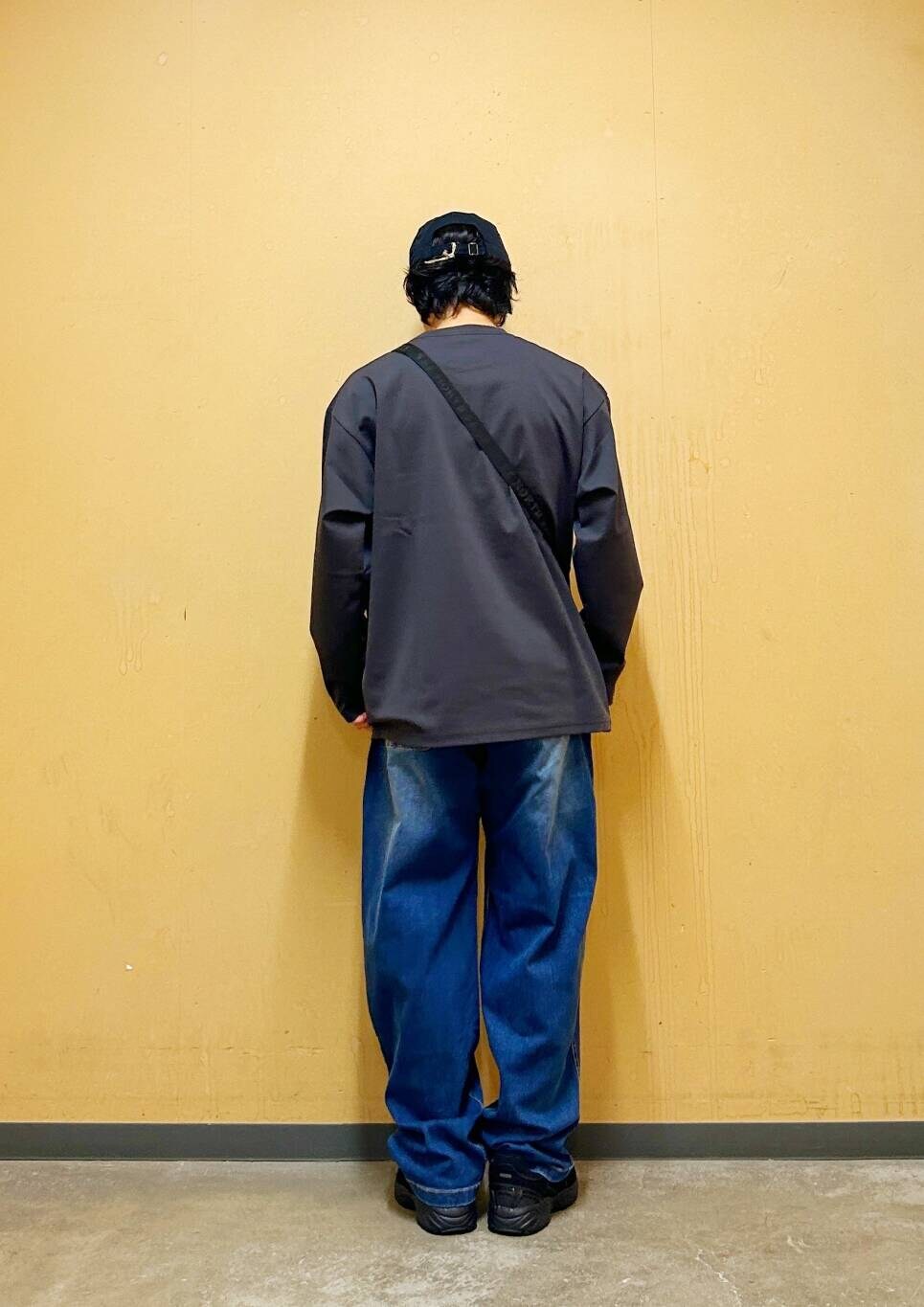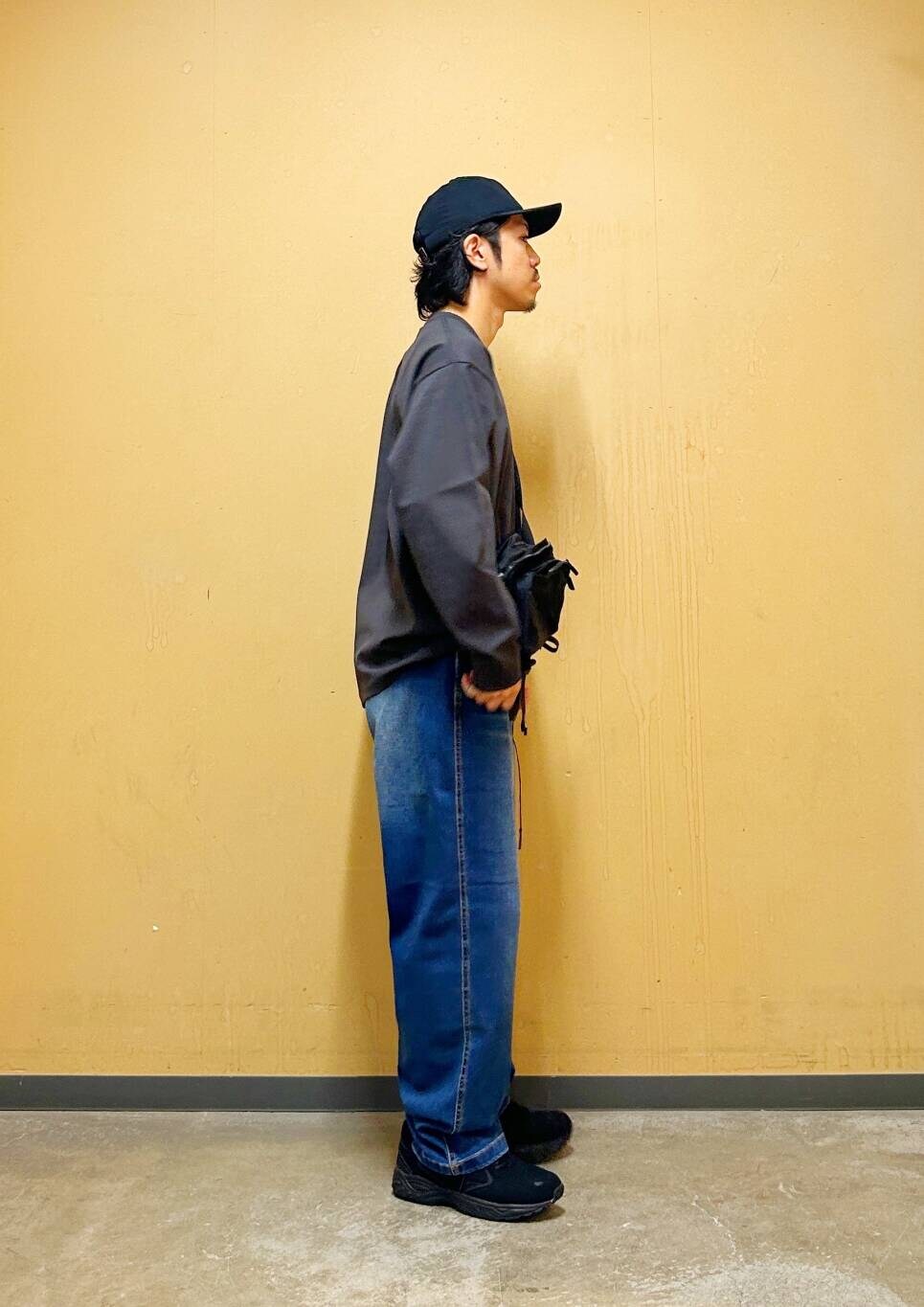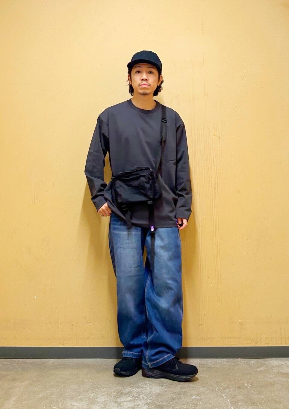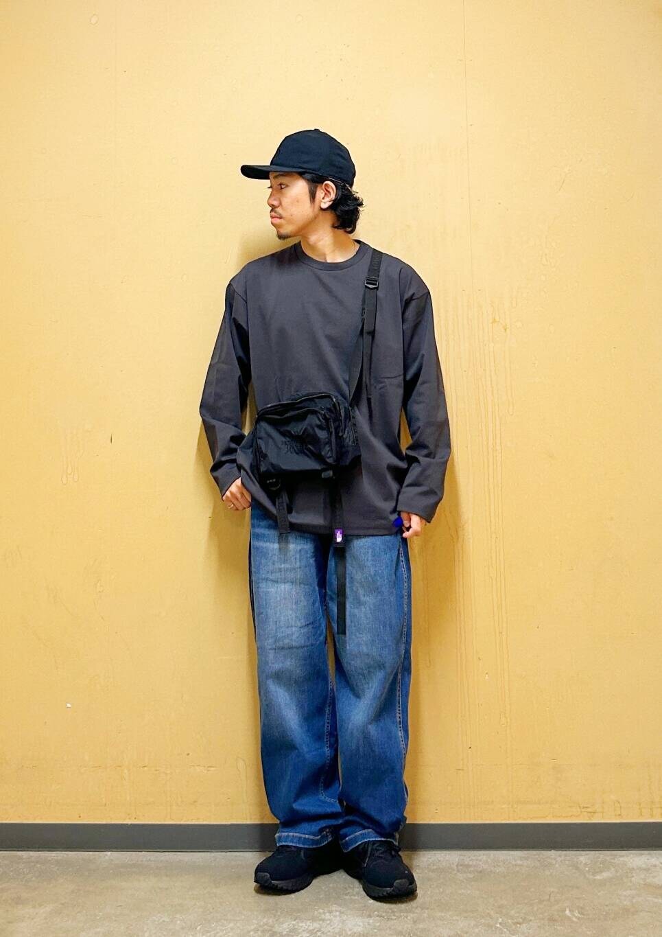 今回はドレスポンチTシャツとグラミチのデニムパンツを使用したコーディネート。