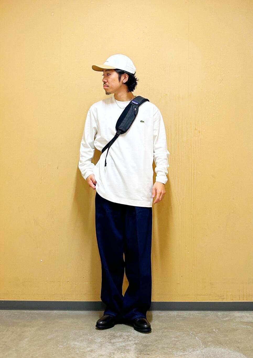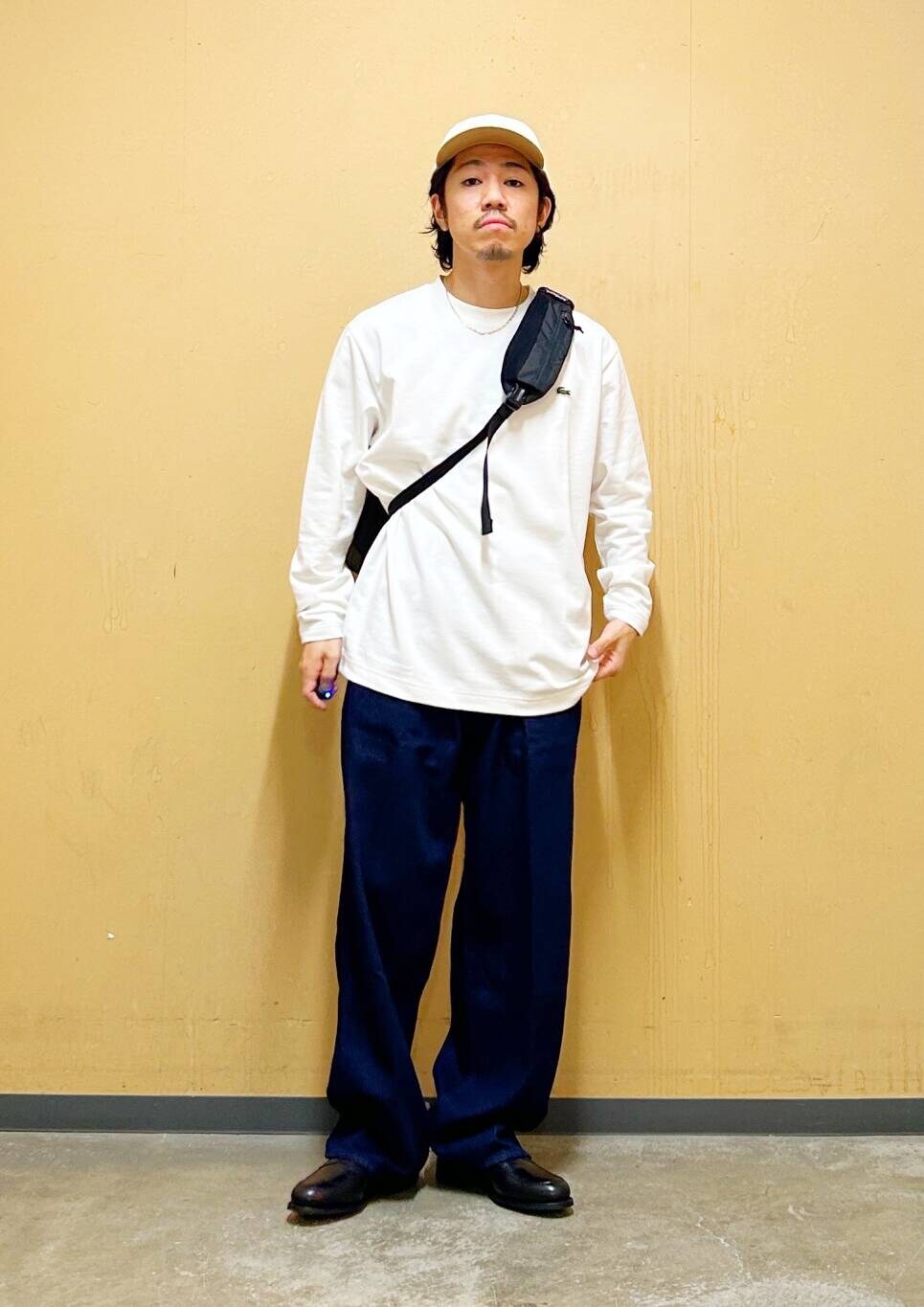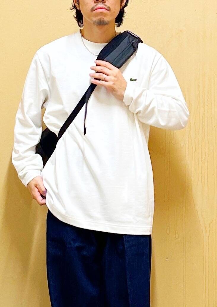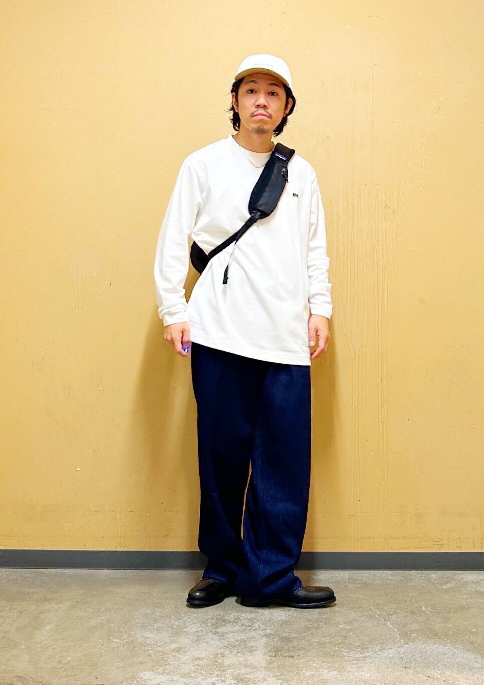 今回はLACOSTE 裏パイルワンポイントTシャツとデニムワークパンツを使用したコーディネート。