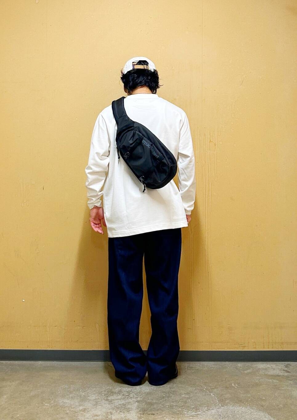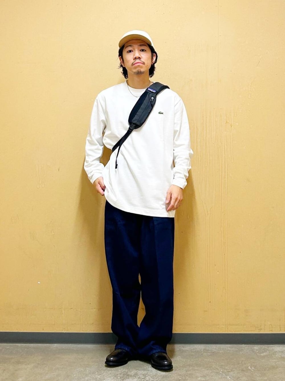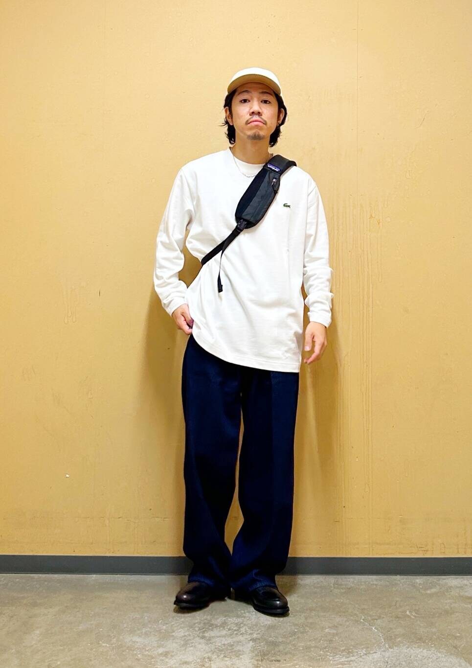 今回はLACOSTE 裏パイルワンポイントTシャツとデニムワークパンツを使用したコーディネート。