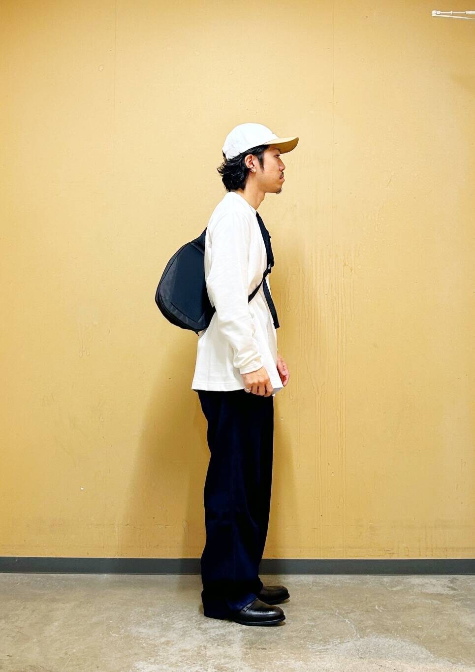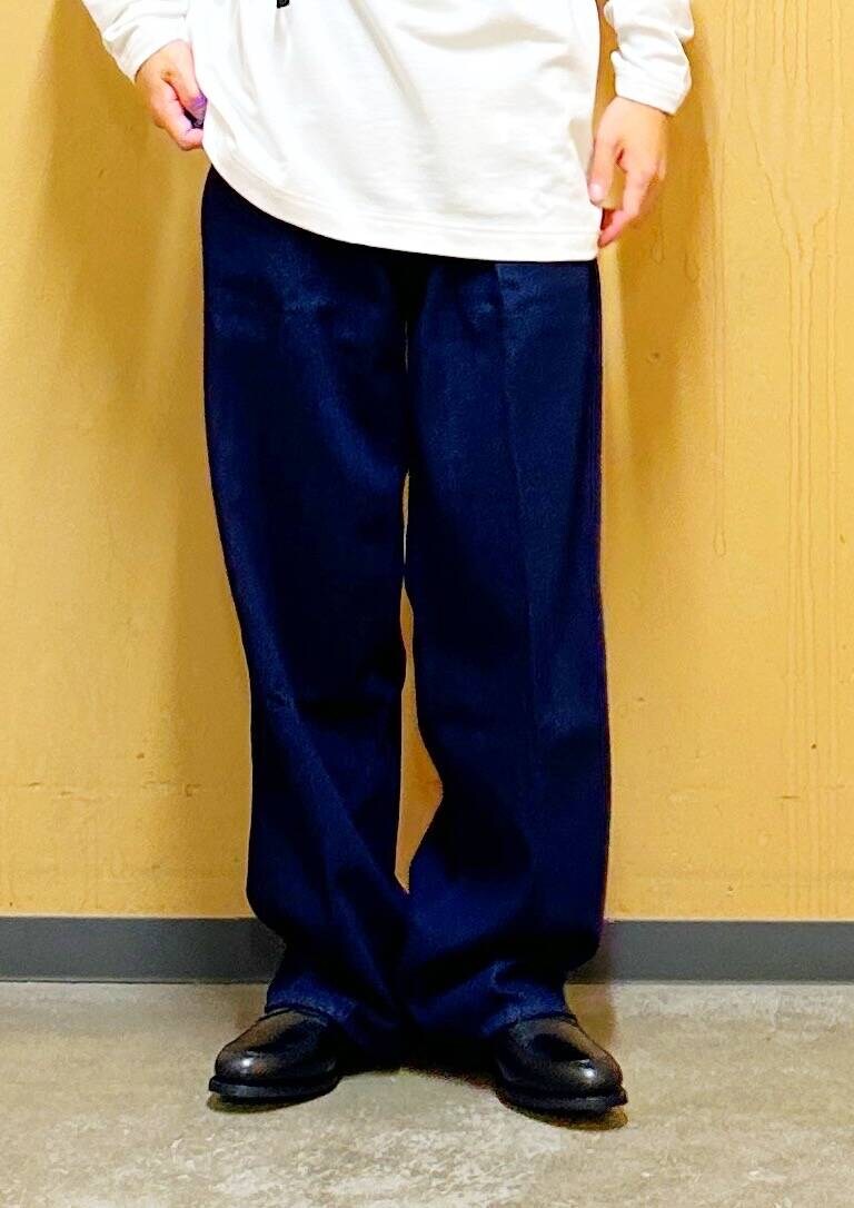 ワークパンツをベースに、ボタンフライ仕様・シンチバックのディテールを取り入れたストレートシルエットの一本。