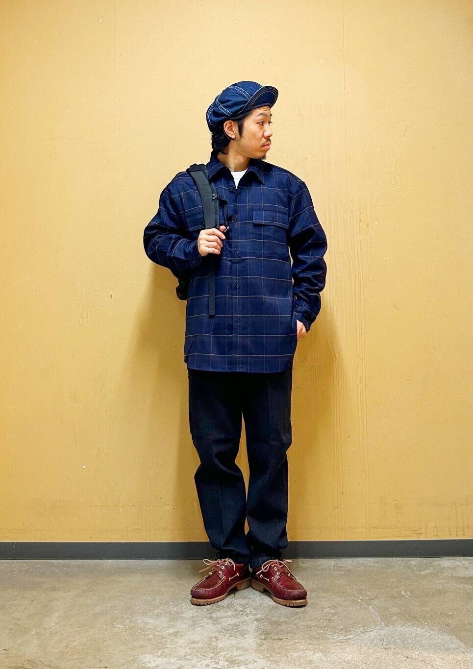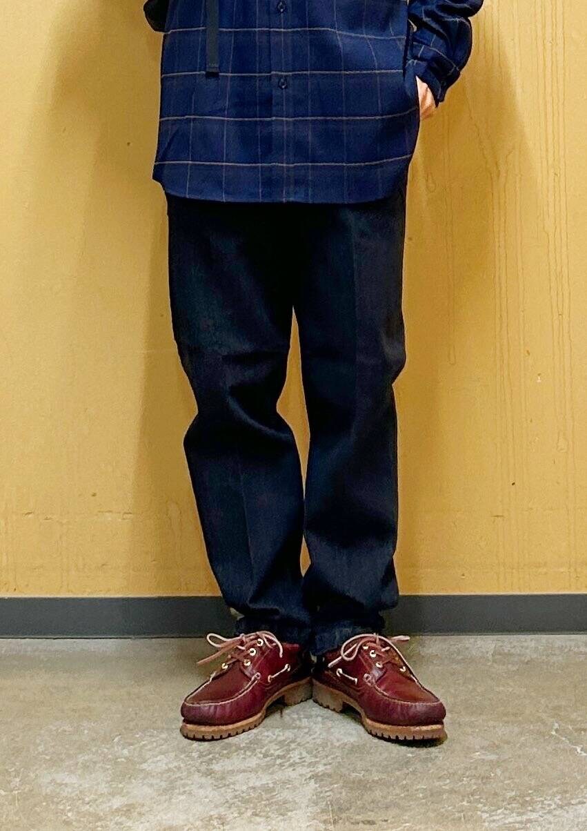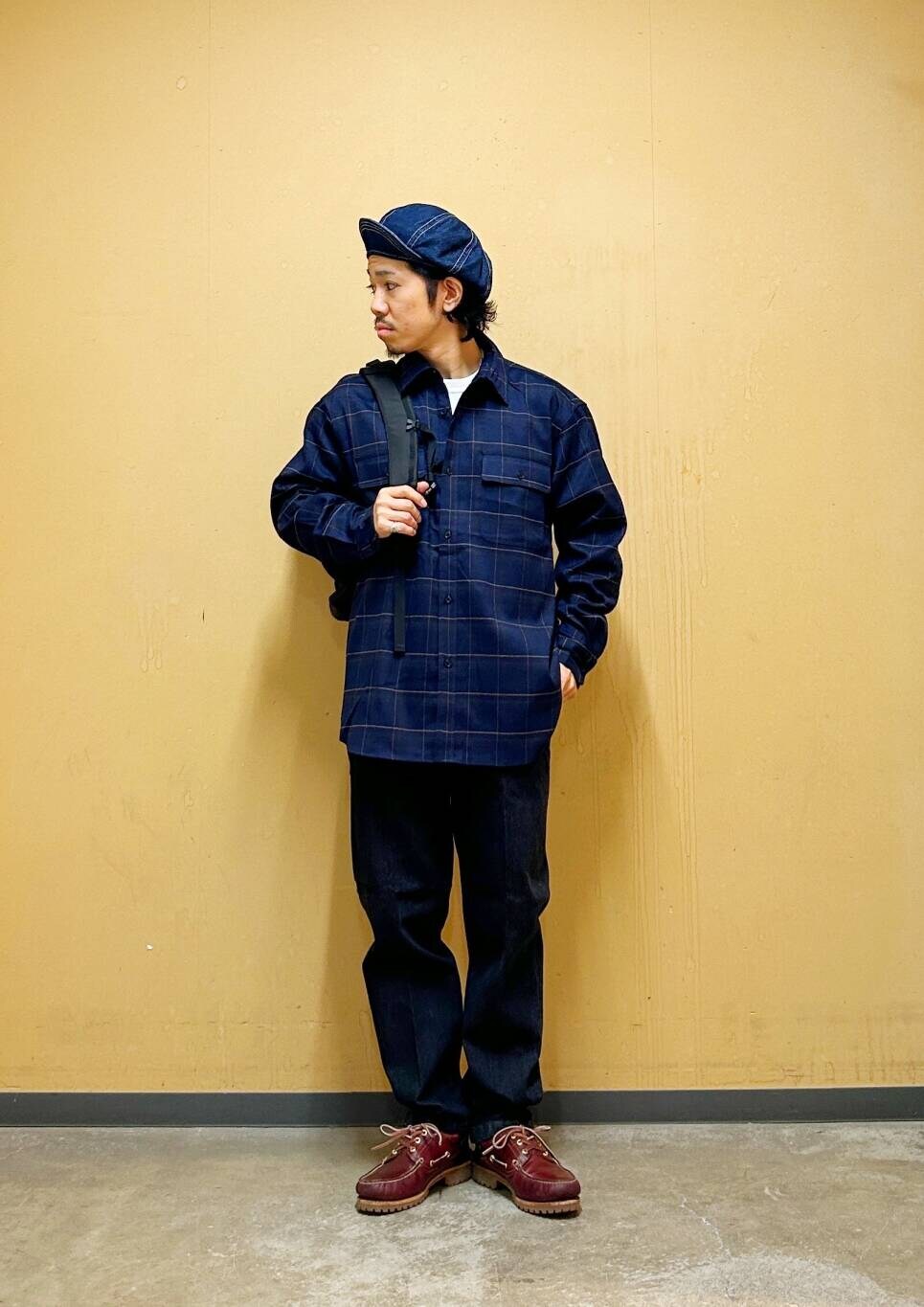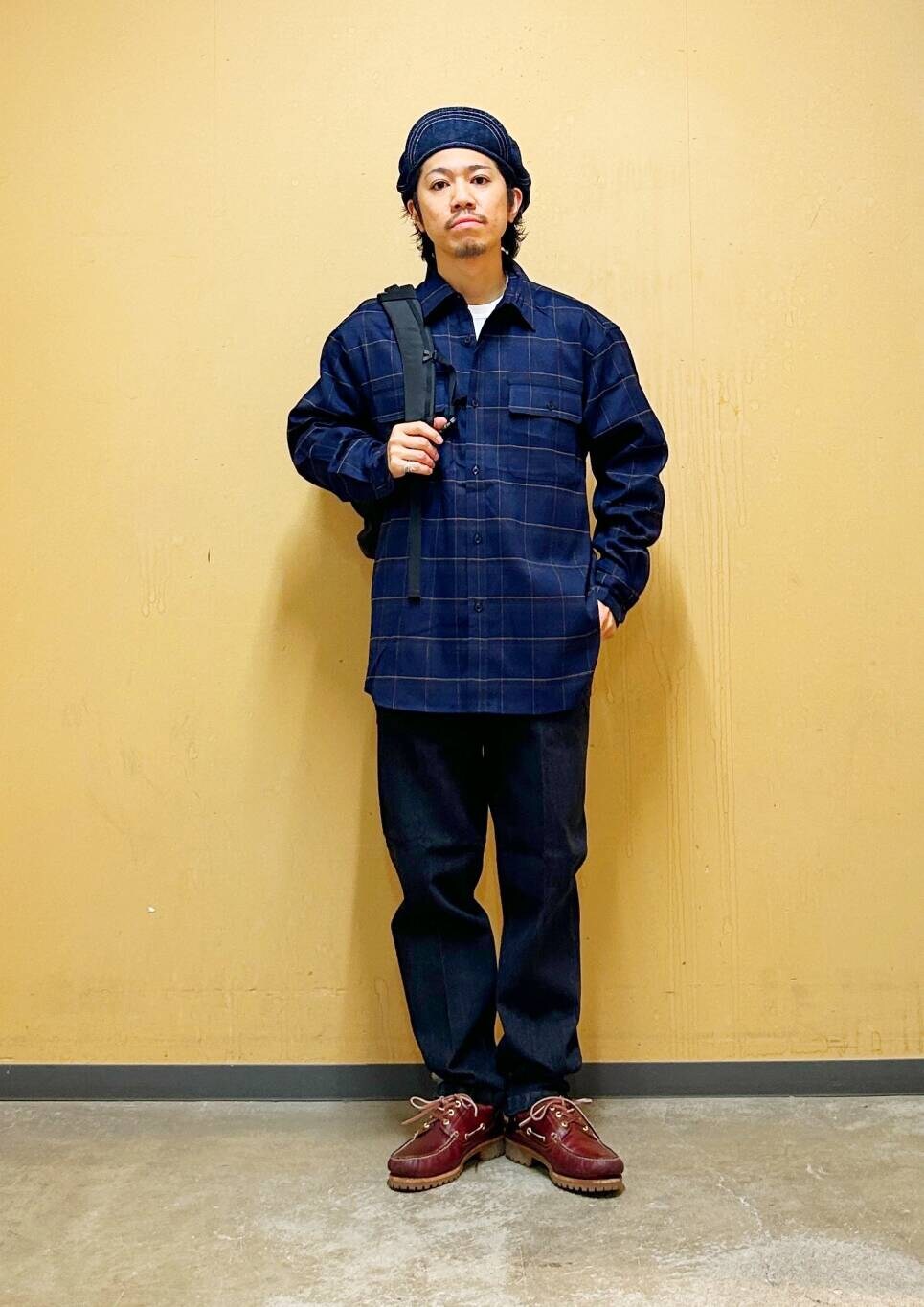 今回はチェックシャツとデニムトラウザーを使用したコーディネート。