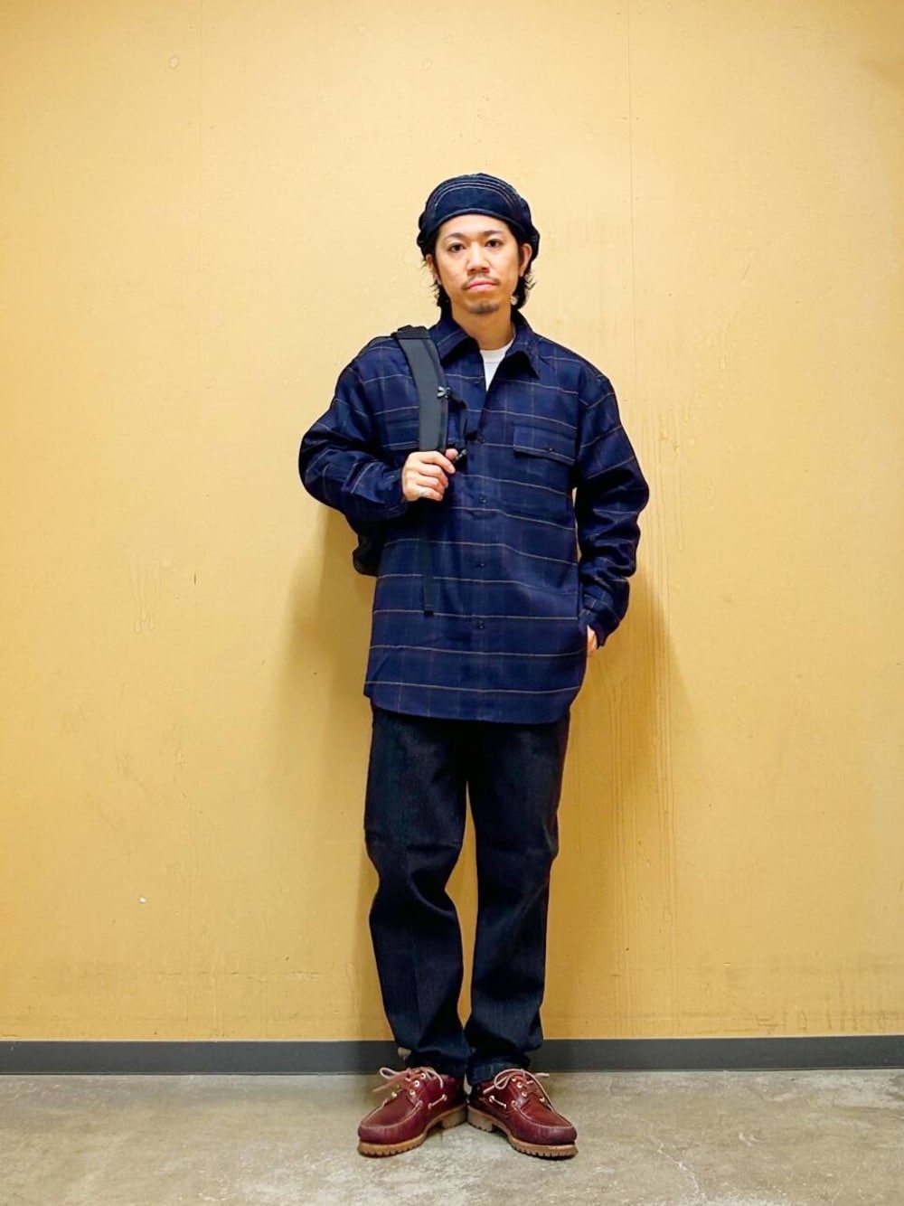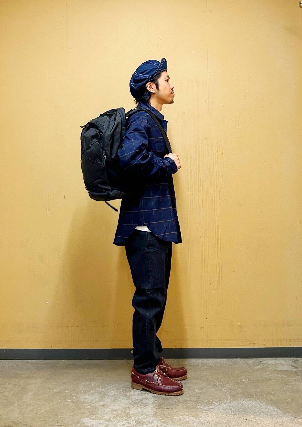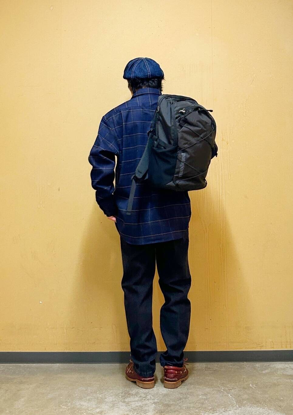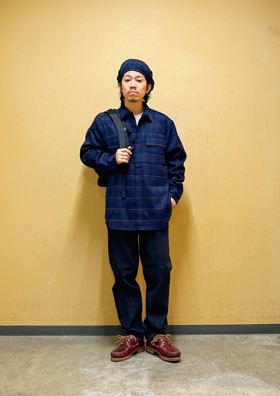 今回はチェックシャツとデニムトラウザーを使用したコーディネート。