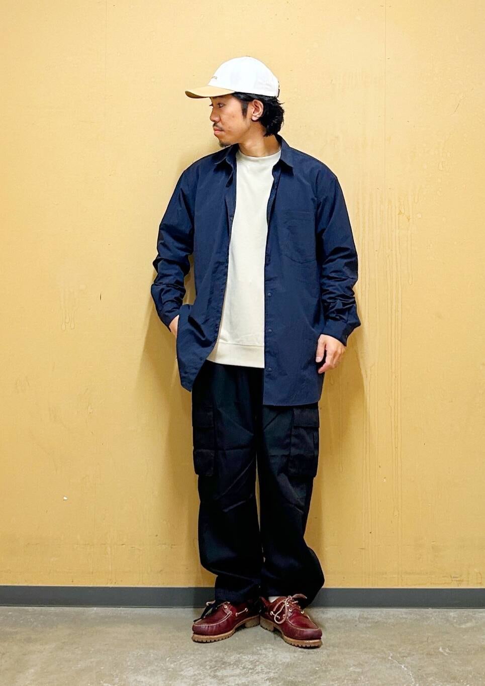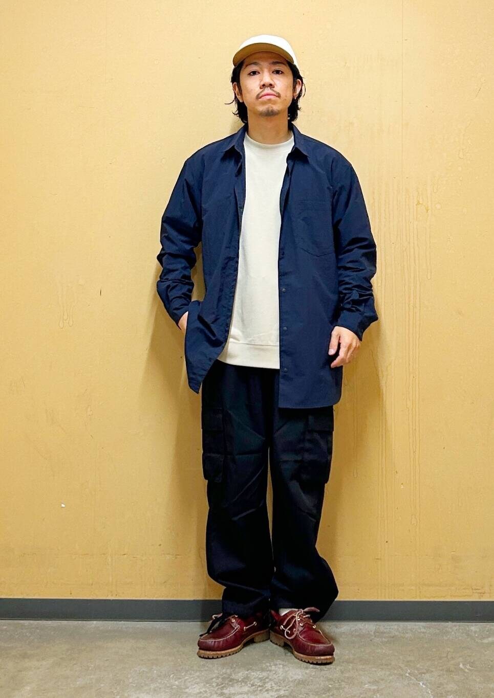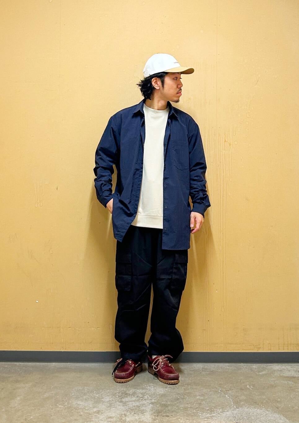 今回はナイロンタッサーロングスリーブシャツとカーゴパンツを使用したコーディネート。 セットアップで着用可能な機能性ナイロンシャツ。