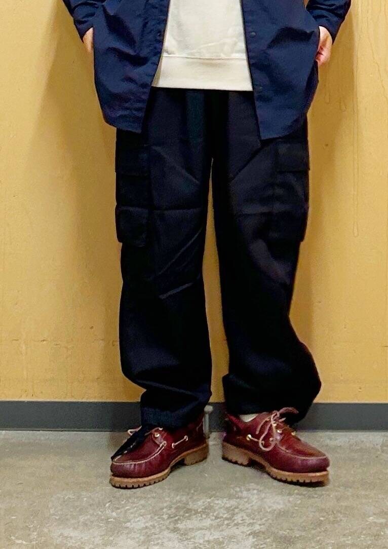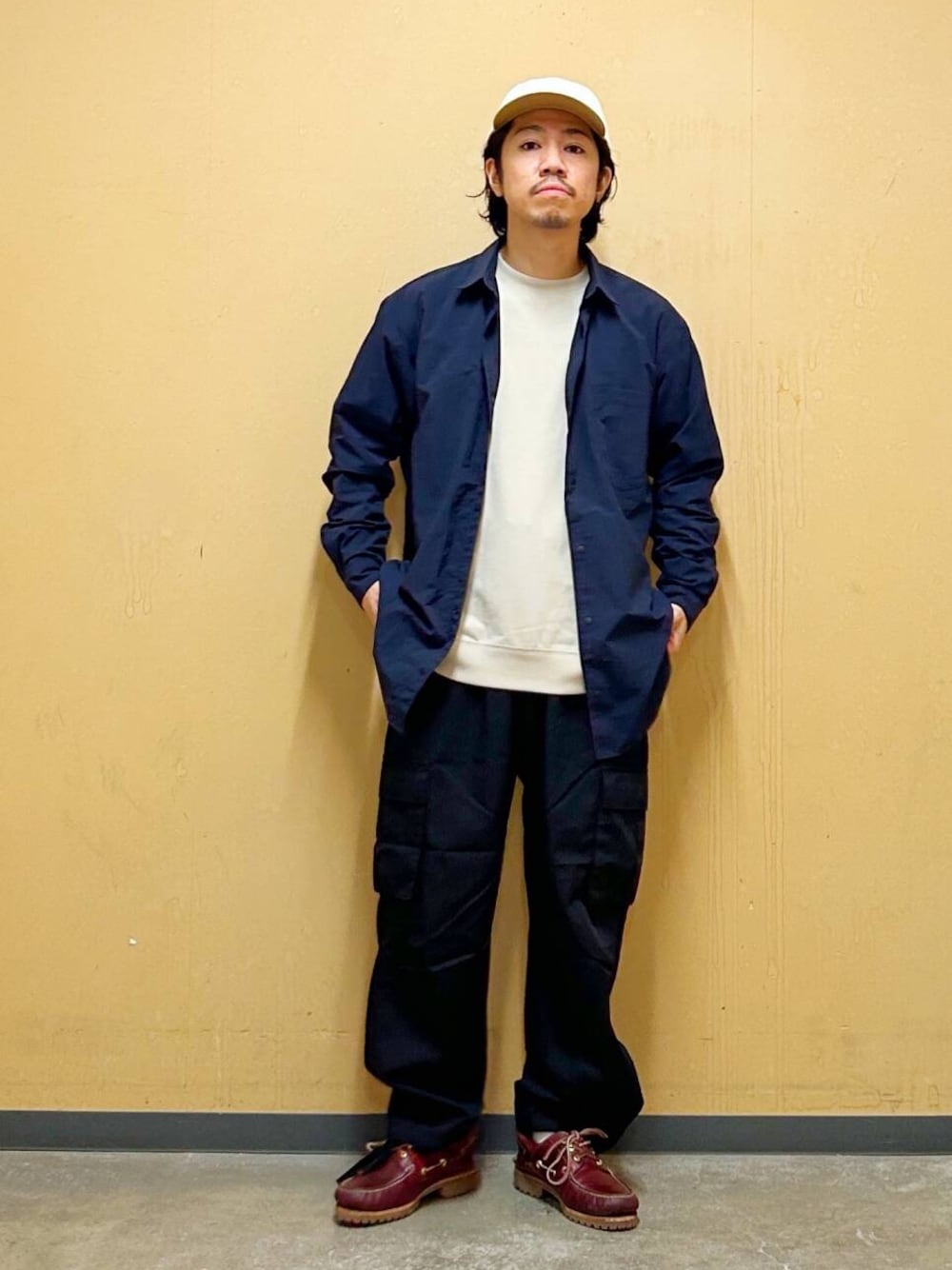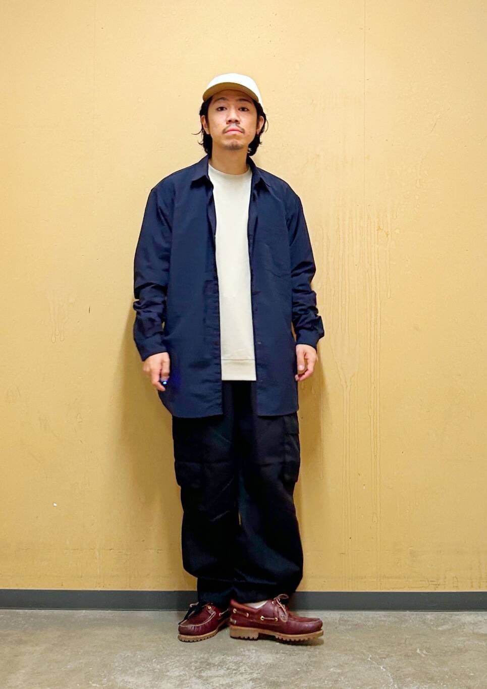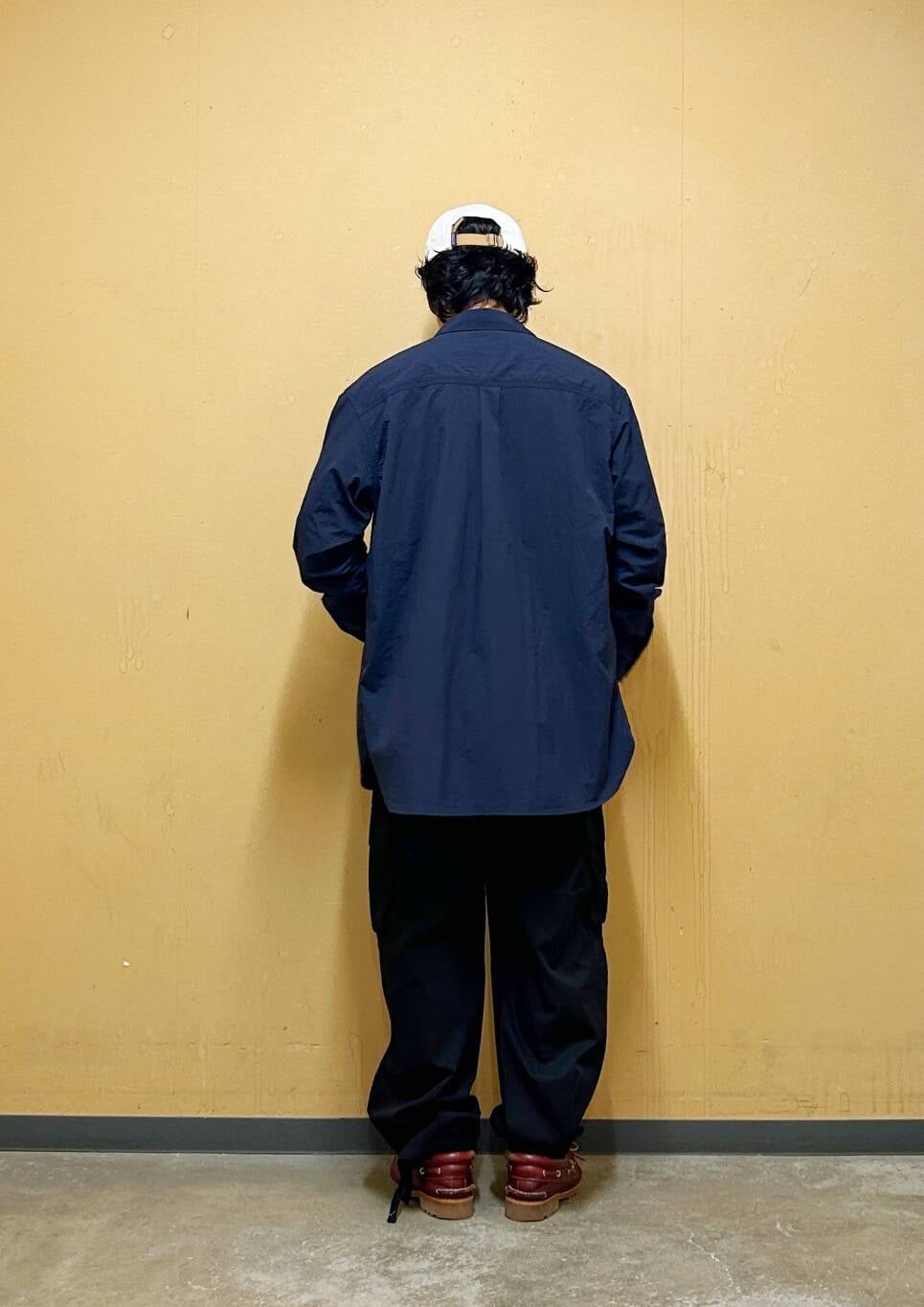 今回はナイロンタッサーロングスリーブシャツとカーゴパンツを使用したコーディネート。 セットアップで着用可能な機能性ナイロンシャツ。