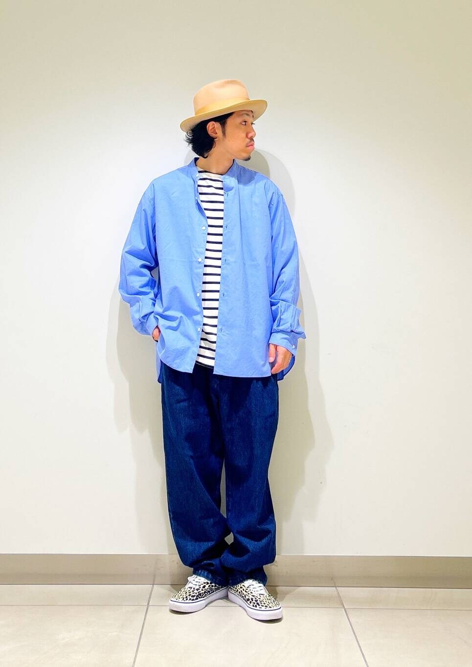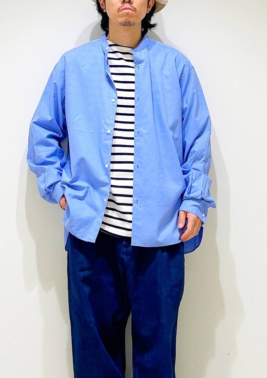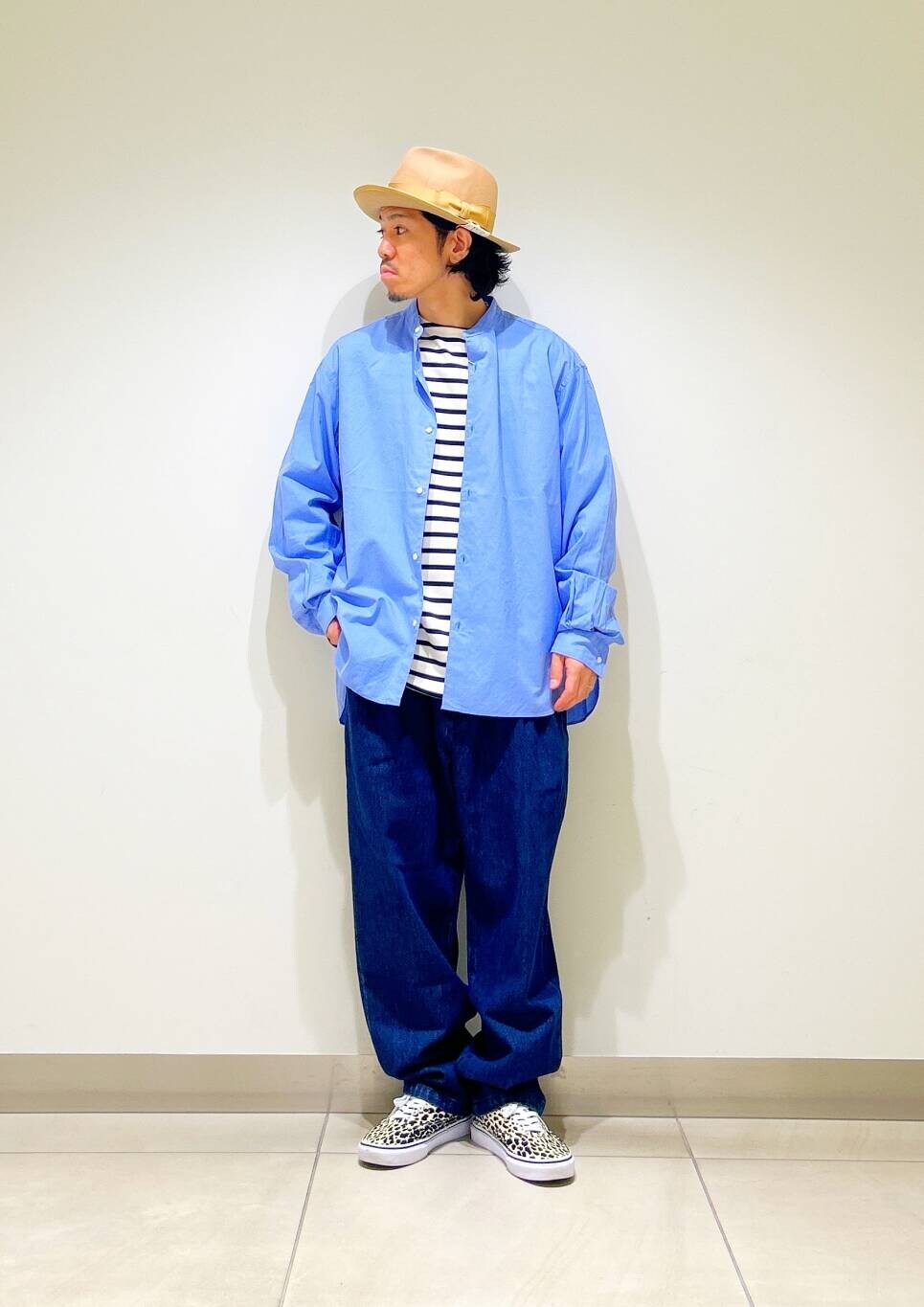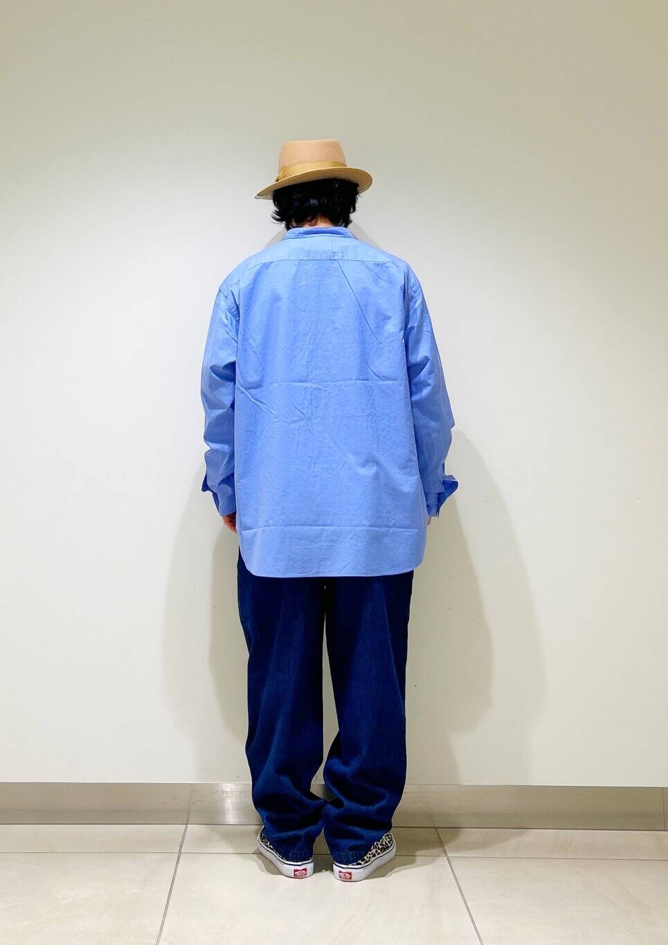 今回はバンドカラーシャツとデニムトラウザーを使用したコーディネート。