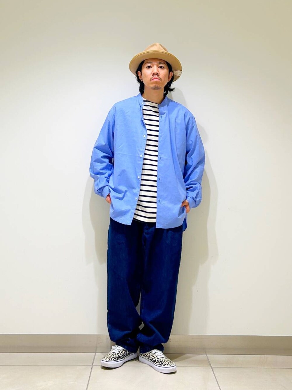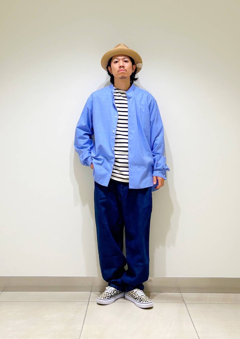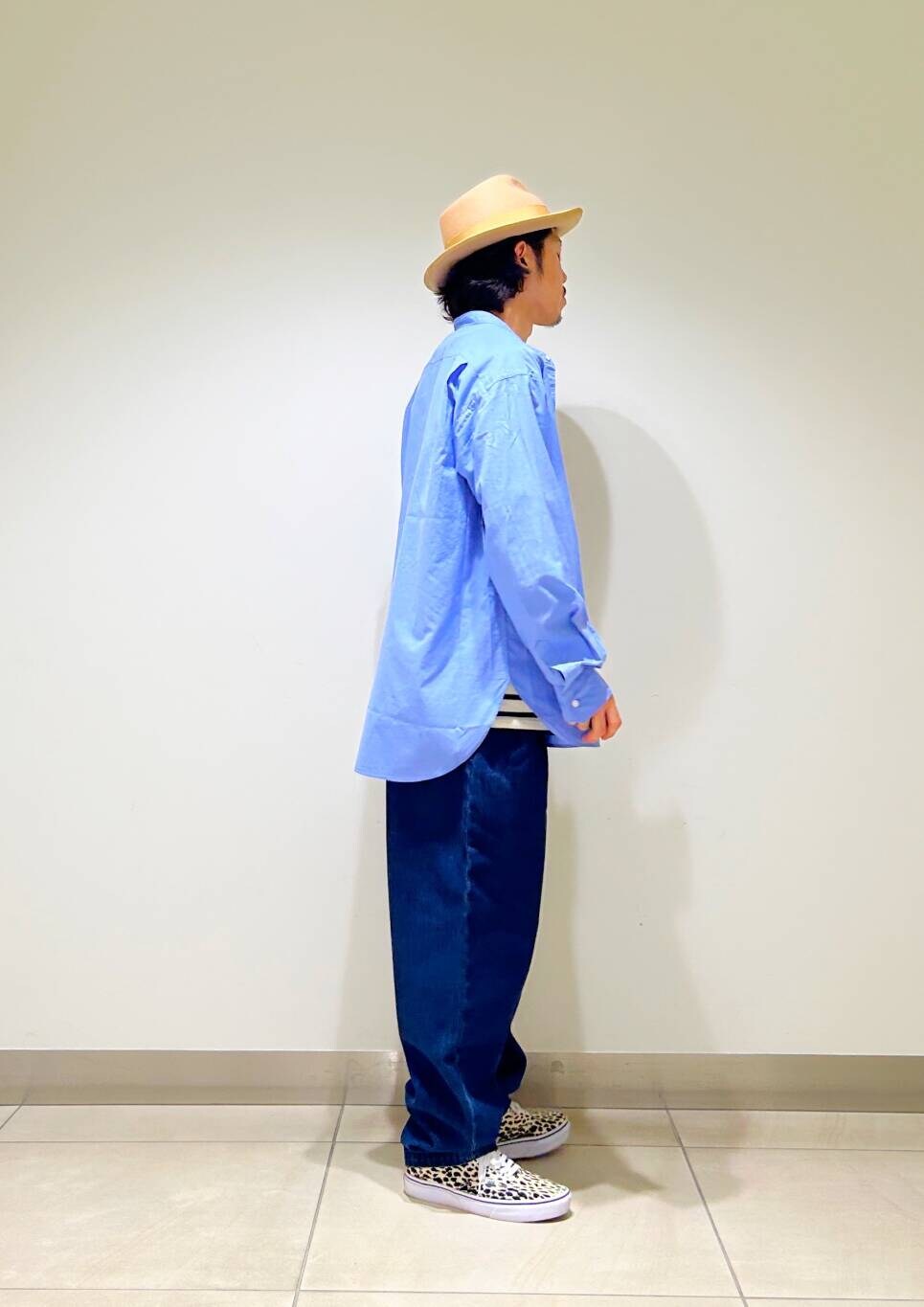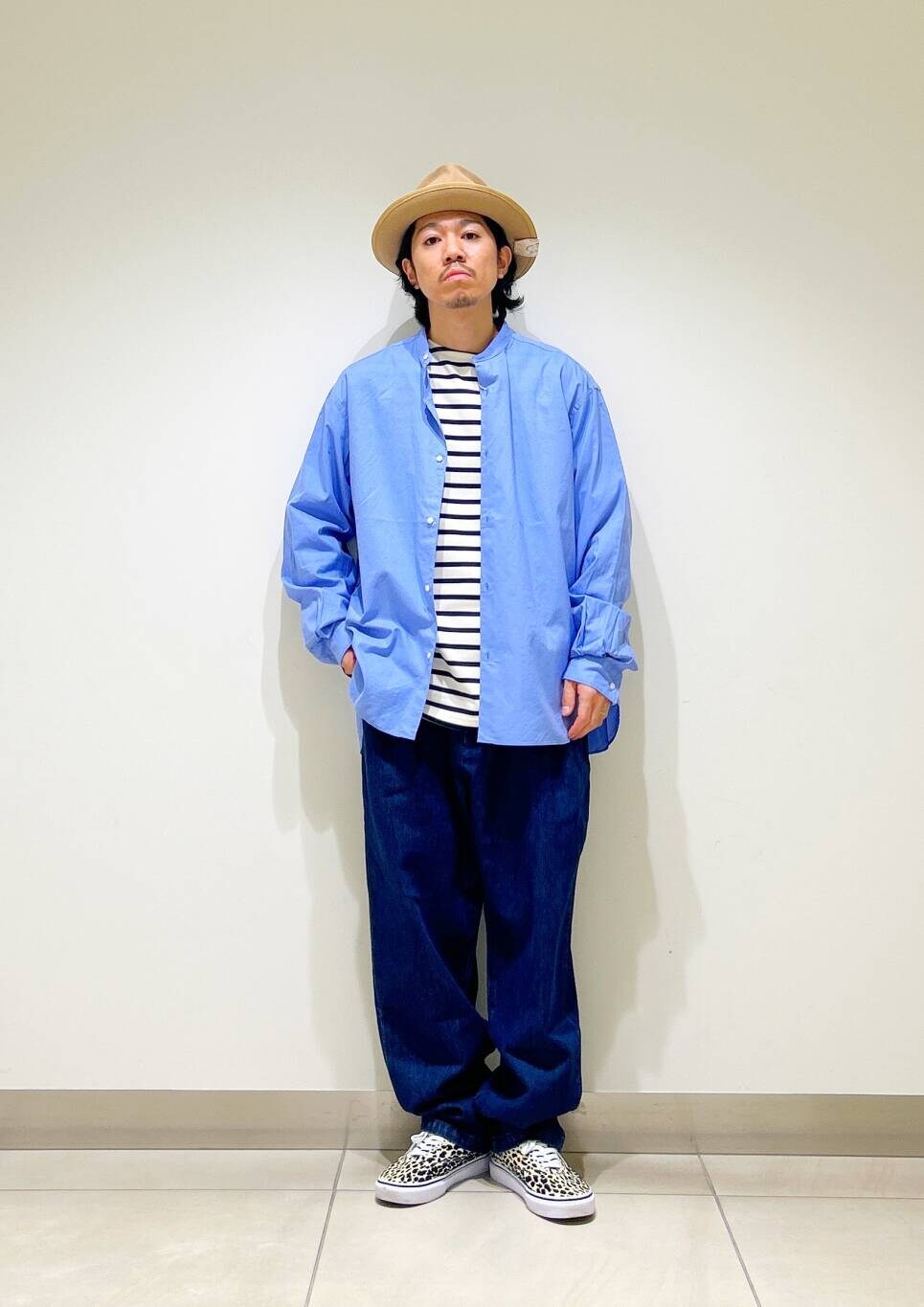 今回はバンドカラーシャツとデニムトラウザーを使用したコーディネート。