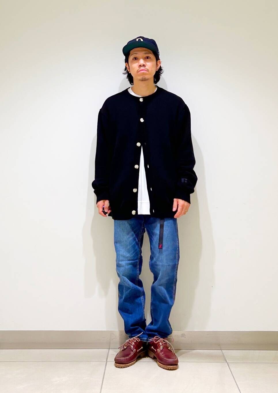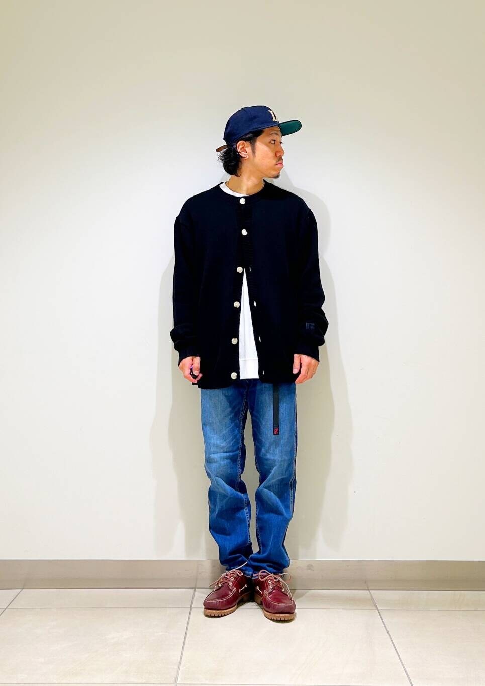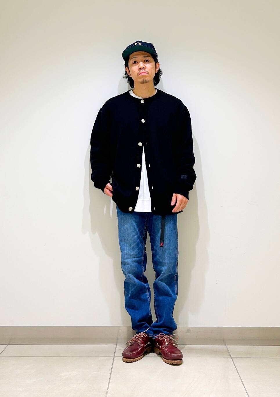 今回はRussell別注カーディガンとグラミチ別注デニムパンツを使用したコーディネート。 RUSSELLATHLETICにオーダーしたスウェットルックのニットカーディガン
