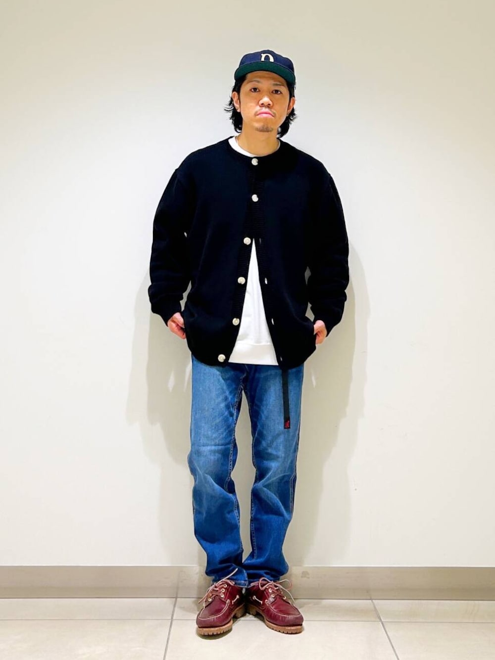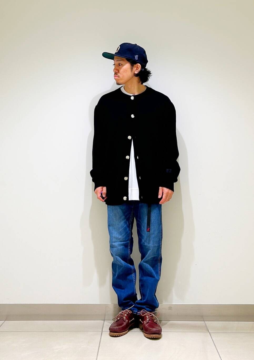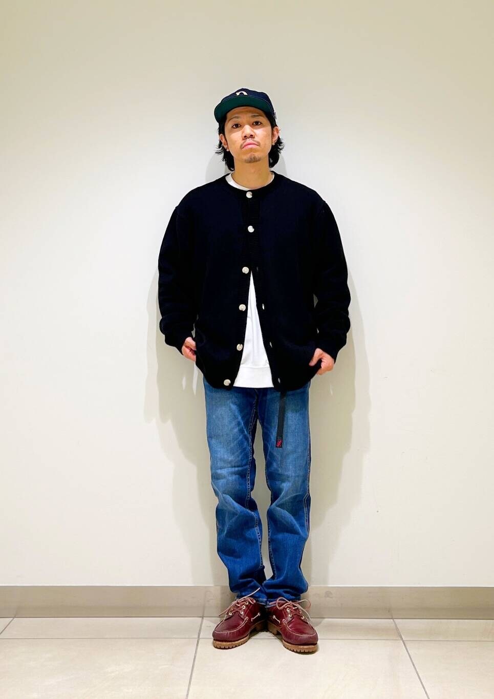今回はRussell別注カーディガンとグラミチ別注デニムパンツを使用したコーディネート。 RUSSELLATHLETICにオーダーしたスウェットルックのニットカーディガン