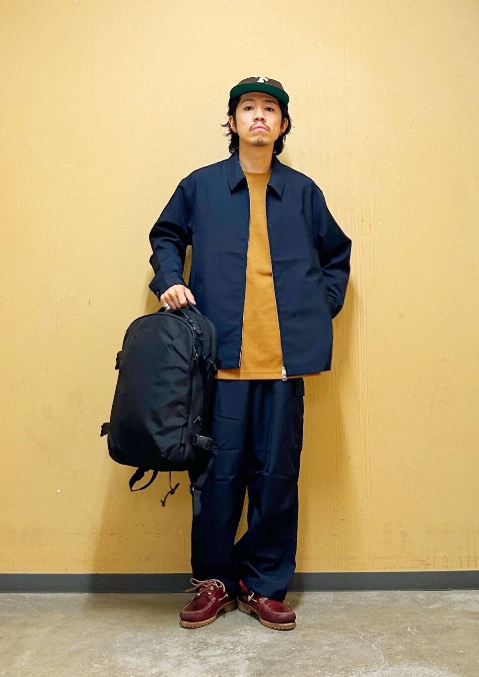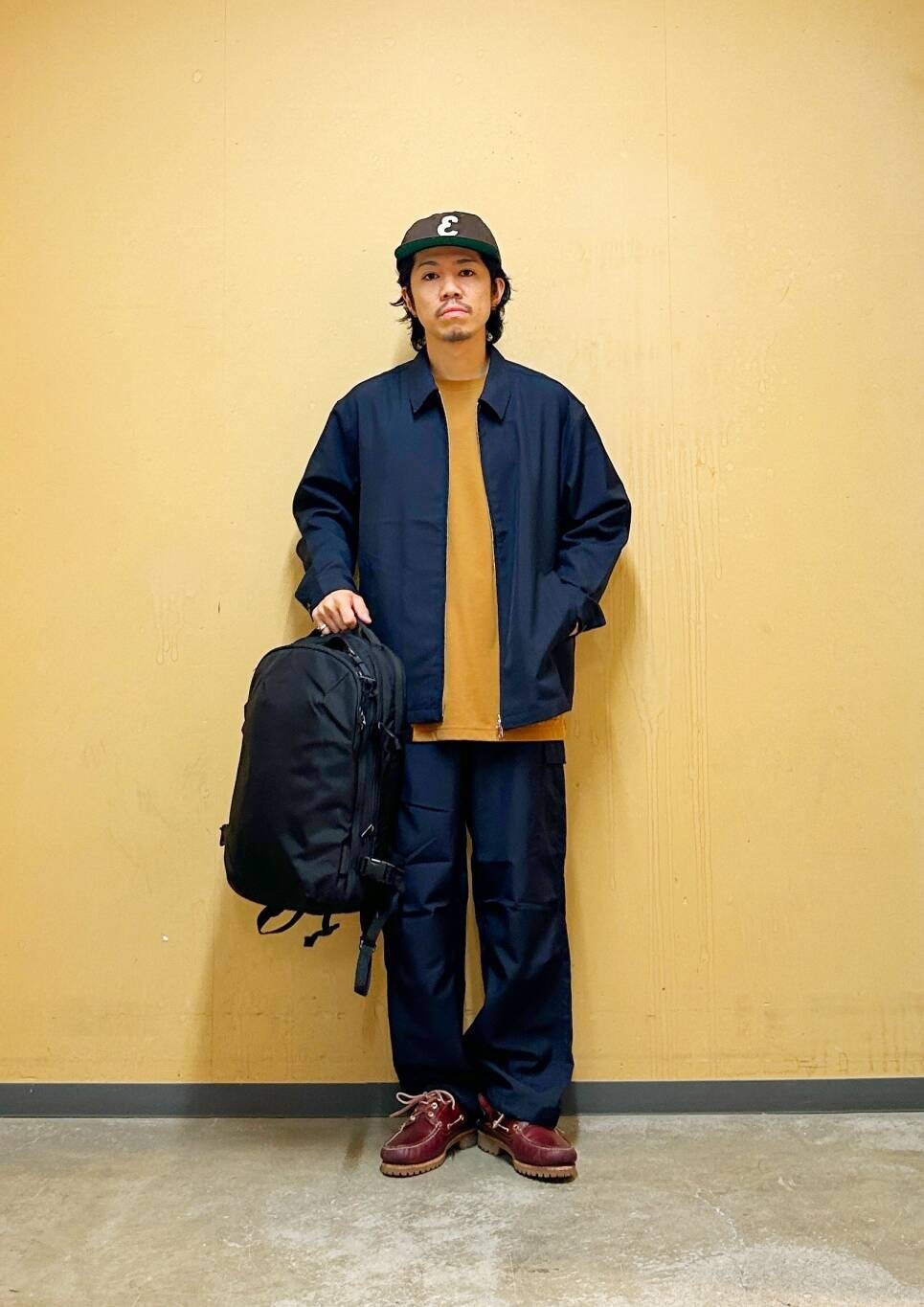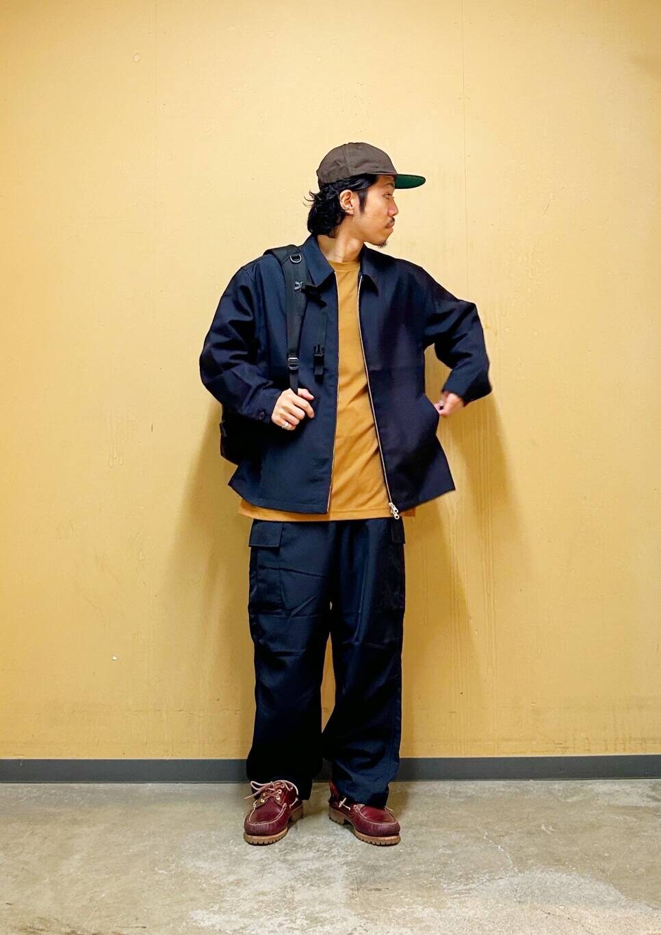 今回はハリントンジャケットとカーゴパンツを使用したコーディネート。 機能素材"セオアルファ"を用いたハリントンジャケット