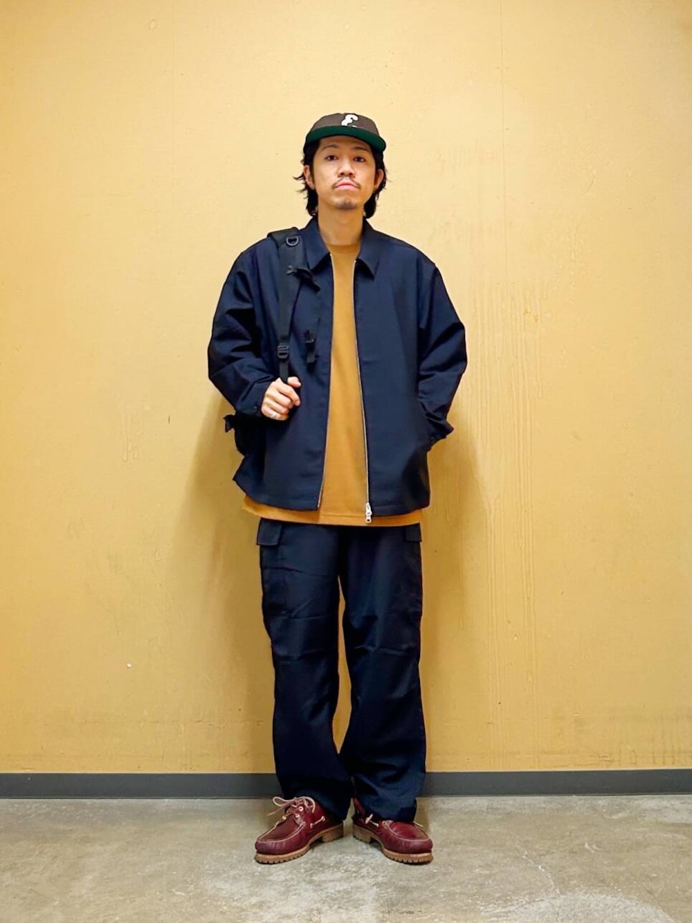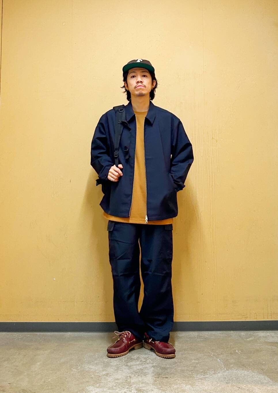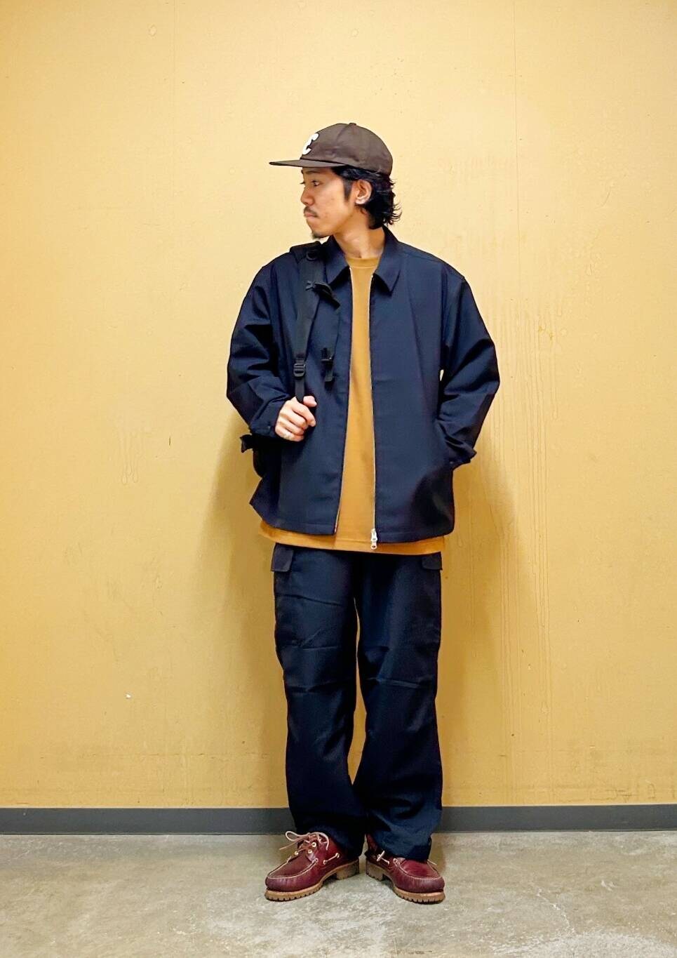 今回はハリントンジャケットとカーゴパンツを使用したコーディネート。 機能素材"セオアルファ"を用いたハリントンジャケット