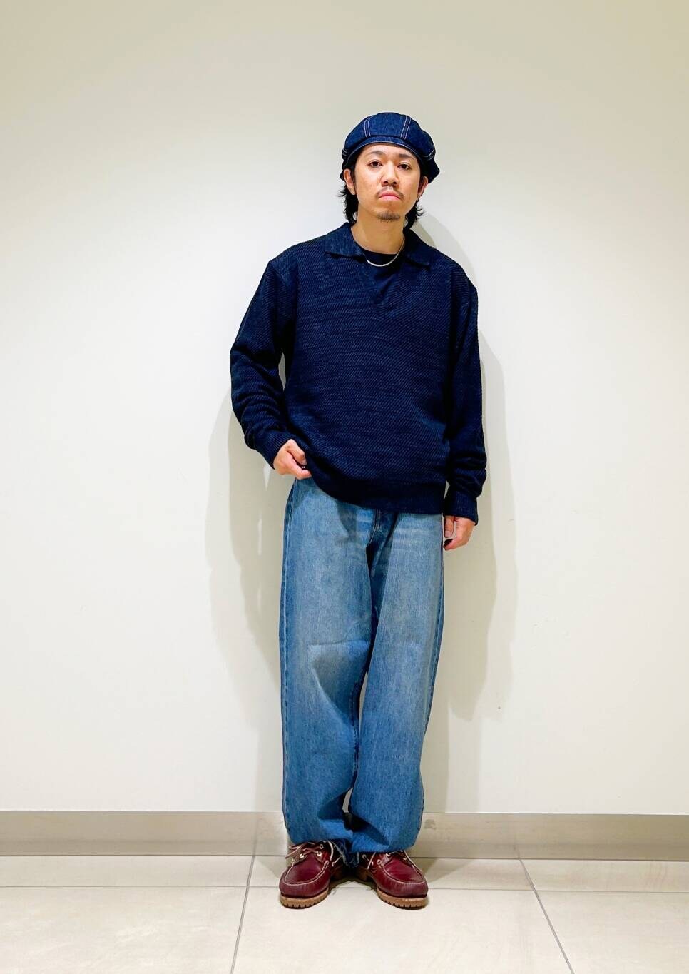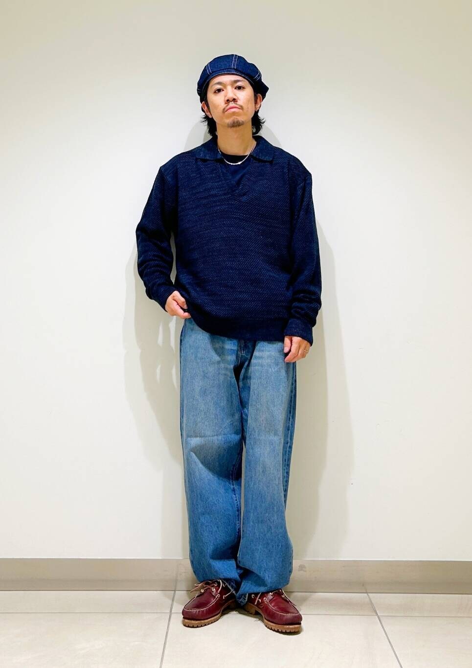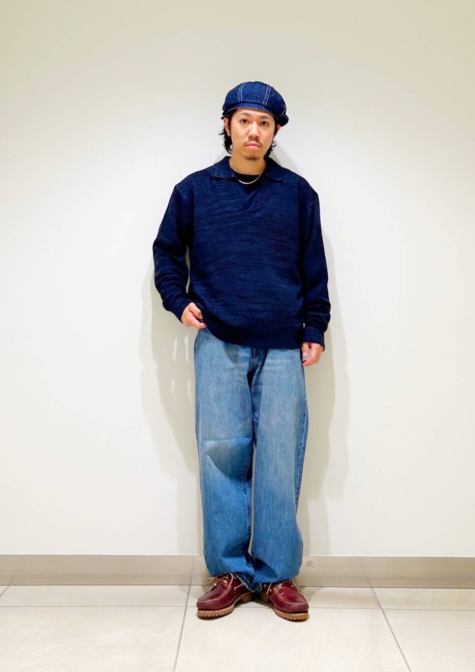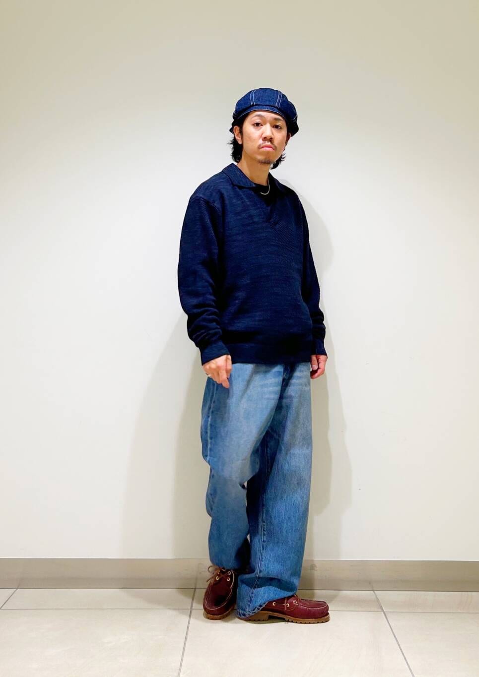 今回はWAGAMI スキッパー ニット ポロシャツとデニムパンツを使用したコーディネート。
