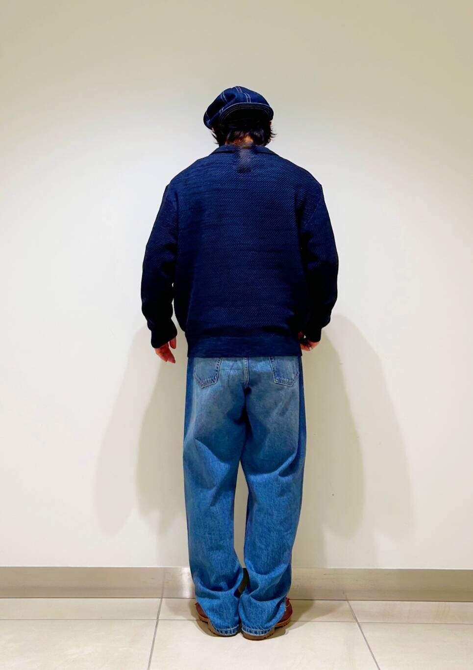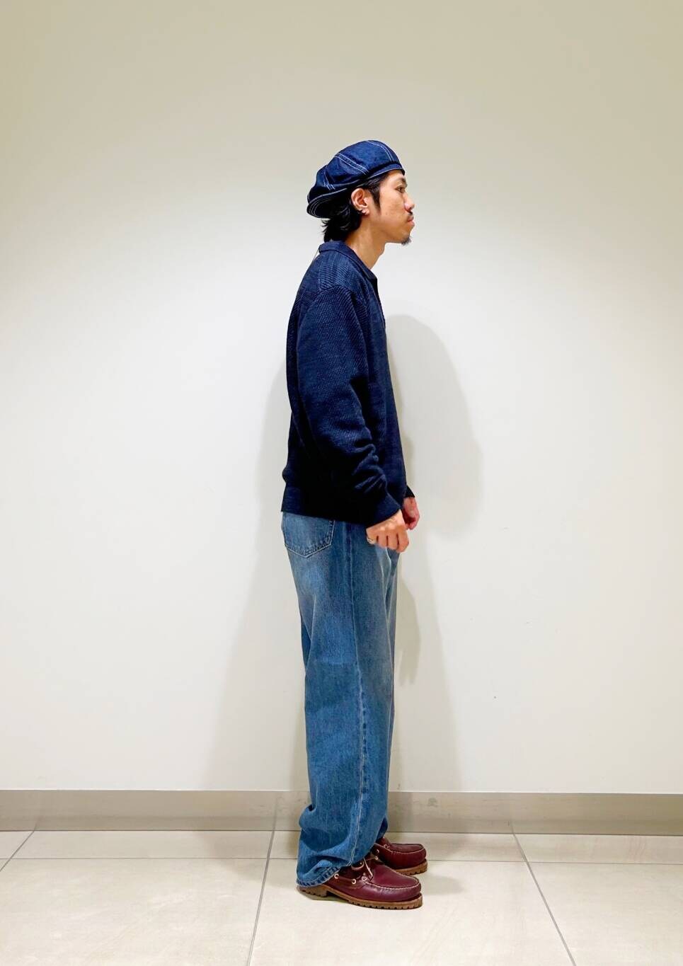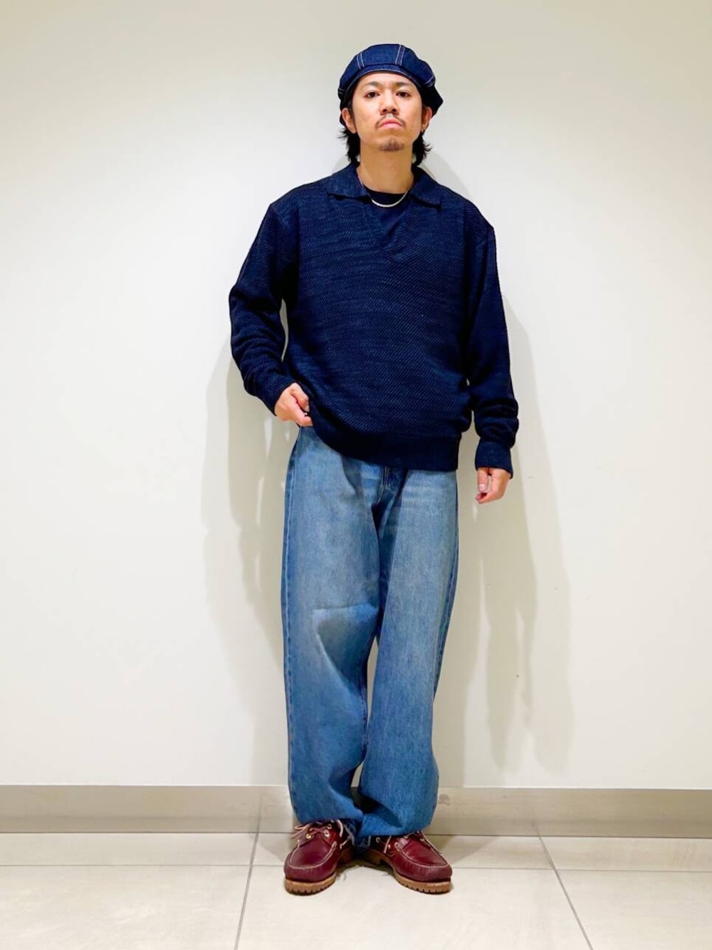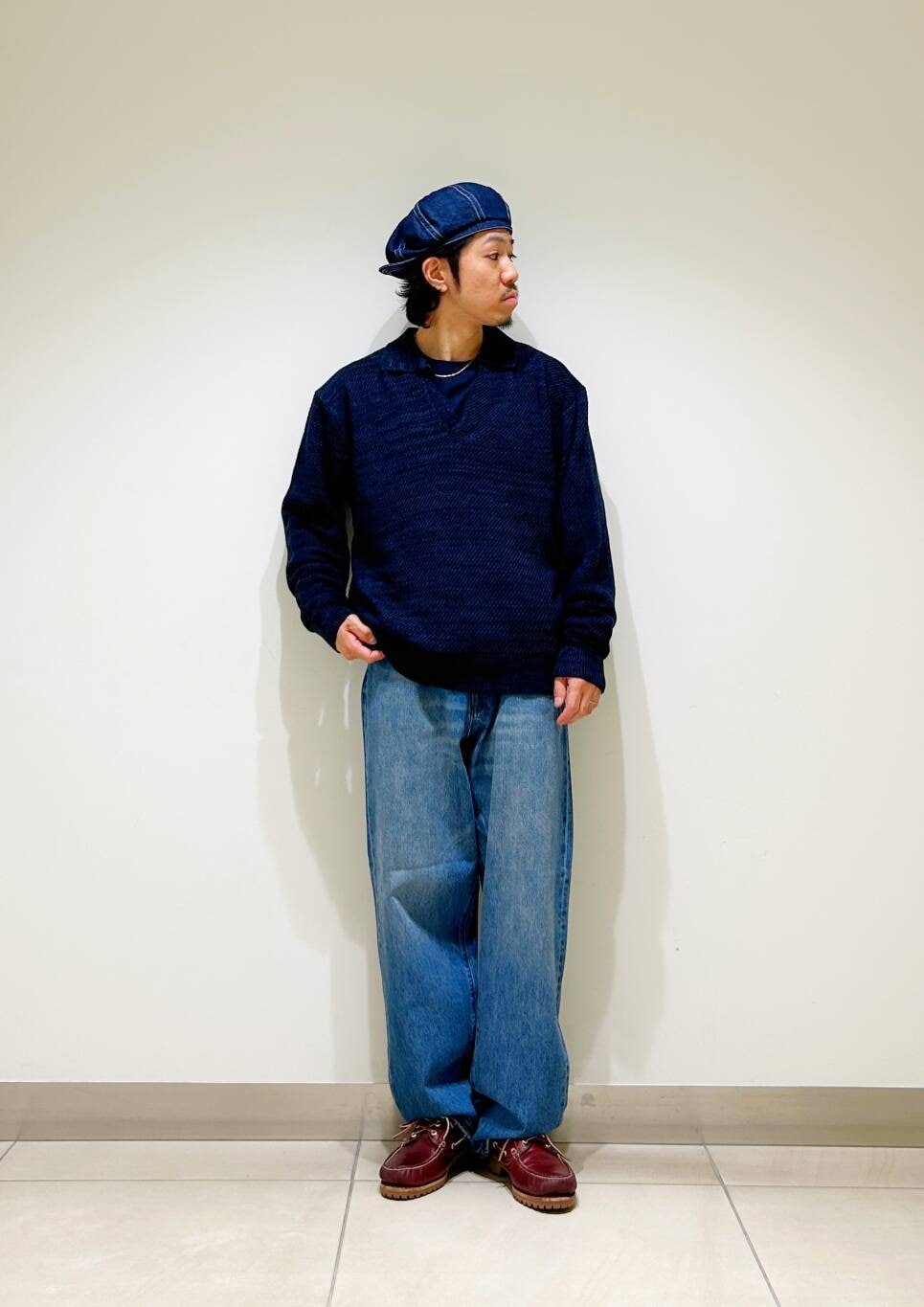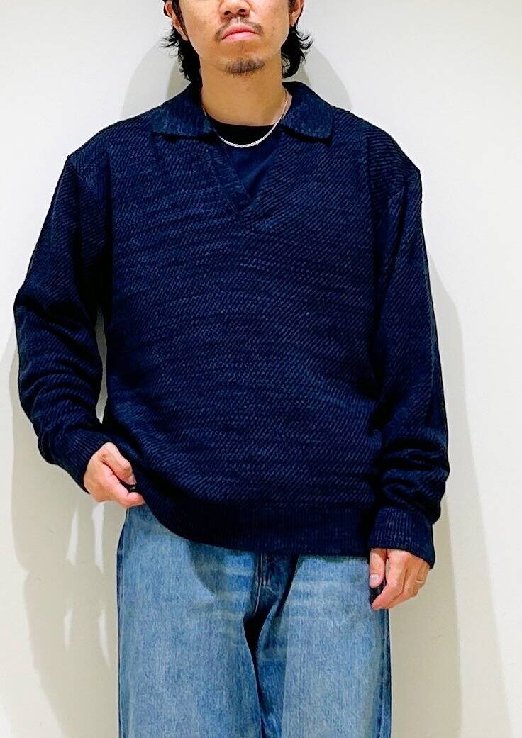 今回はWAGAMI スキッパー ニット ポロシャツとデニムパンツを使用したコーディネート。