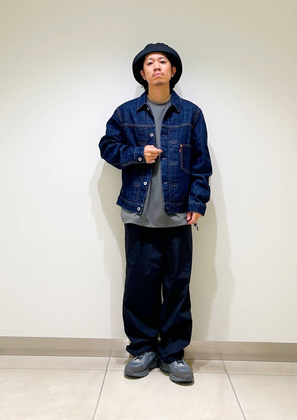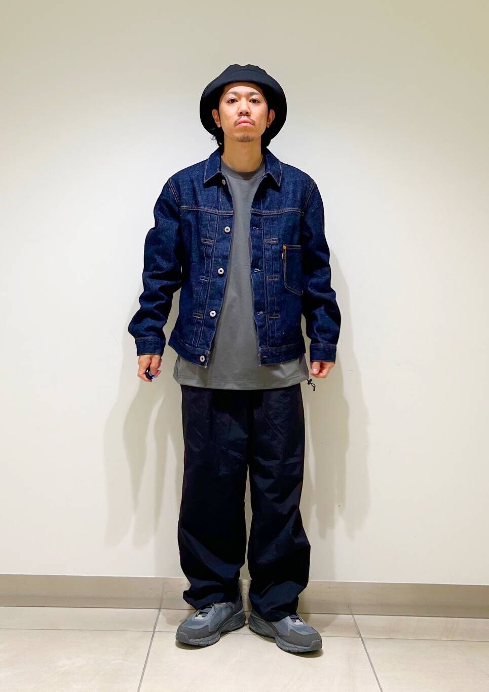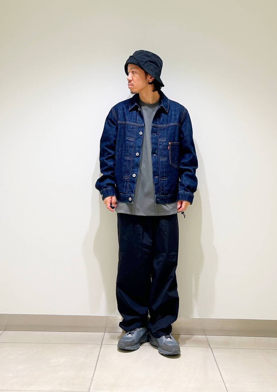 今回はリーバイスデニムジャケットとurdナイロンイージーパンツを使用したコーディネート。