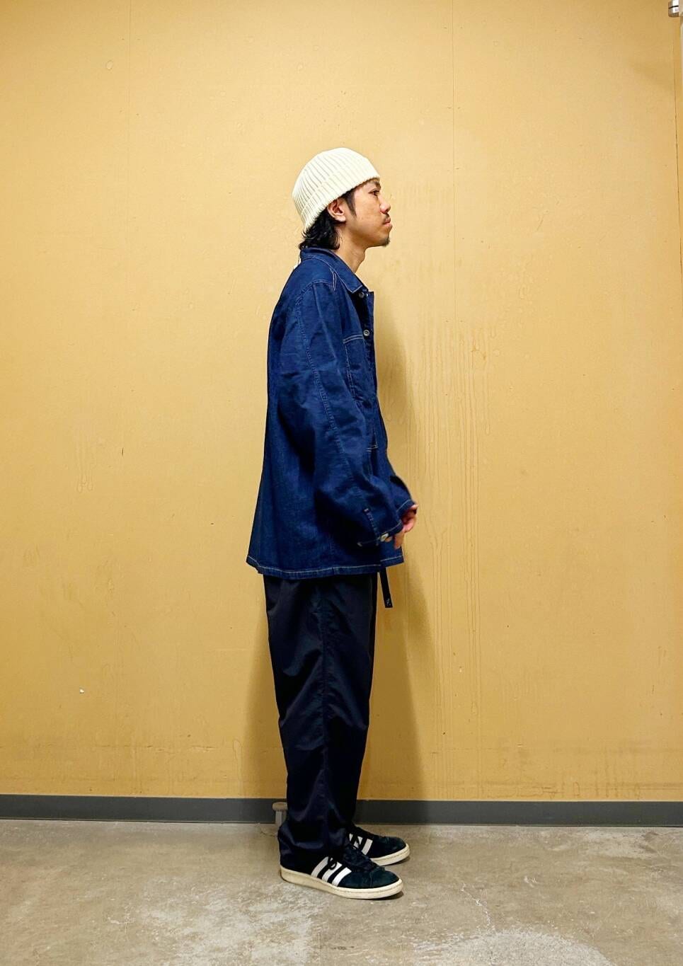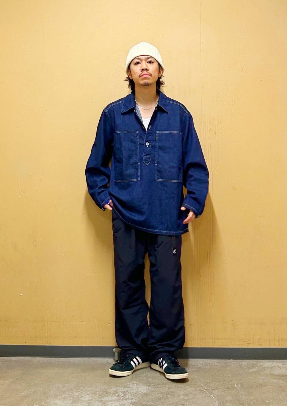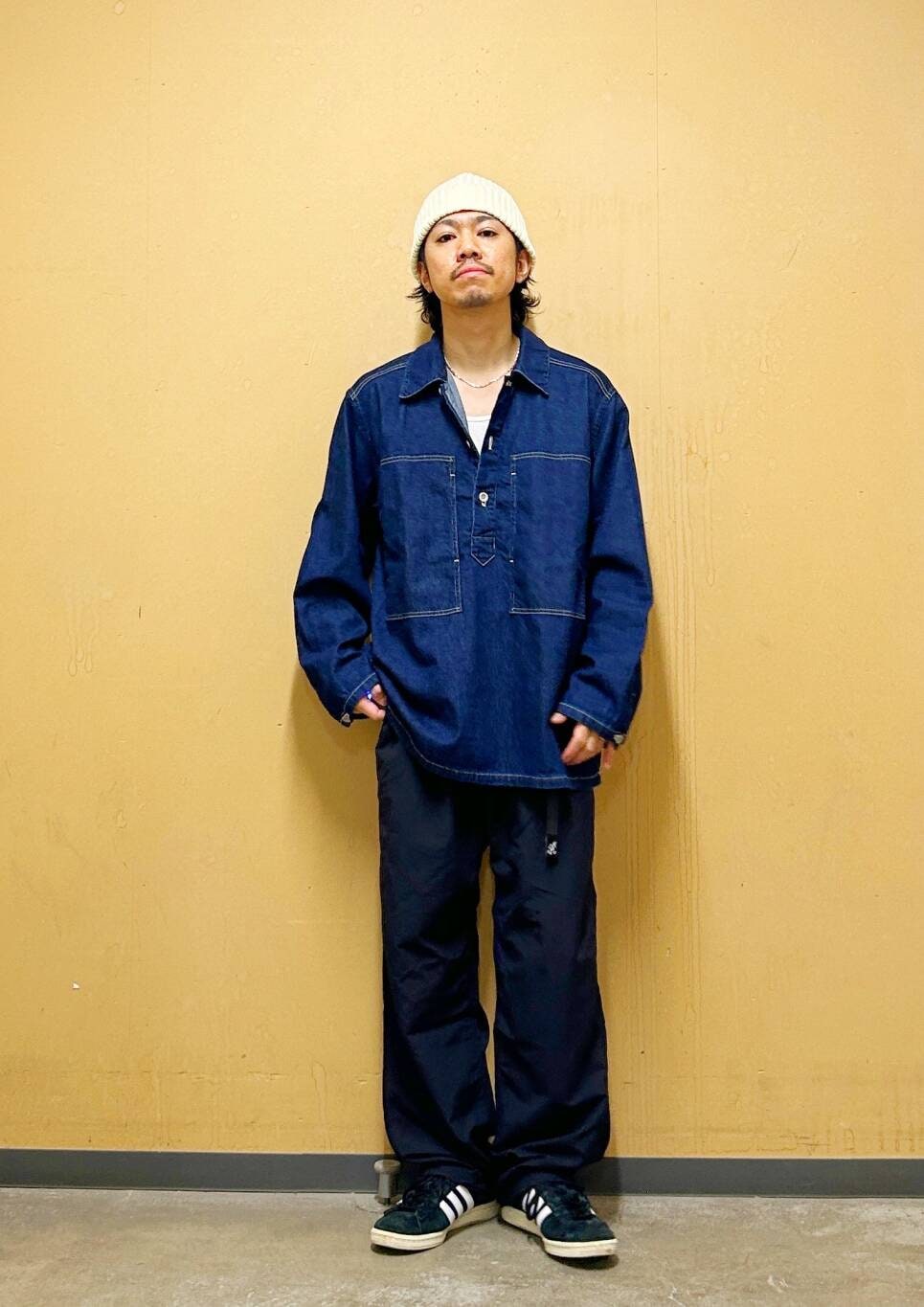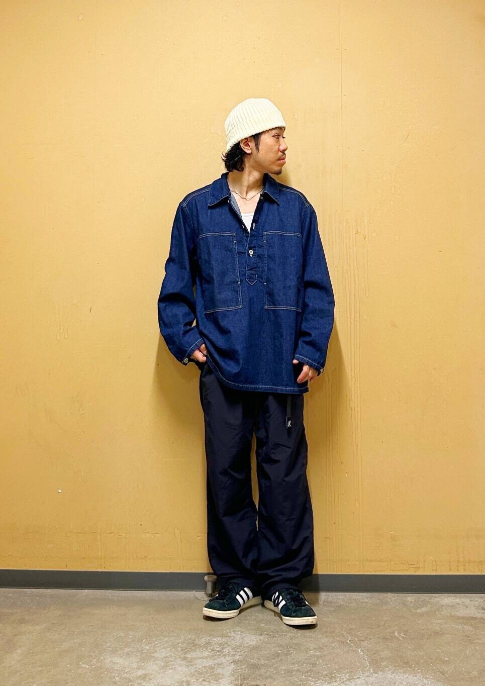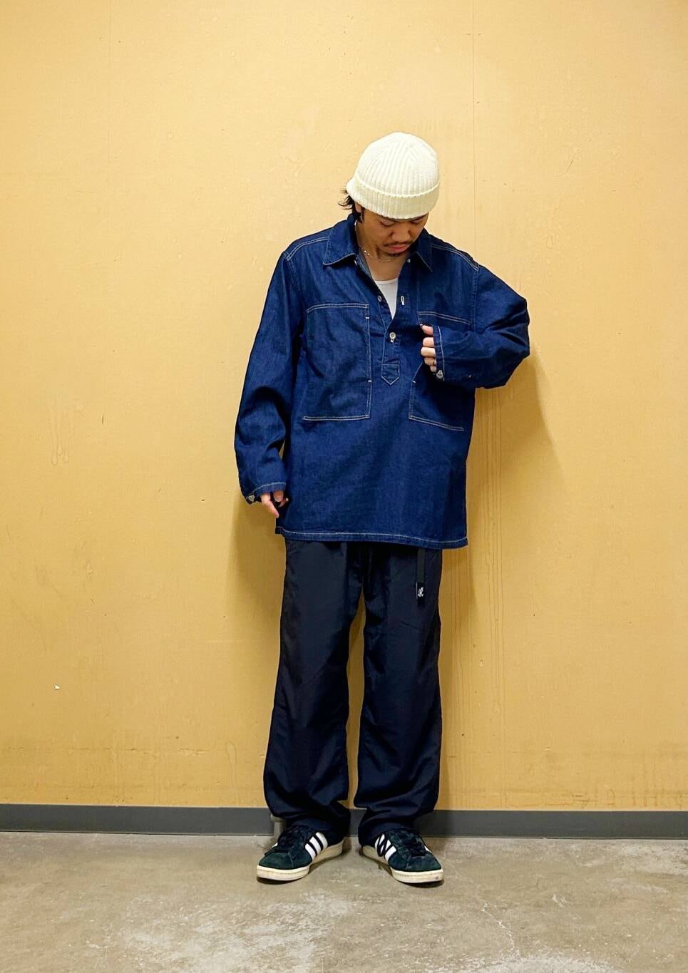 今回はblurhmsROOTSTOCK Light oz Denim Pullover Jacketとグラミチトラックパンツを使用したコーディネート。