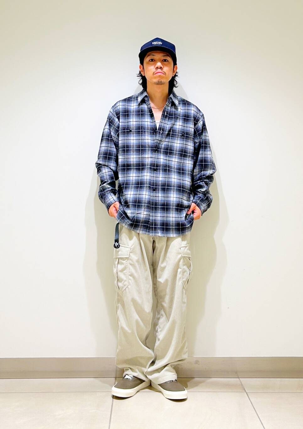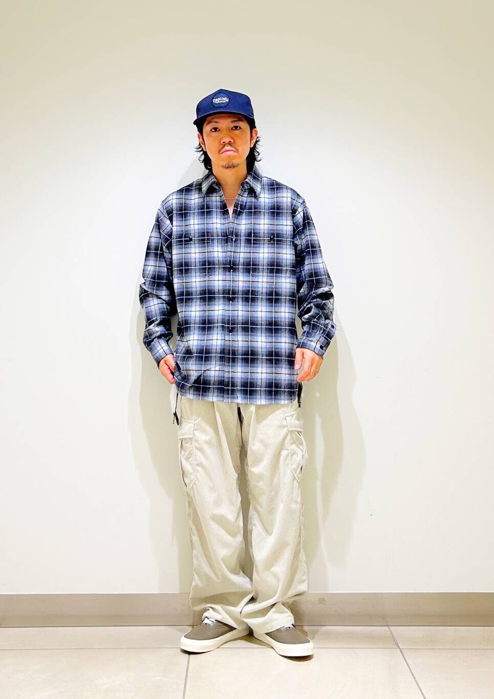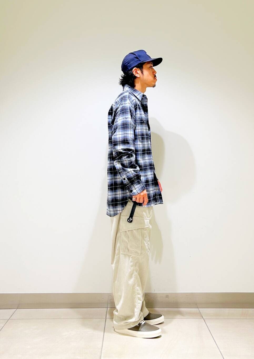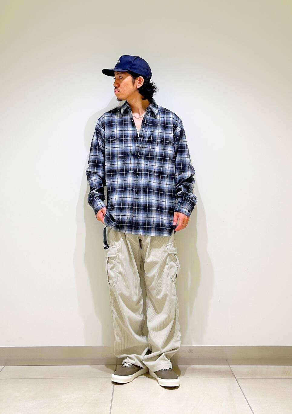 今回はペンドルトン別注チェックシャツとストーンマスター別注コーデュロイカーゴパンツを使用したコーディネート。