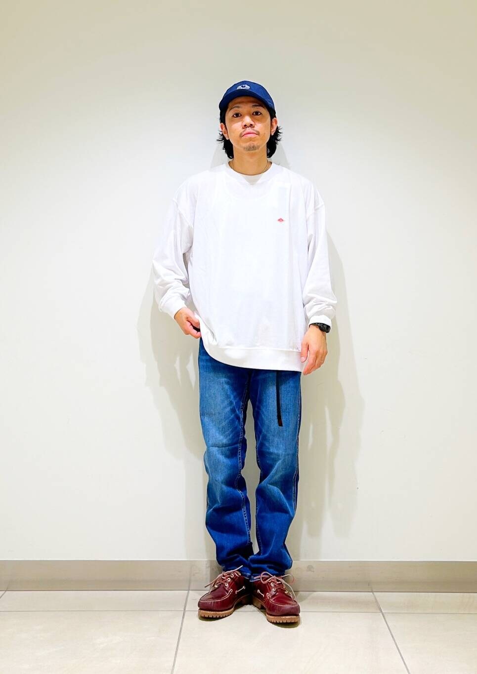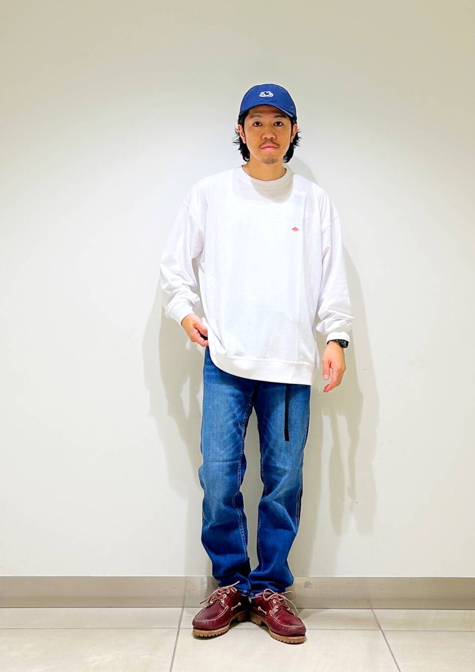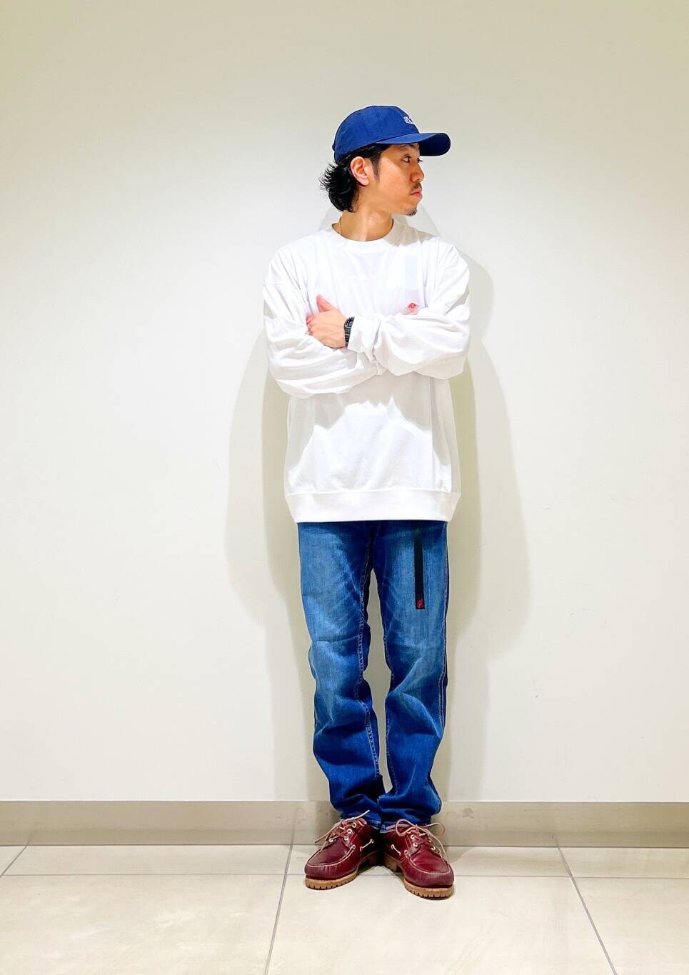 今回はDANTONスウェットロンTとグラミチ別注デニムパンツを使用したコーディネート。