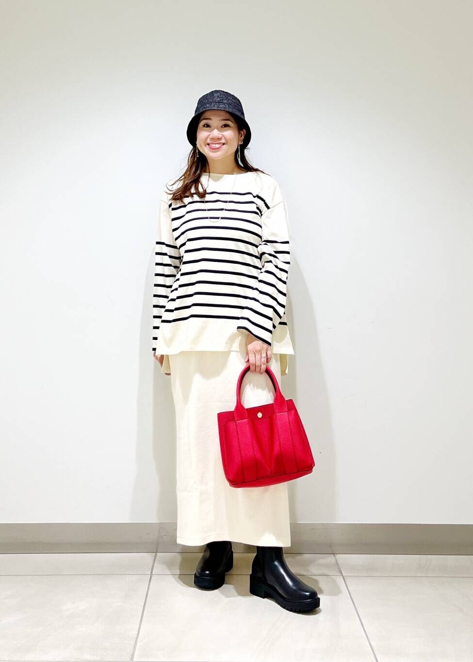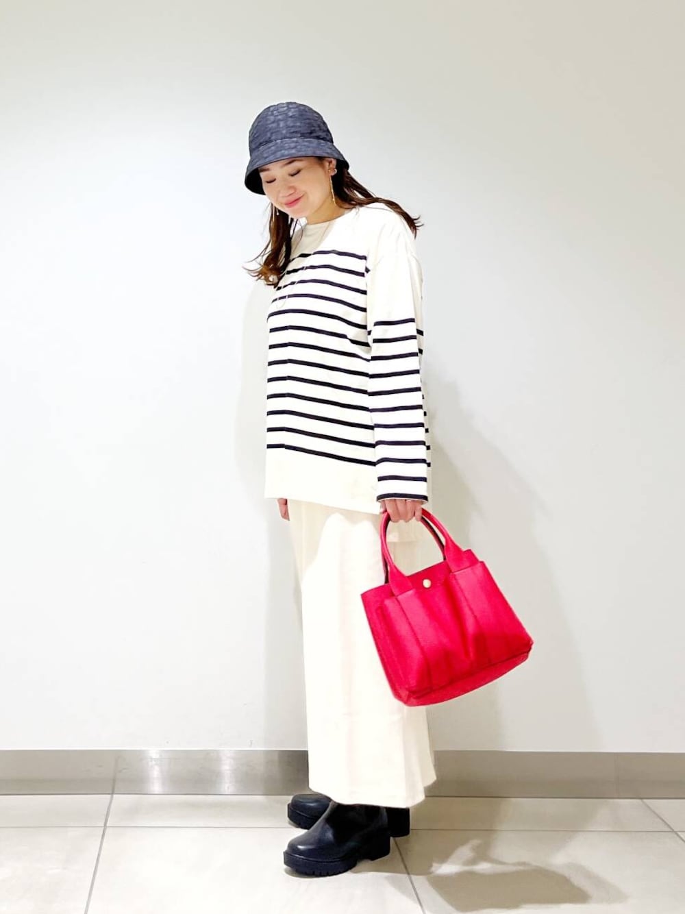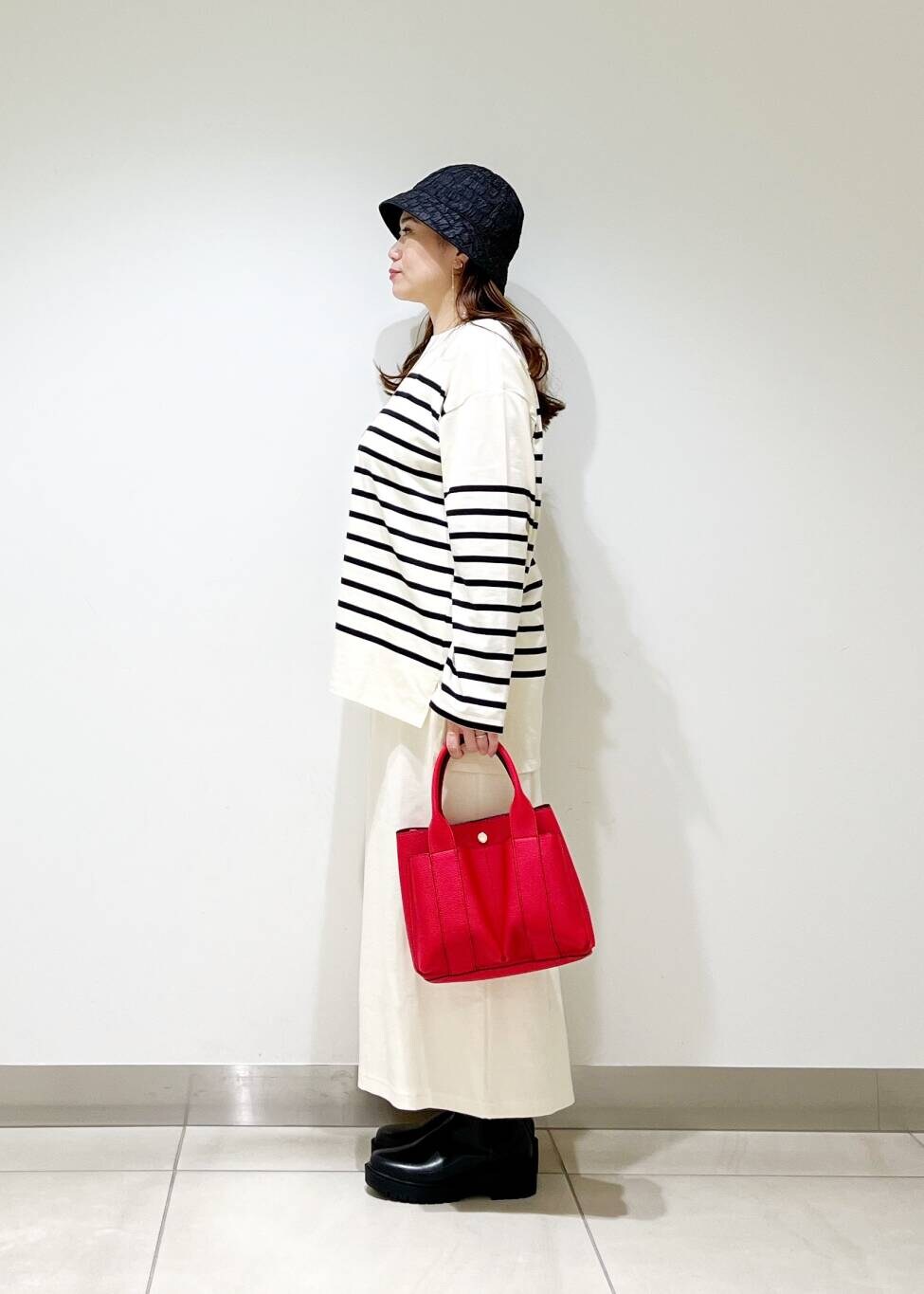モノトーンのスタイリングだったので、パッと目に入る赤いバッグを選びました☆