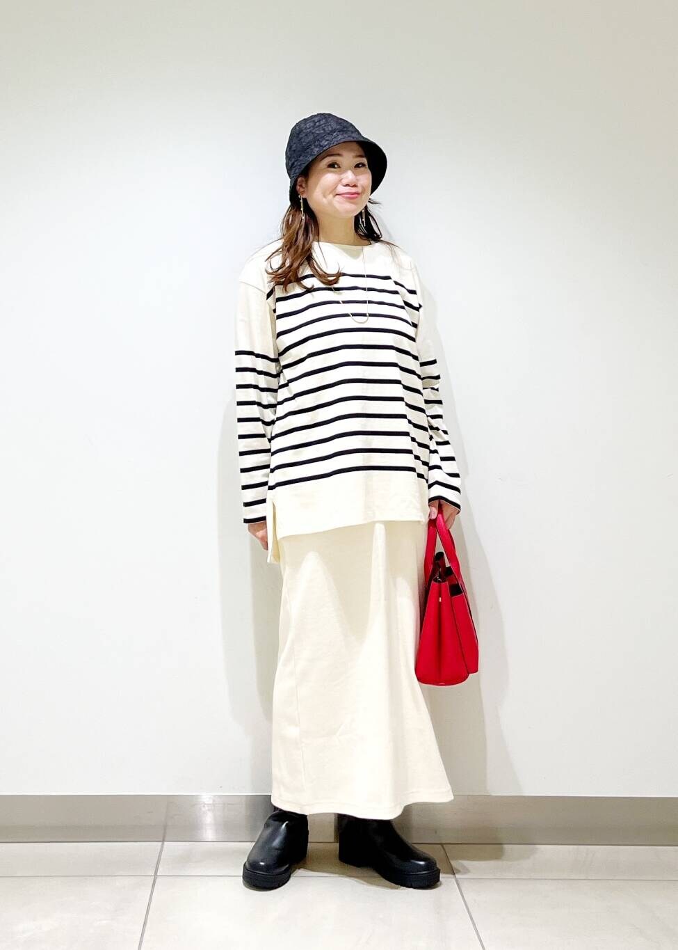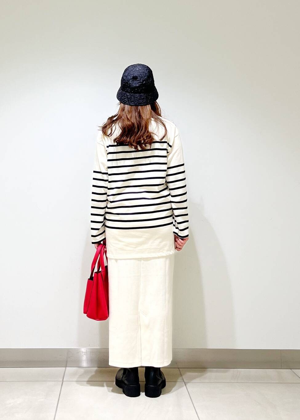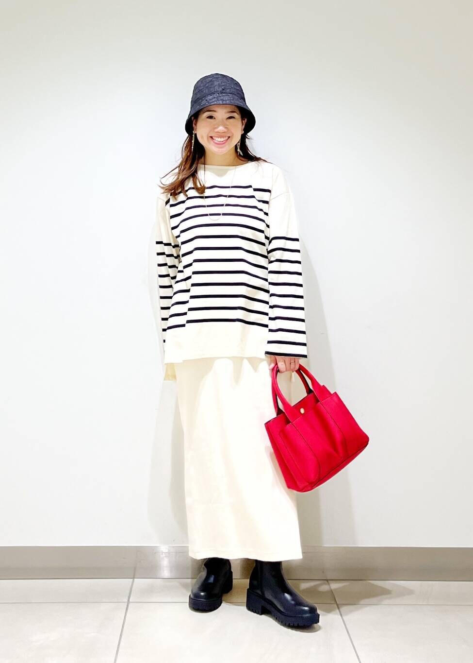 モノトーンのスタイリングだったので、パッと目に入る赤いバッグを選びました☆
