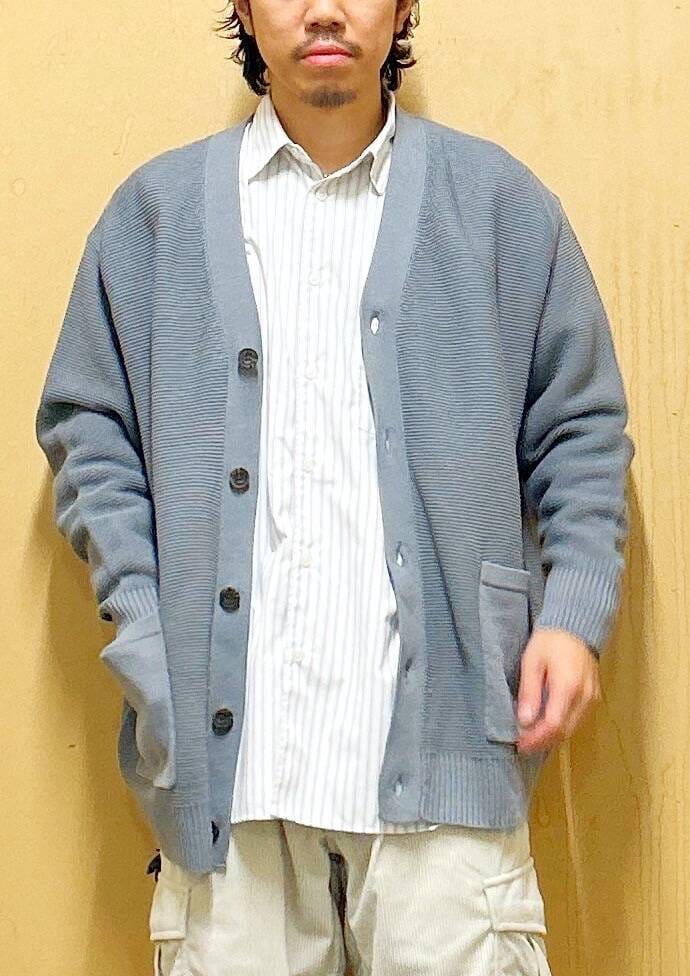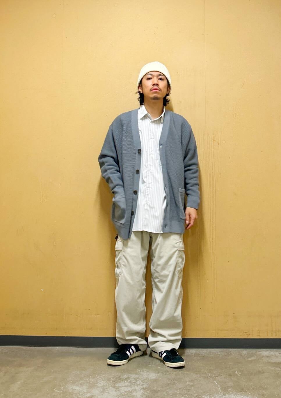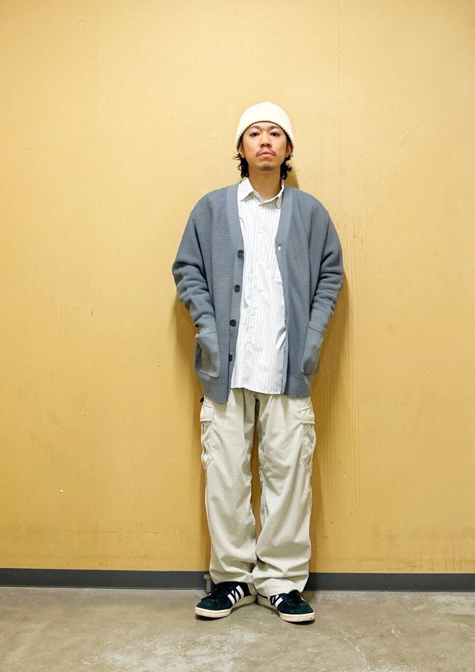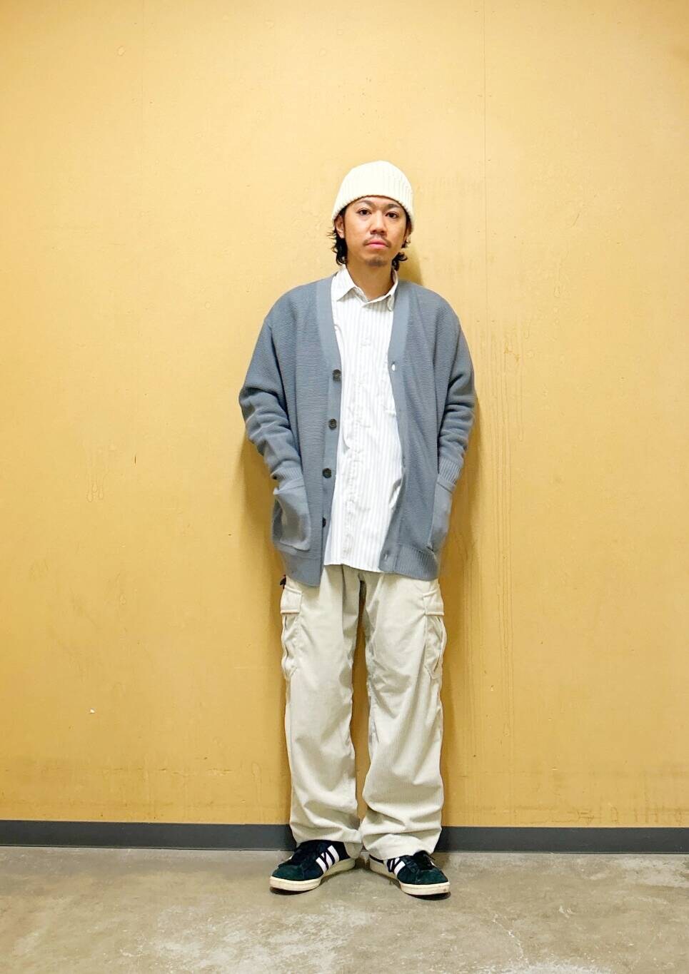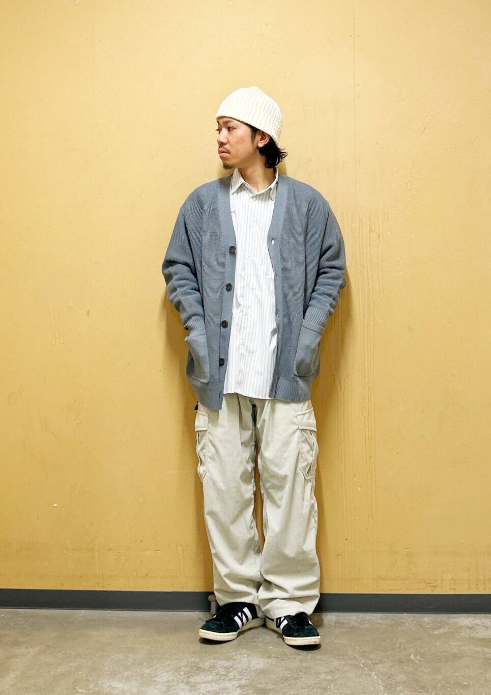 今回はハードニットカーディガンとSTONEMASTER×ROKX×DOORS TERRAIN CARGO PANTSを使用したコーディネート。