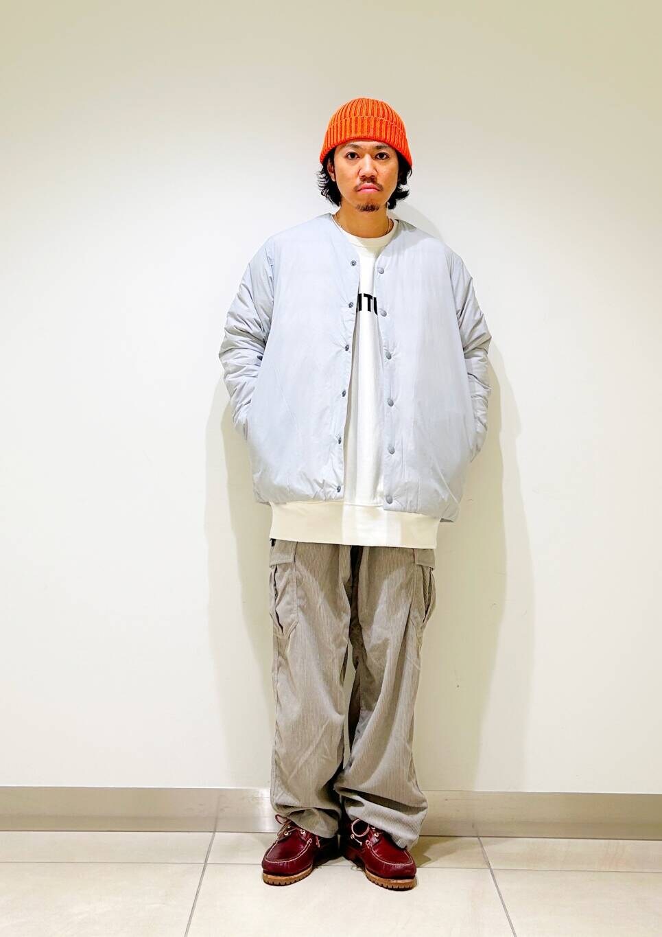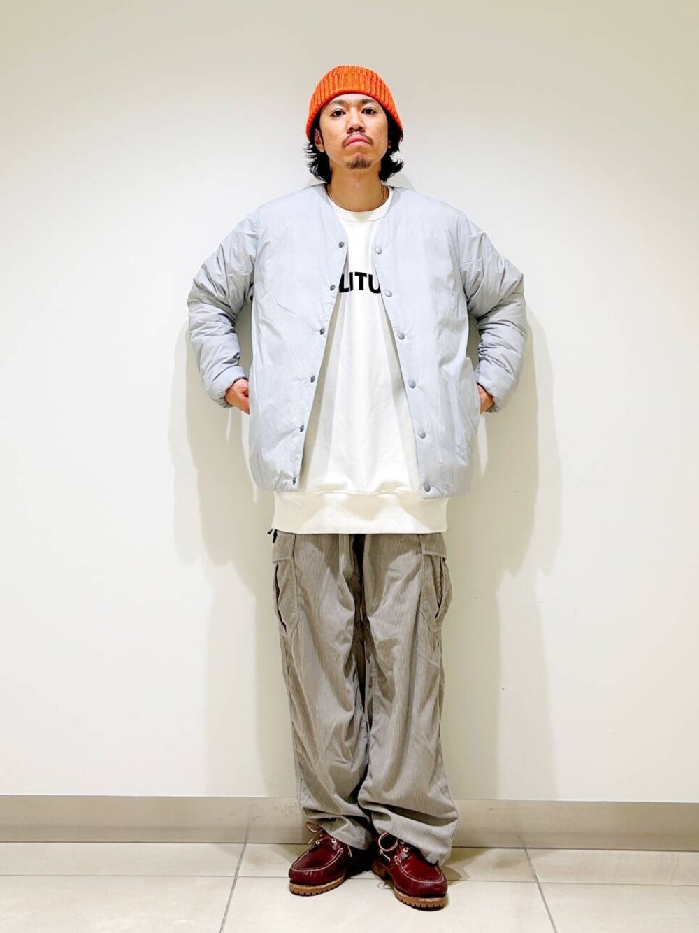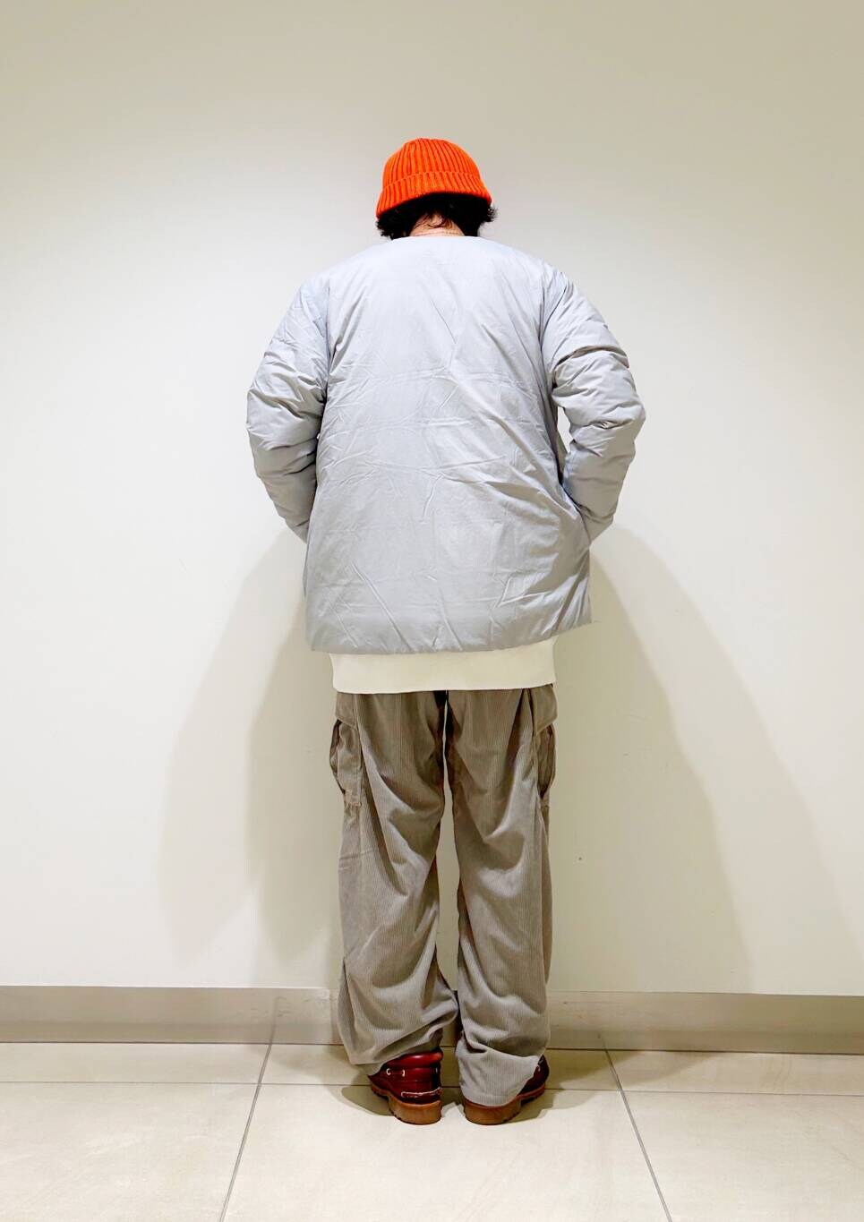 今回はnangaノーカラーダウンブルゾンとクルーネックスウェットを使用したコーディネート。
