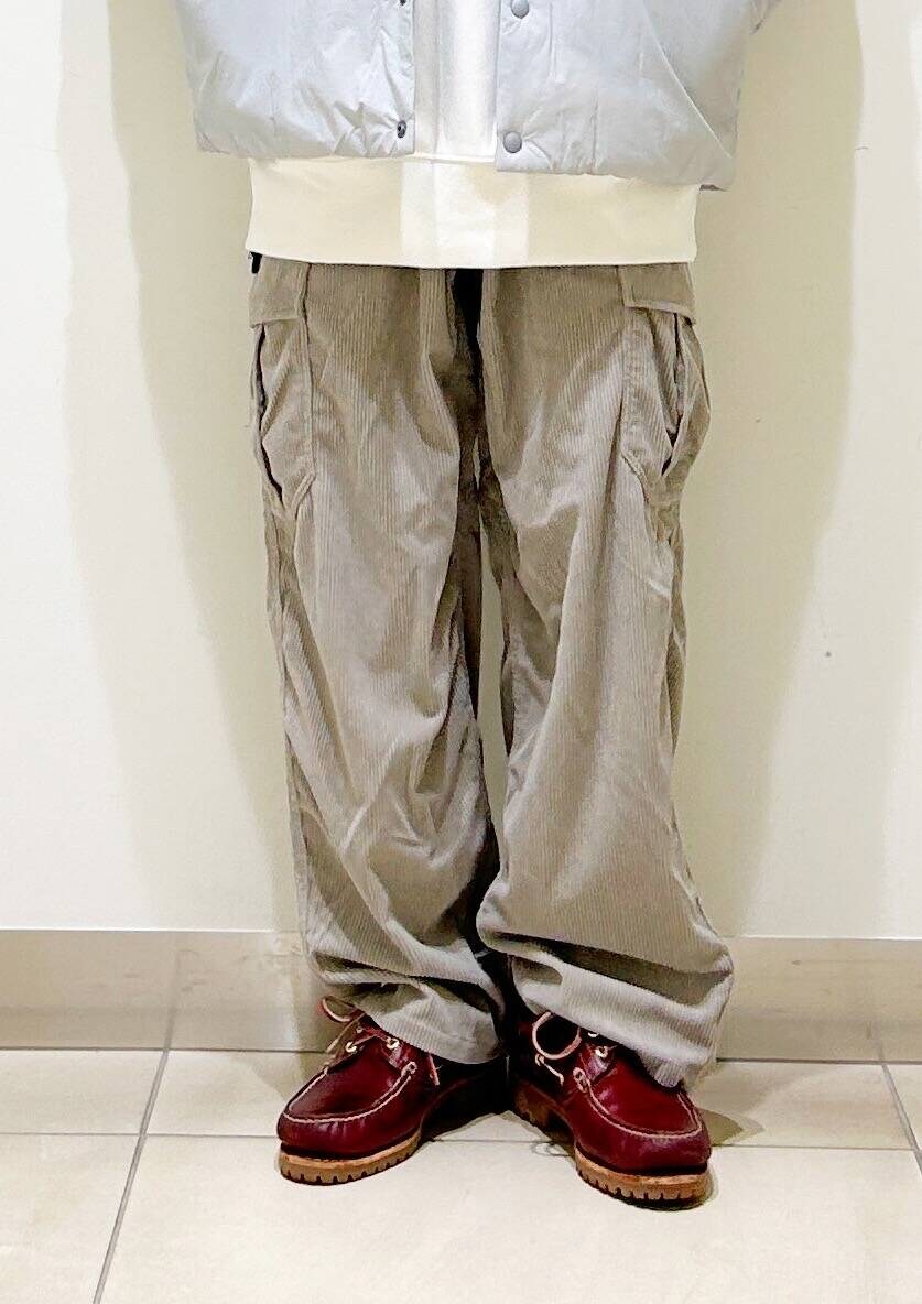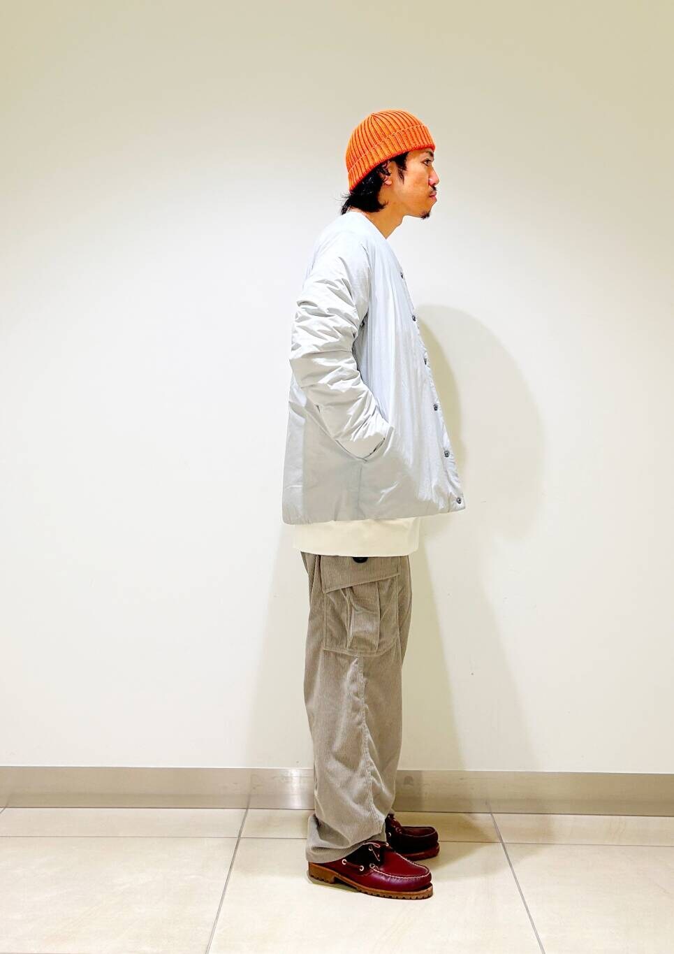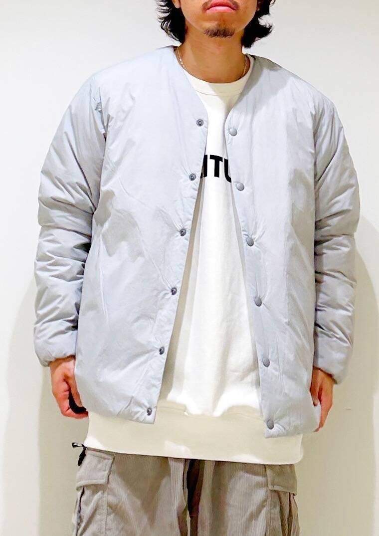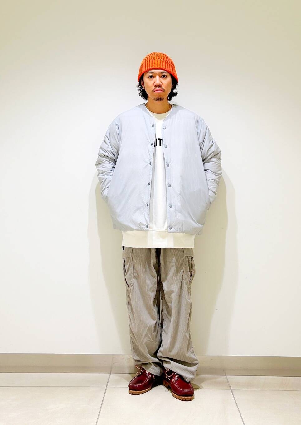 今回はnangaノーカラーダウンブルゾンとクルーネックスウェットを使用したコーディネート。