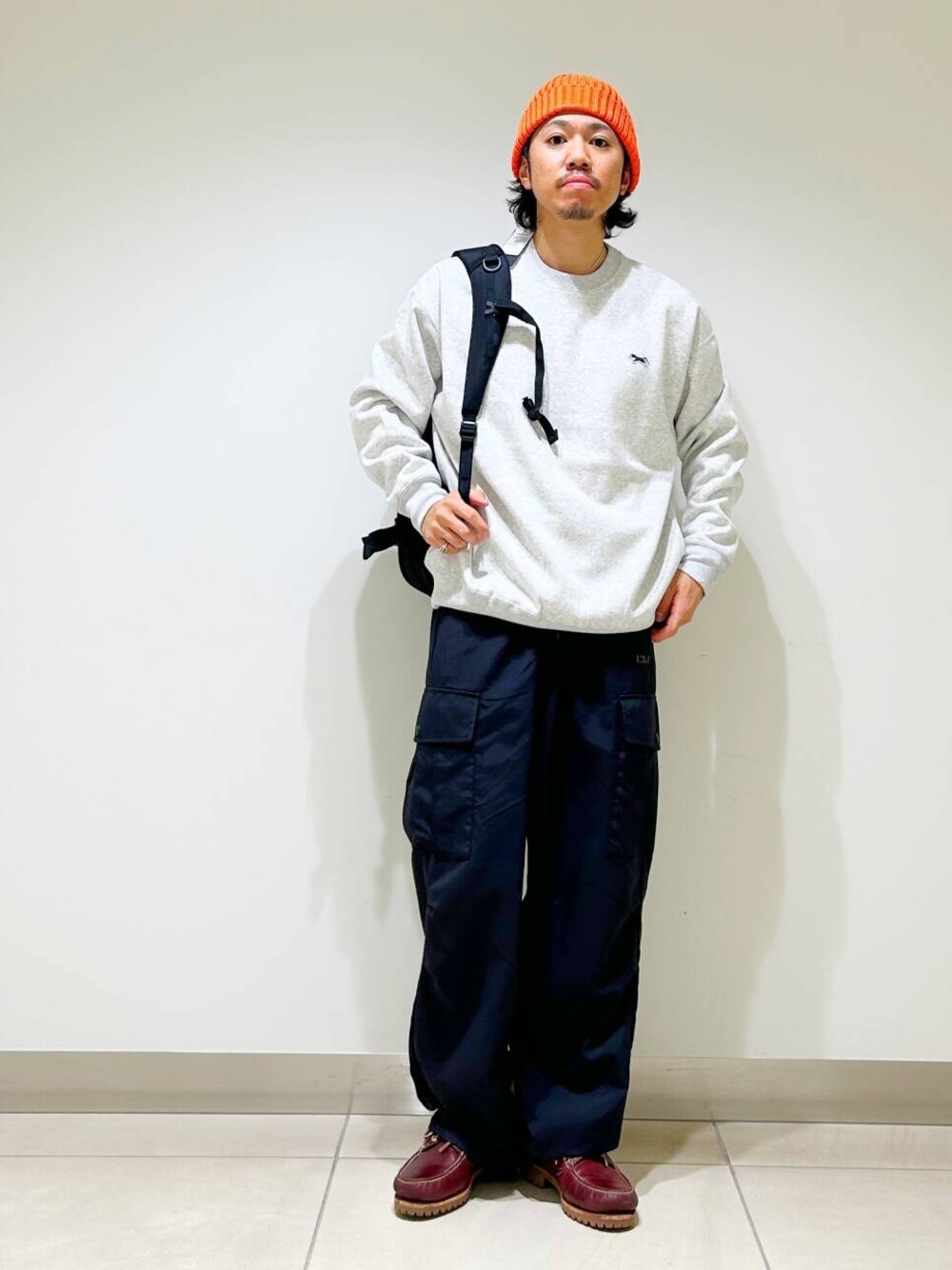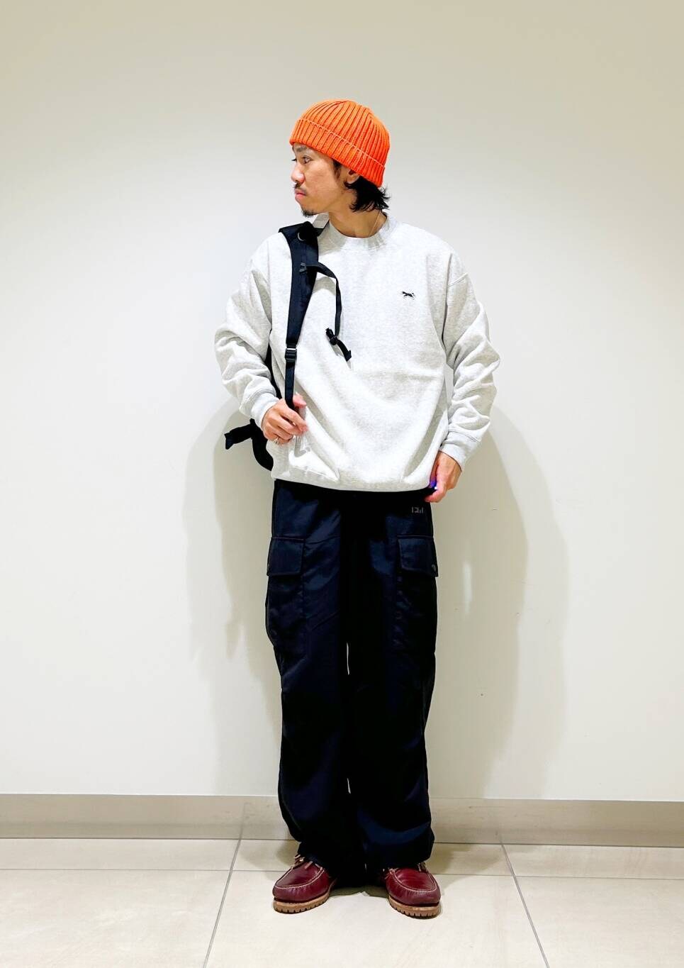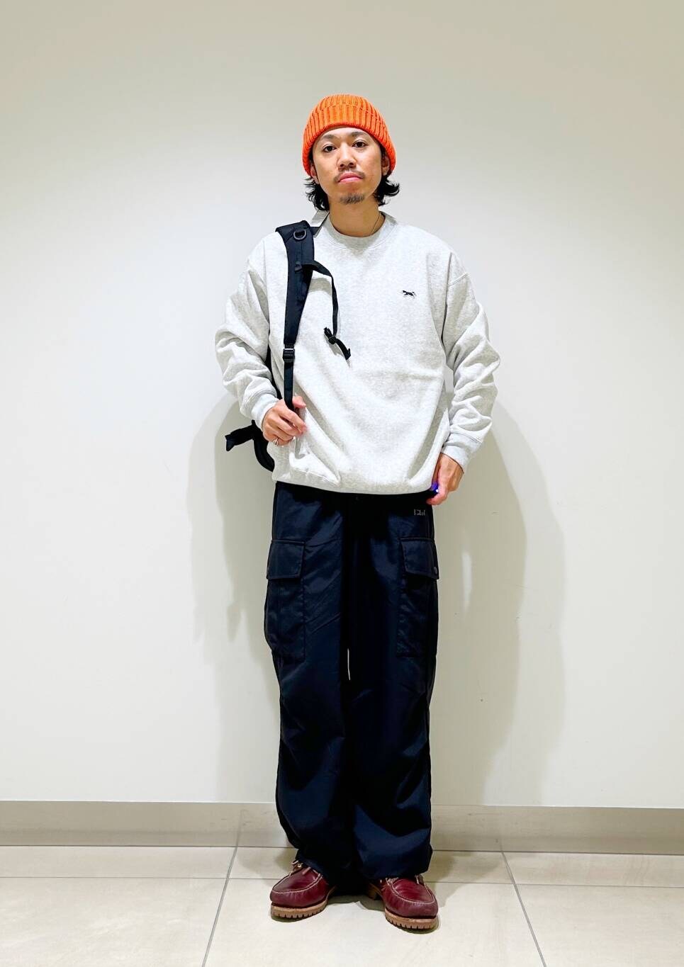 今回はfoxスウェットとwaq別注カーゴパンツを使用したコーディネート。