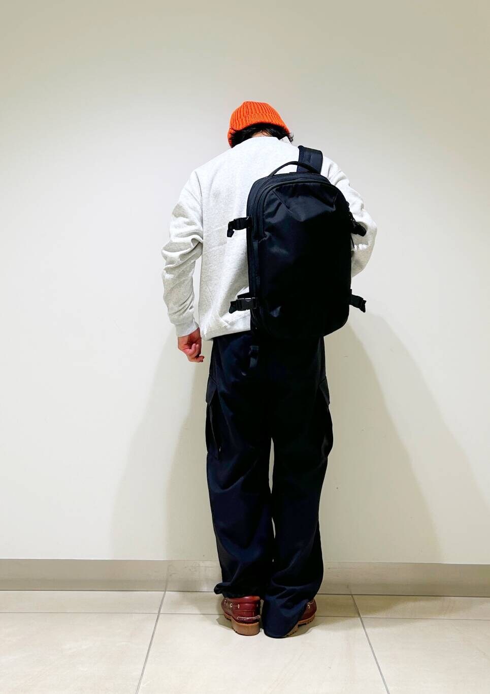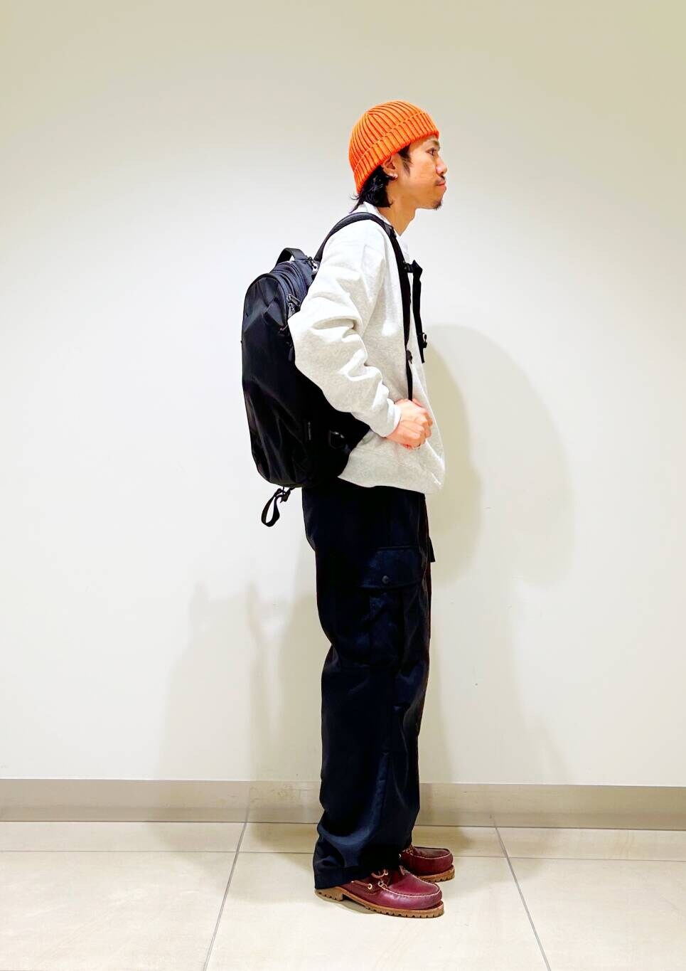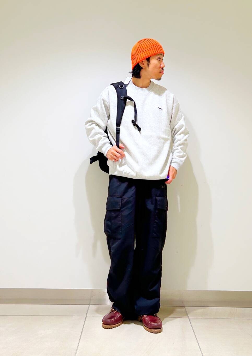 今回はfoxスウェットとwaq別注カーゴパンツを使用したコーディネート。