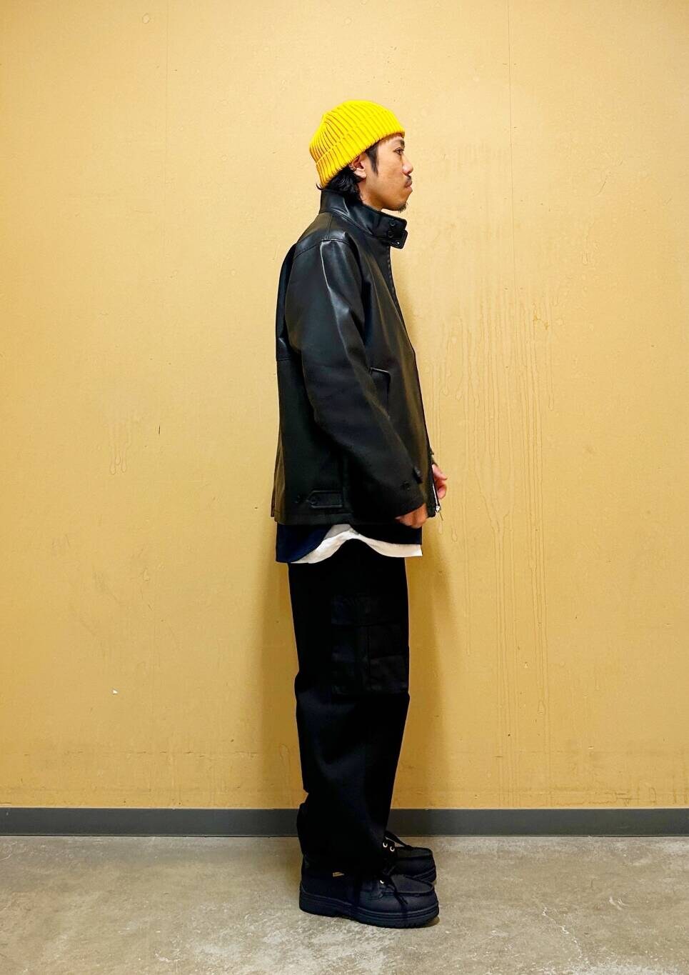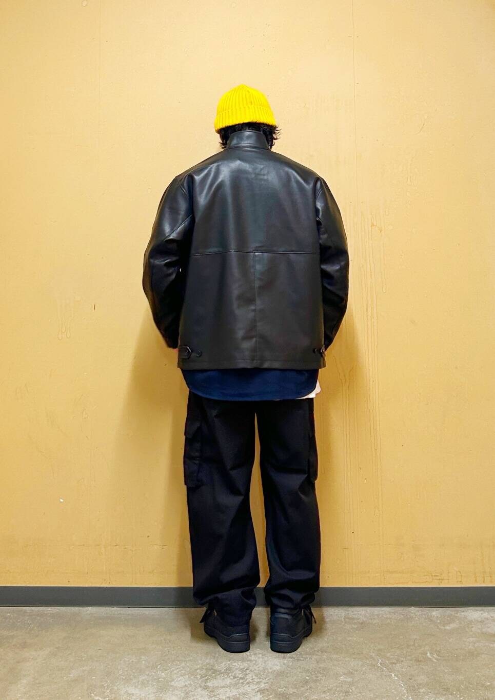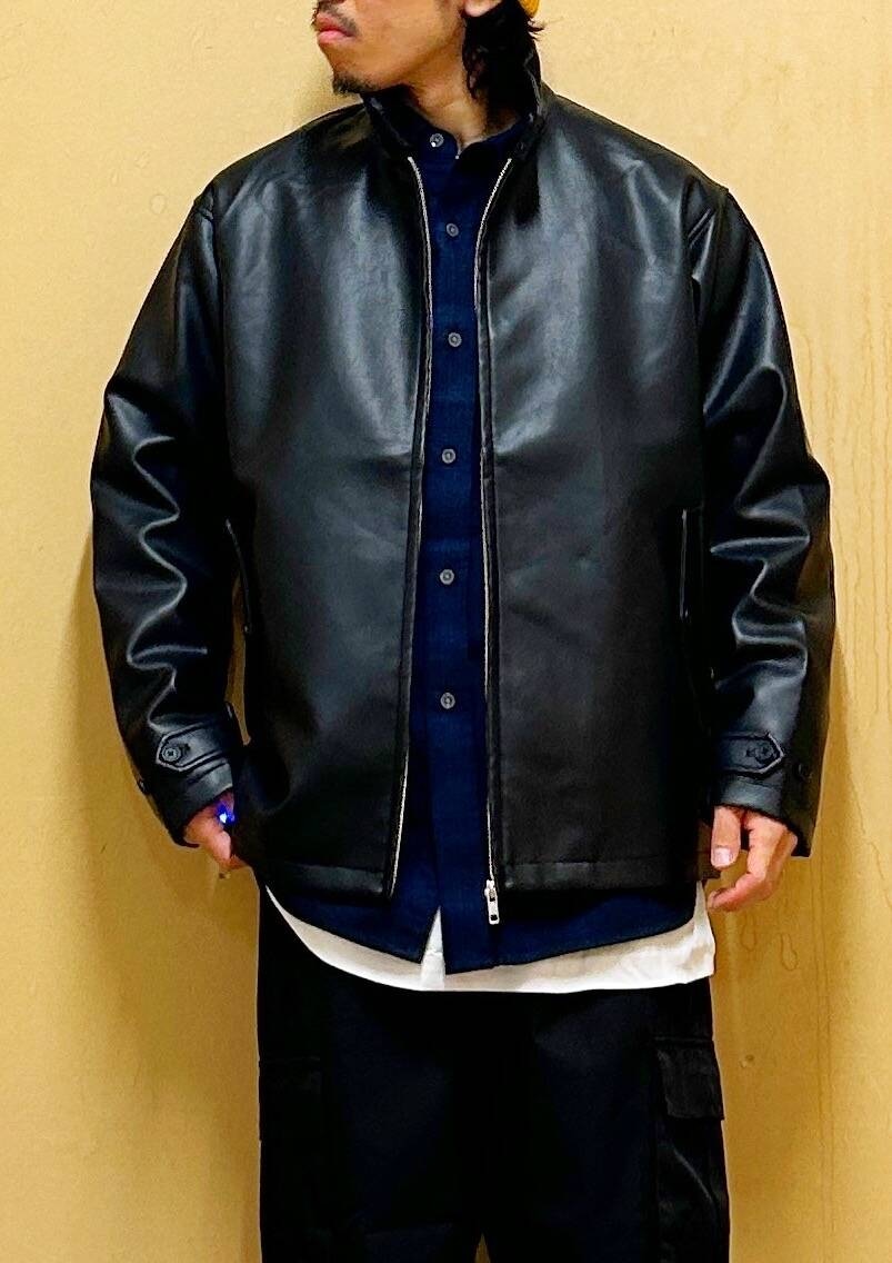 ラムレザー風のフェイクレザーを使用しており、程よい光沢感と肉厚に加え、柔らかな着心地が魅力の一着。