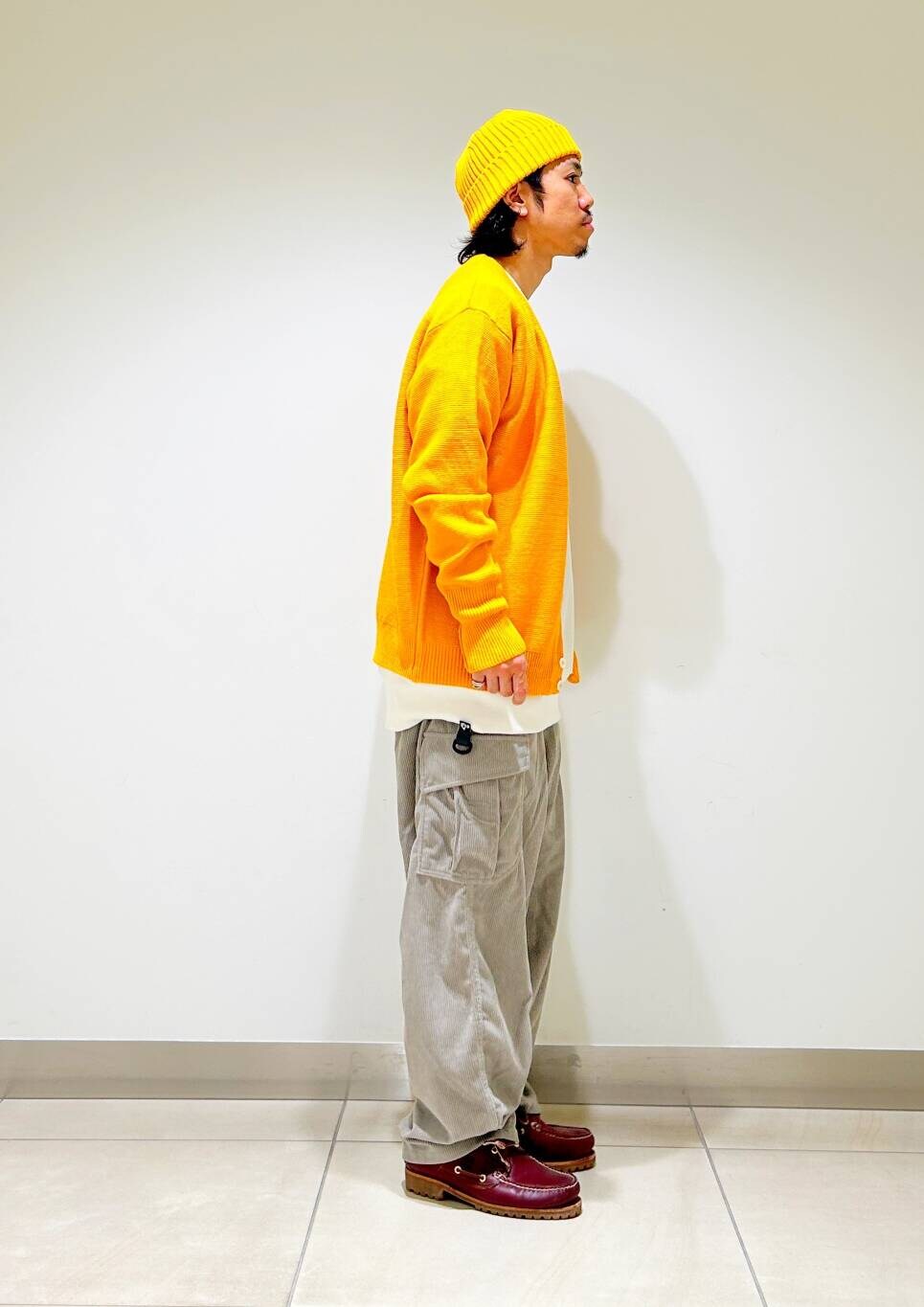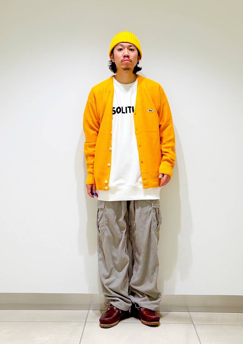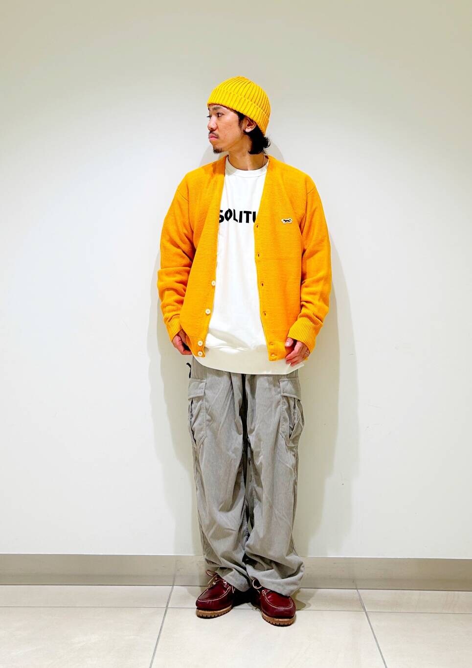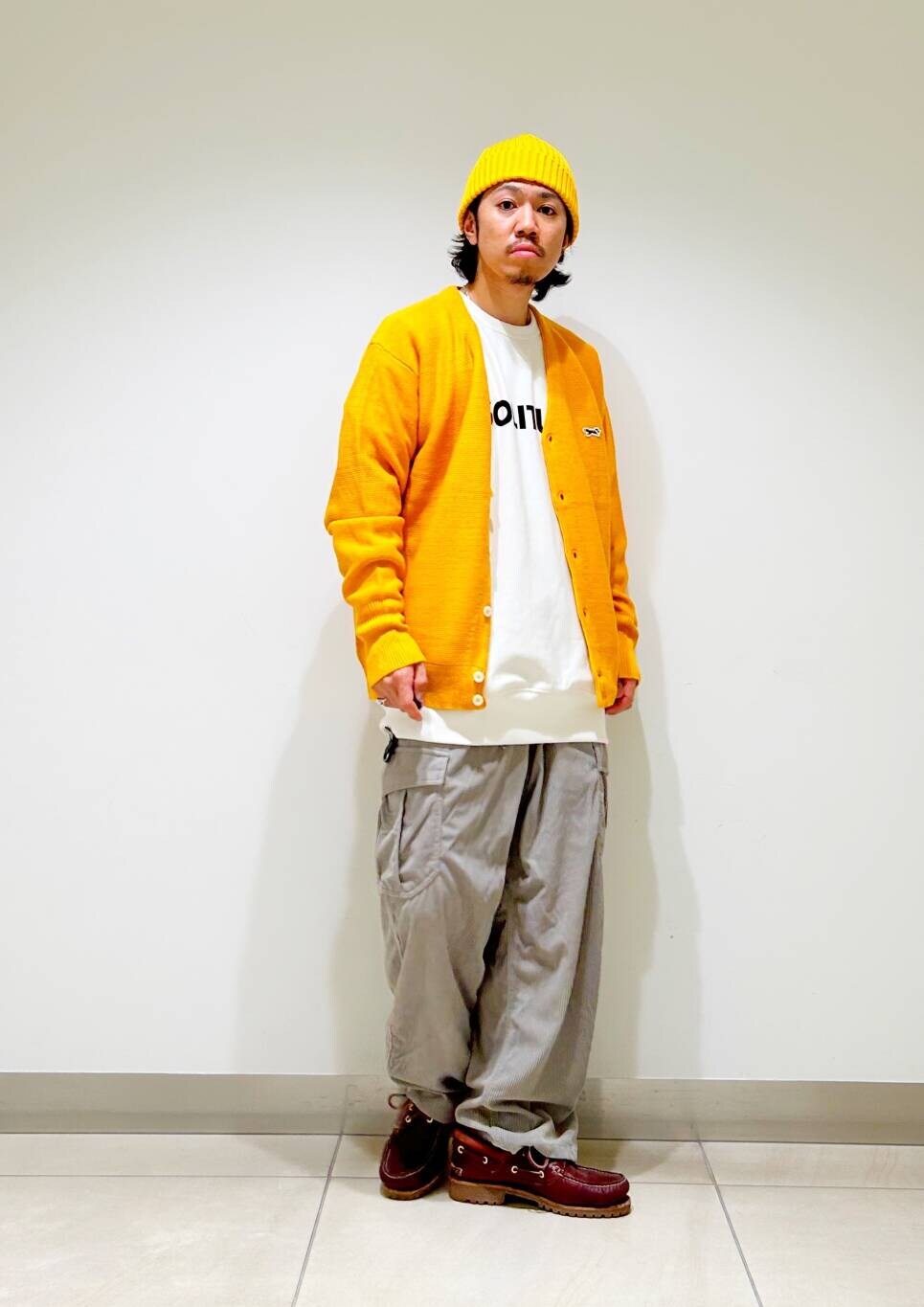 今回はfoxカーディガンとSTONEMASTER×ROKX×DOORS TERRAIN CARGO PANTSを使用したコーディネート。