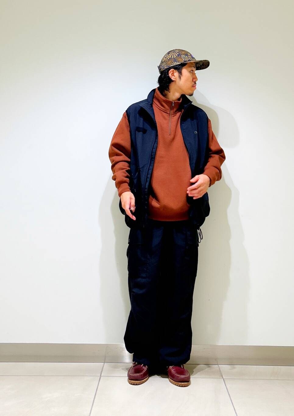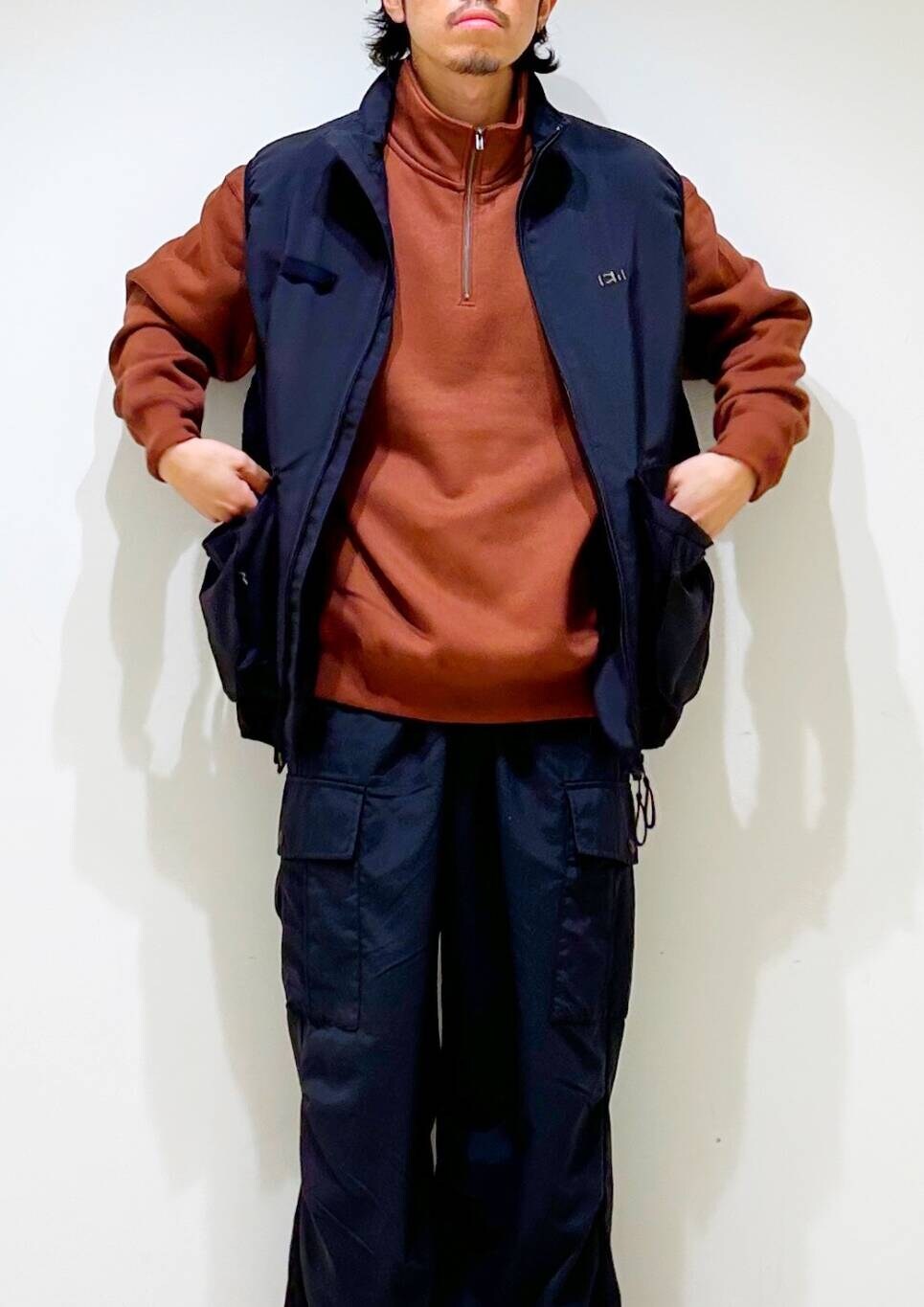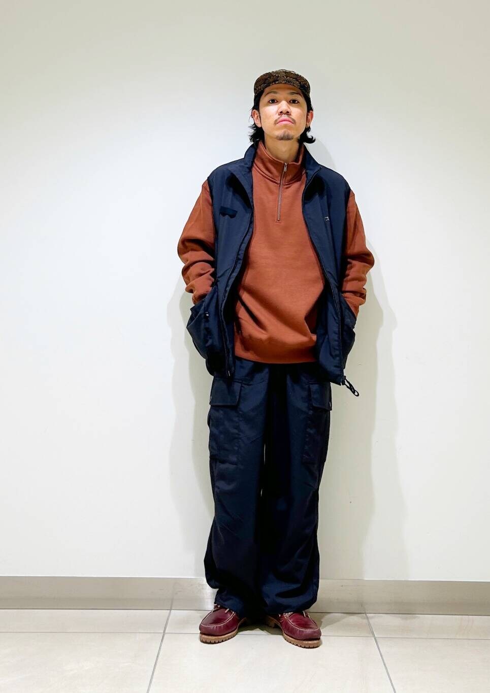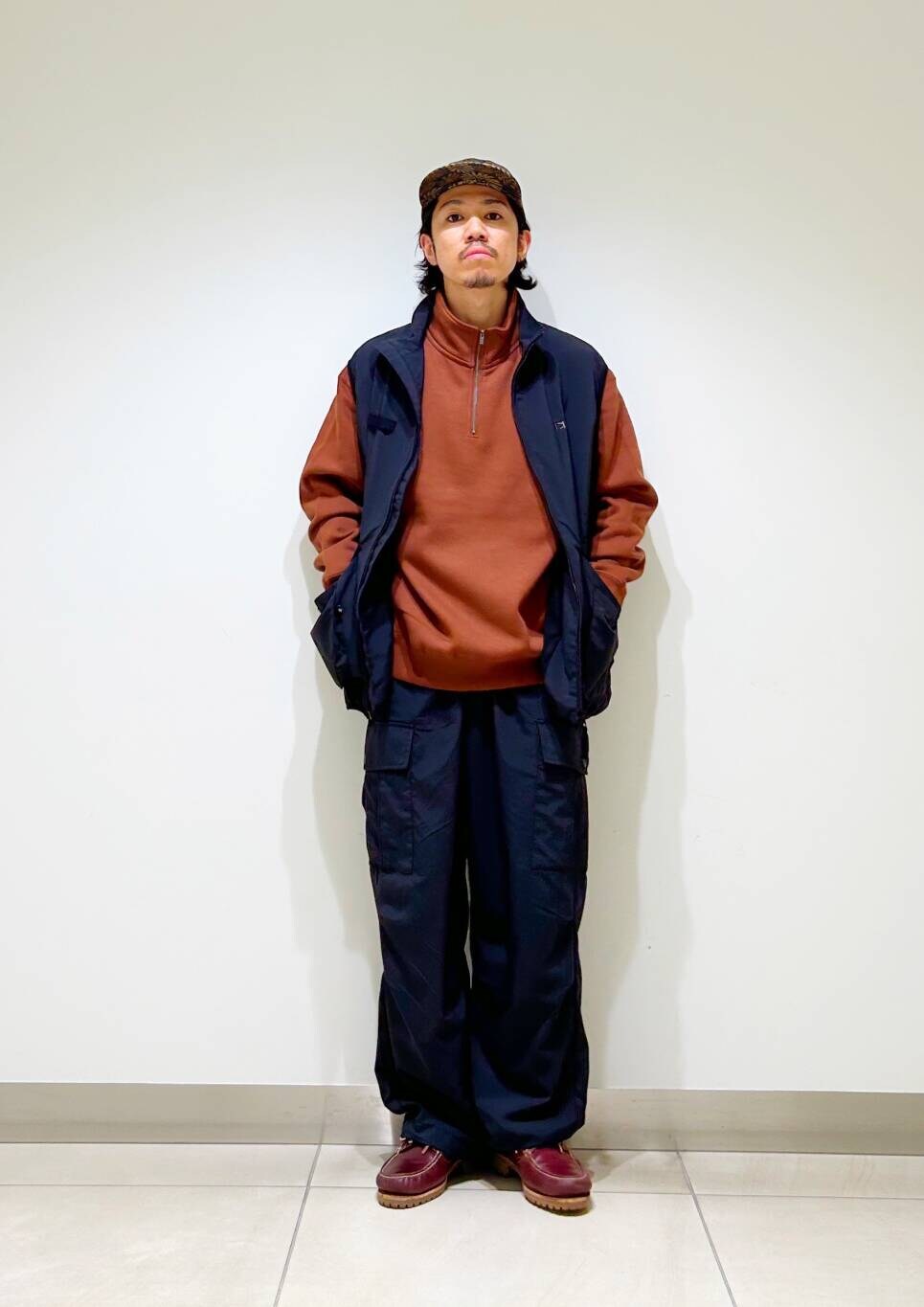 今回はwaq別注ベストとfoxハーフジップスウェットを使用したコーディネート。